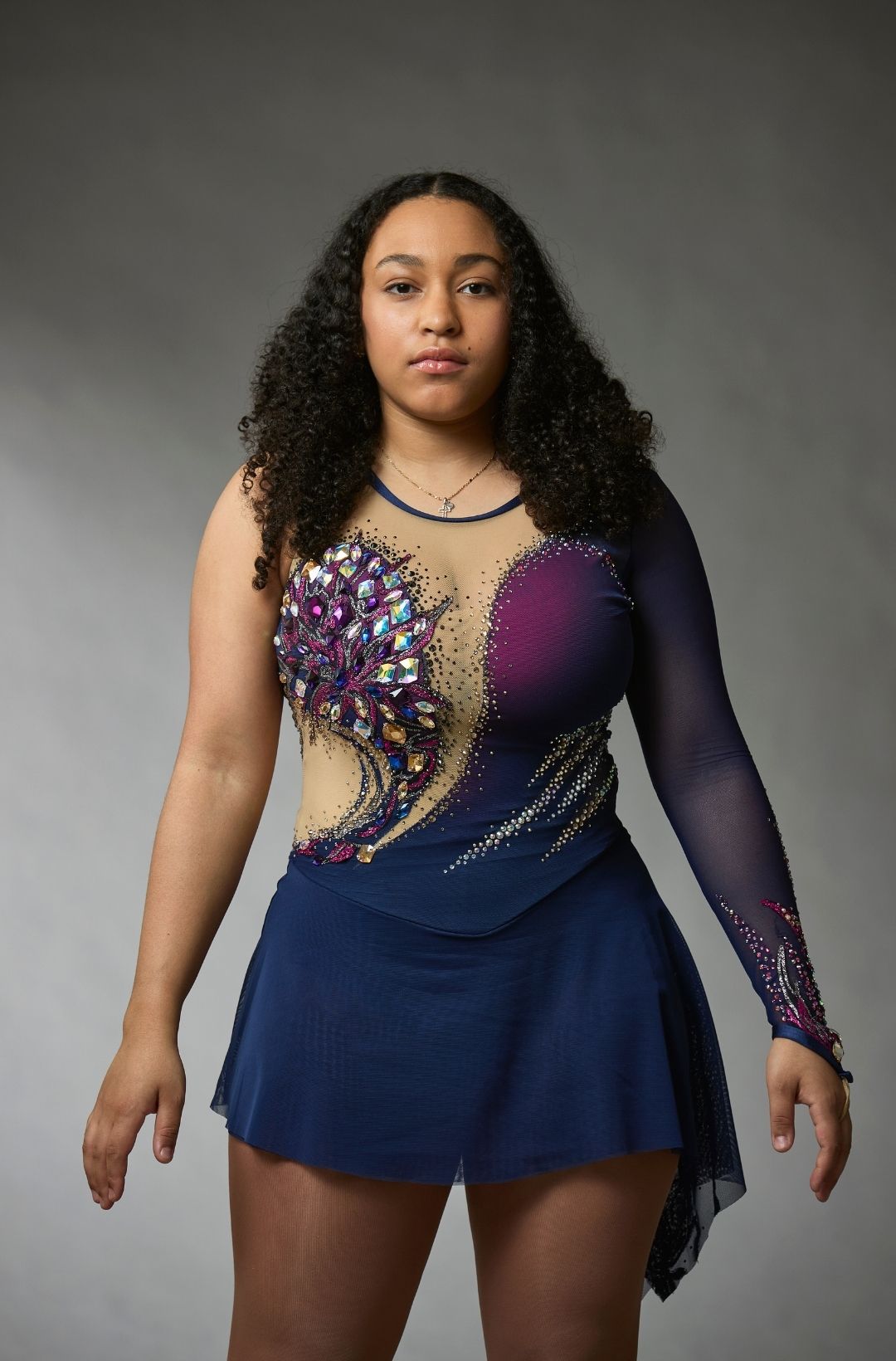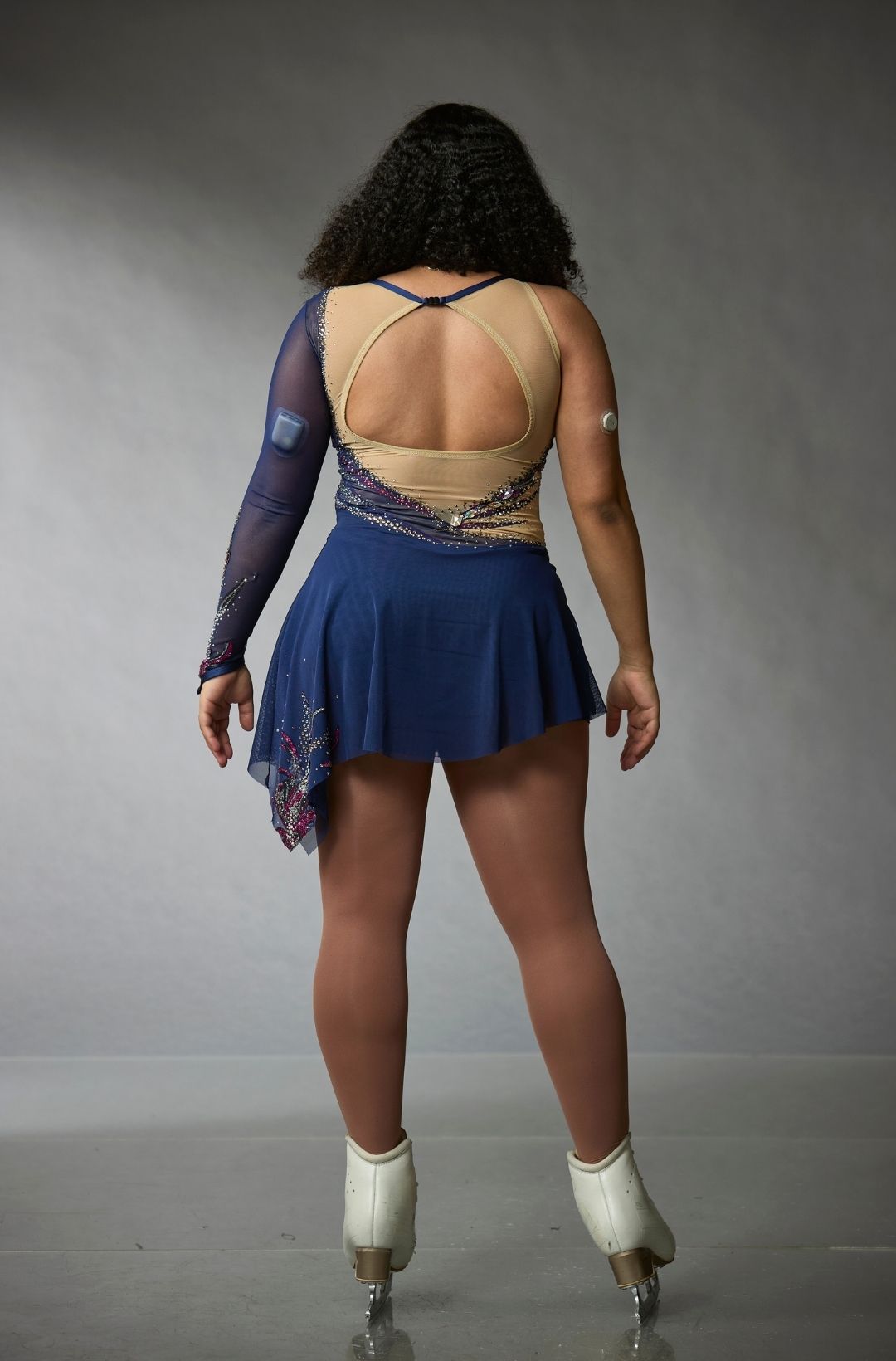 Unique figure skating competition dress adorned with crystals in various sizes and colours. The mesh bodice features a navy-to-pink gradient, and the oblong mesh skirt adds fluidity to the design. The dress has one long mesh sleeve, while the other shoulder is left bare, and the back features an open design. From the One of a Kind collection by Elite Xpression.