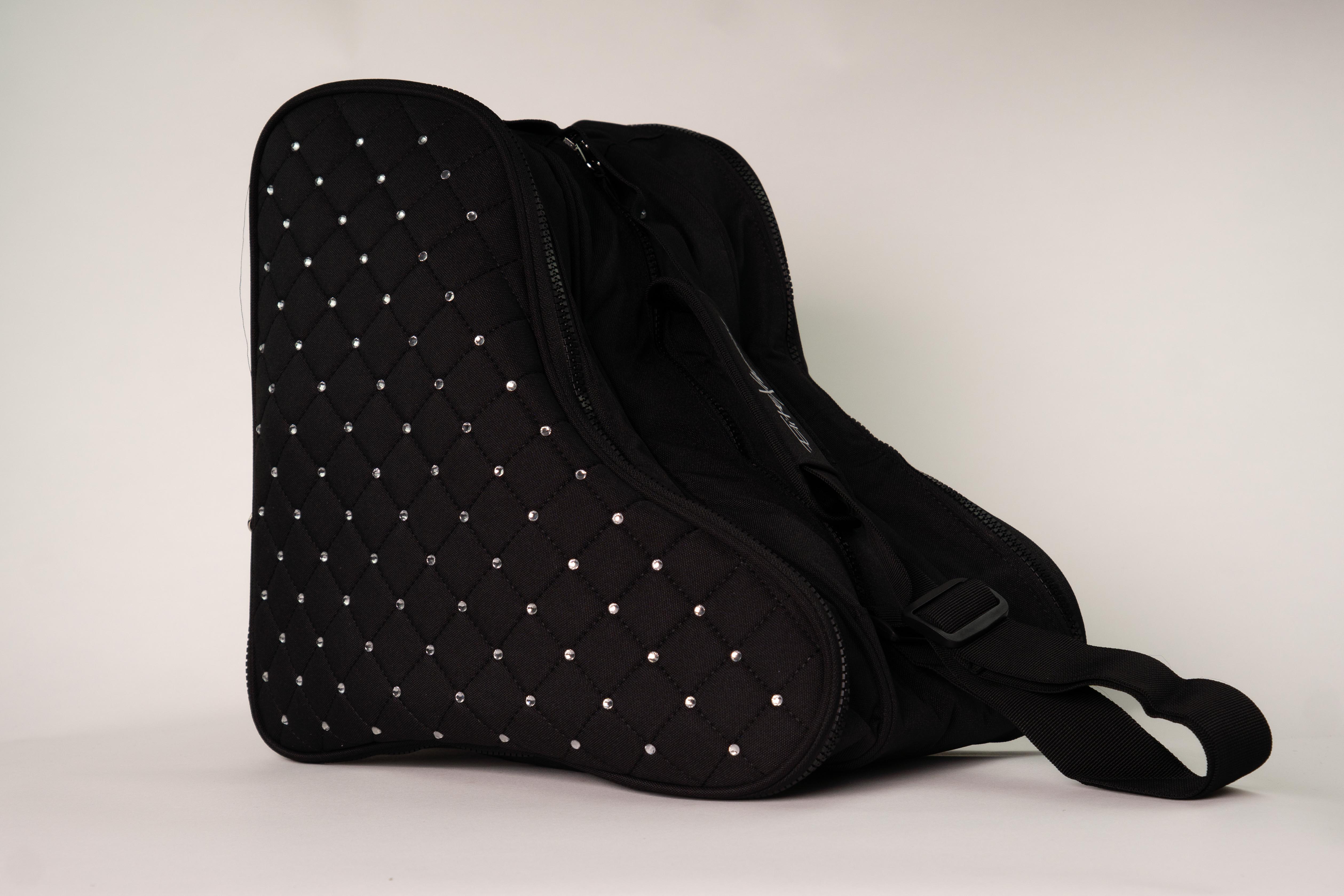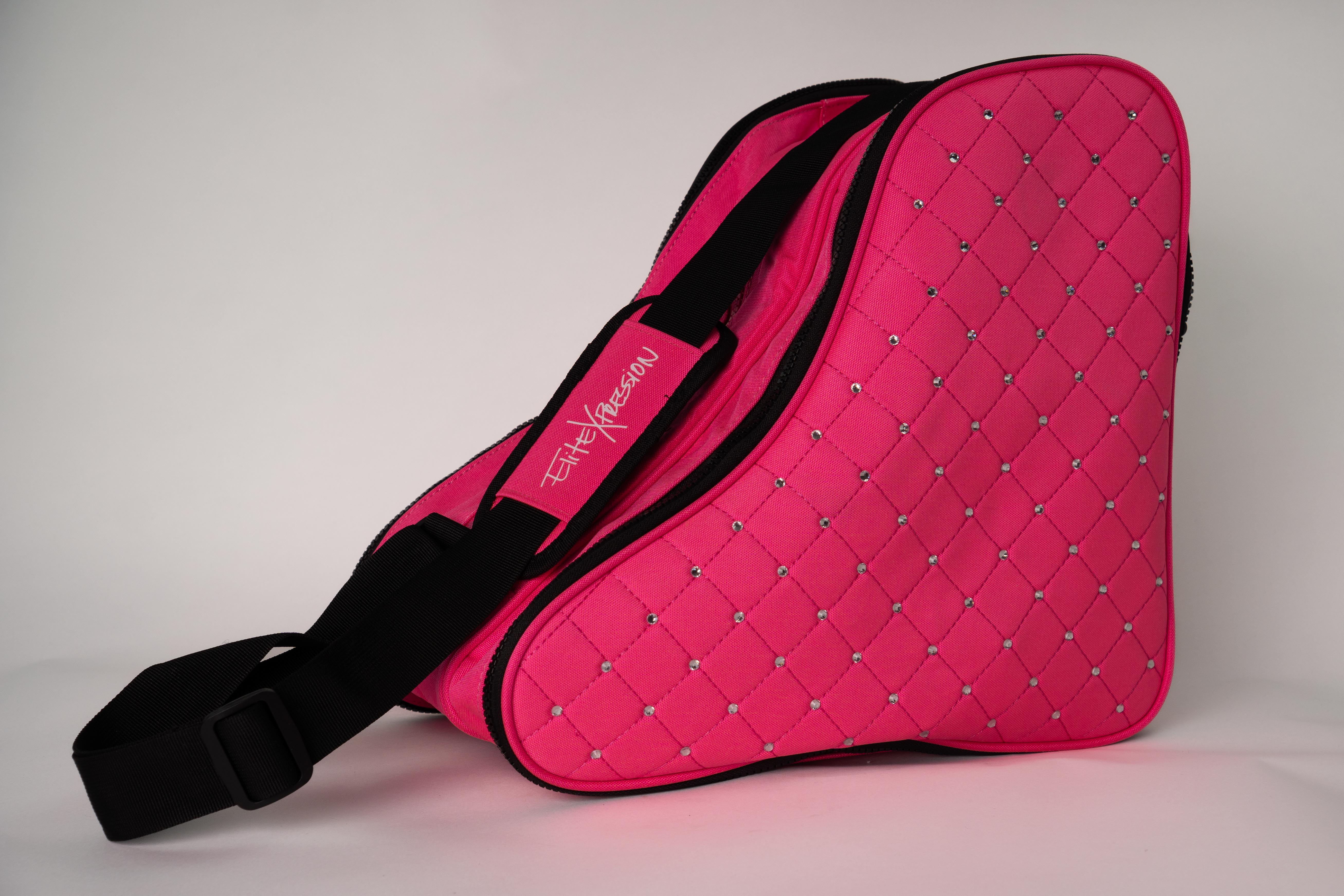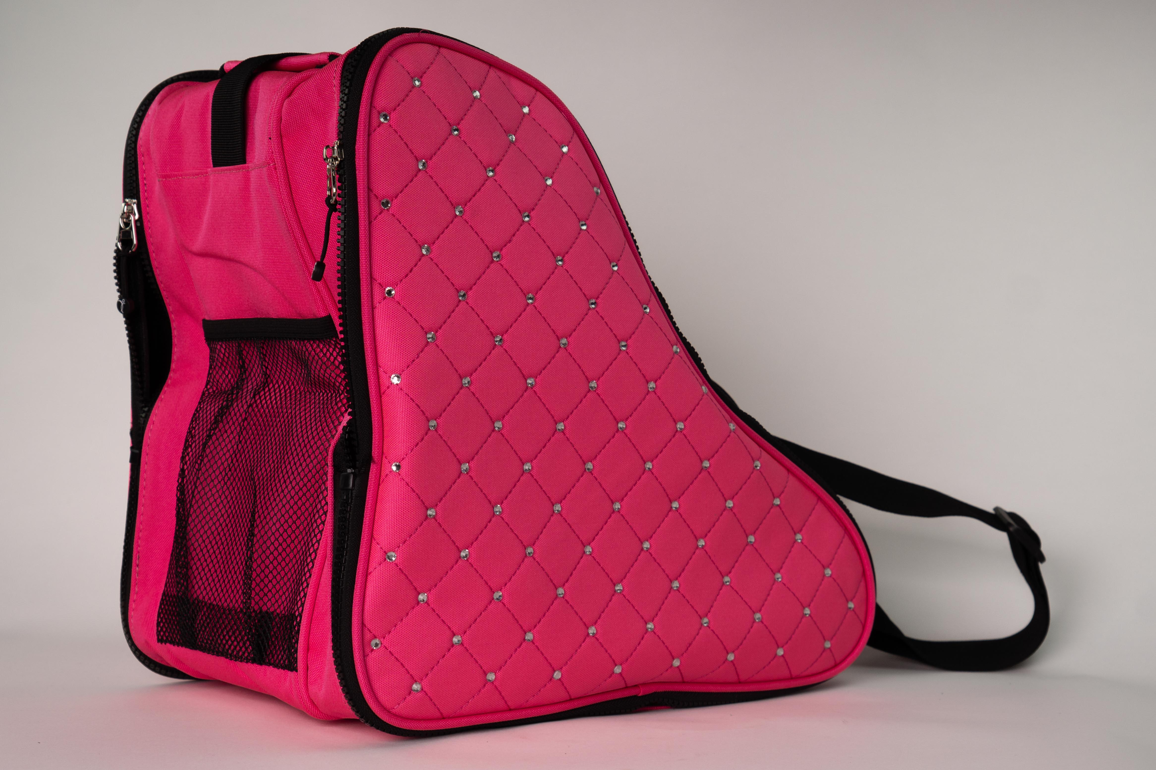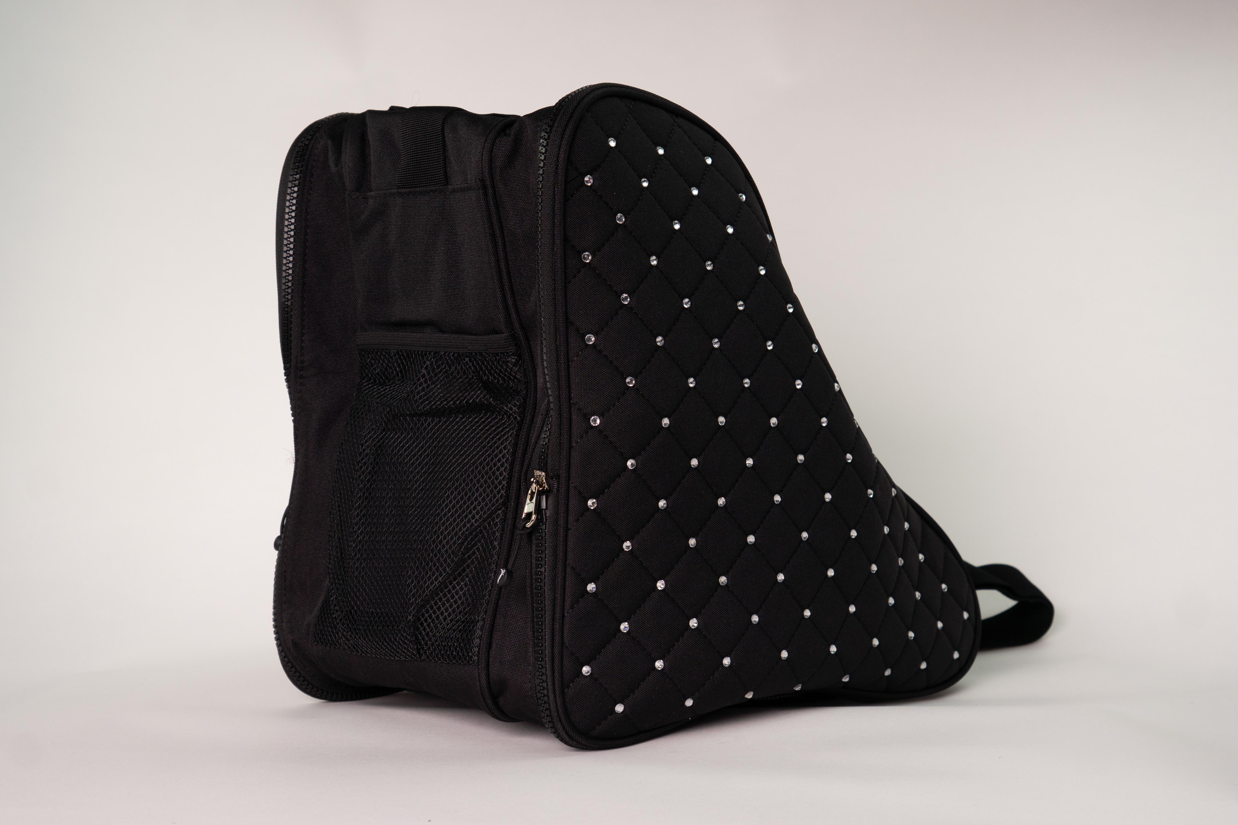 The EliteXpression figure skate bag combines style and function with its quilted exterior, sparkling rhinestones, and sleek black trim. A mesh side pocket adds storage, while the adjustable shoulder strap makes it easy to carry. Inside, the matching lining offers secure space for your skates. Available in both pink and black.