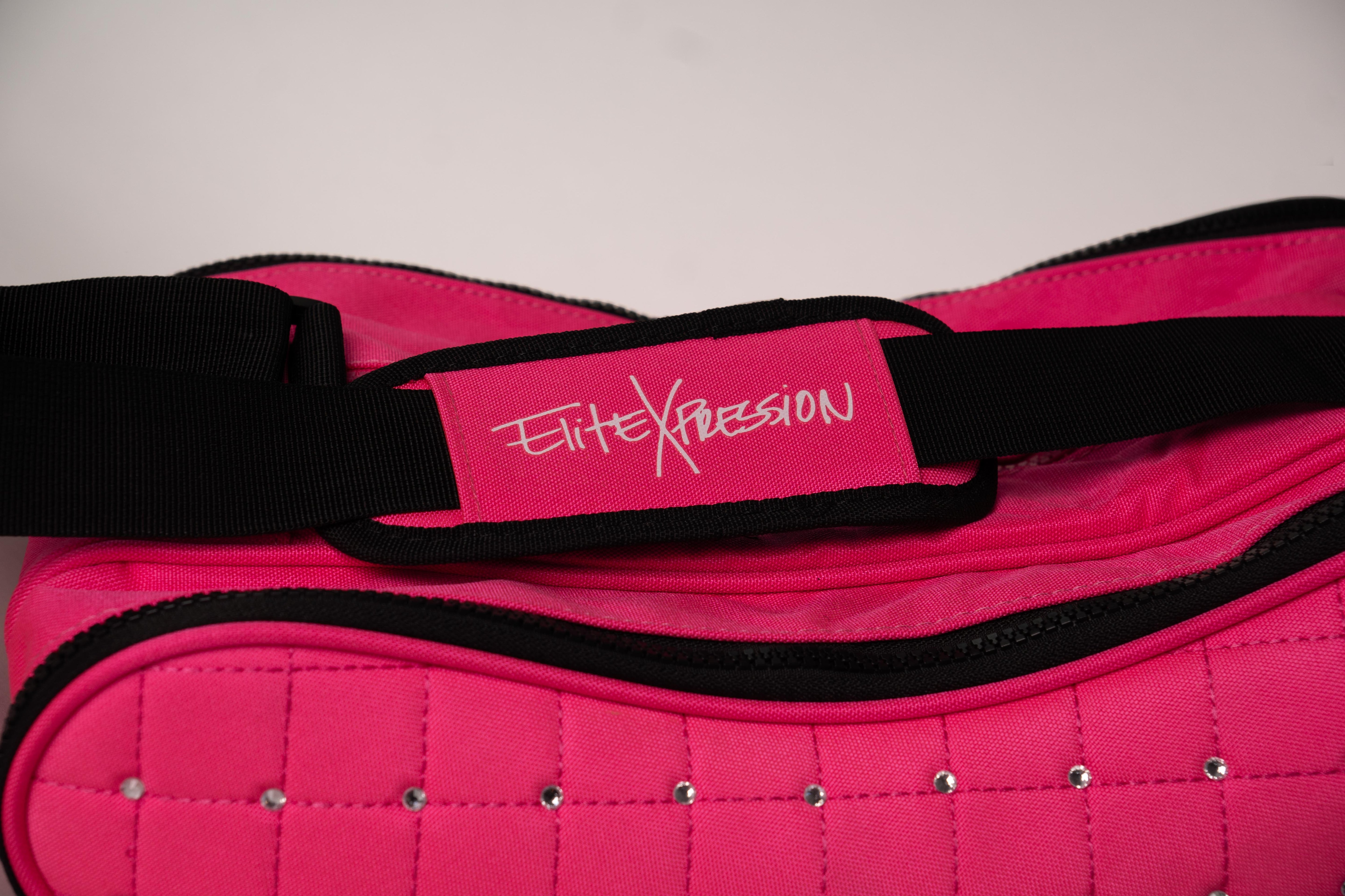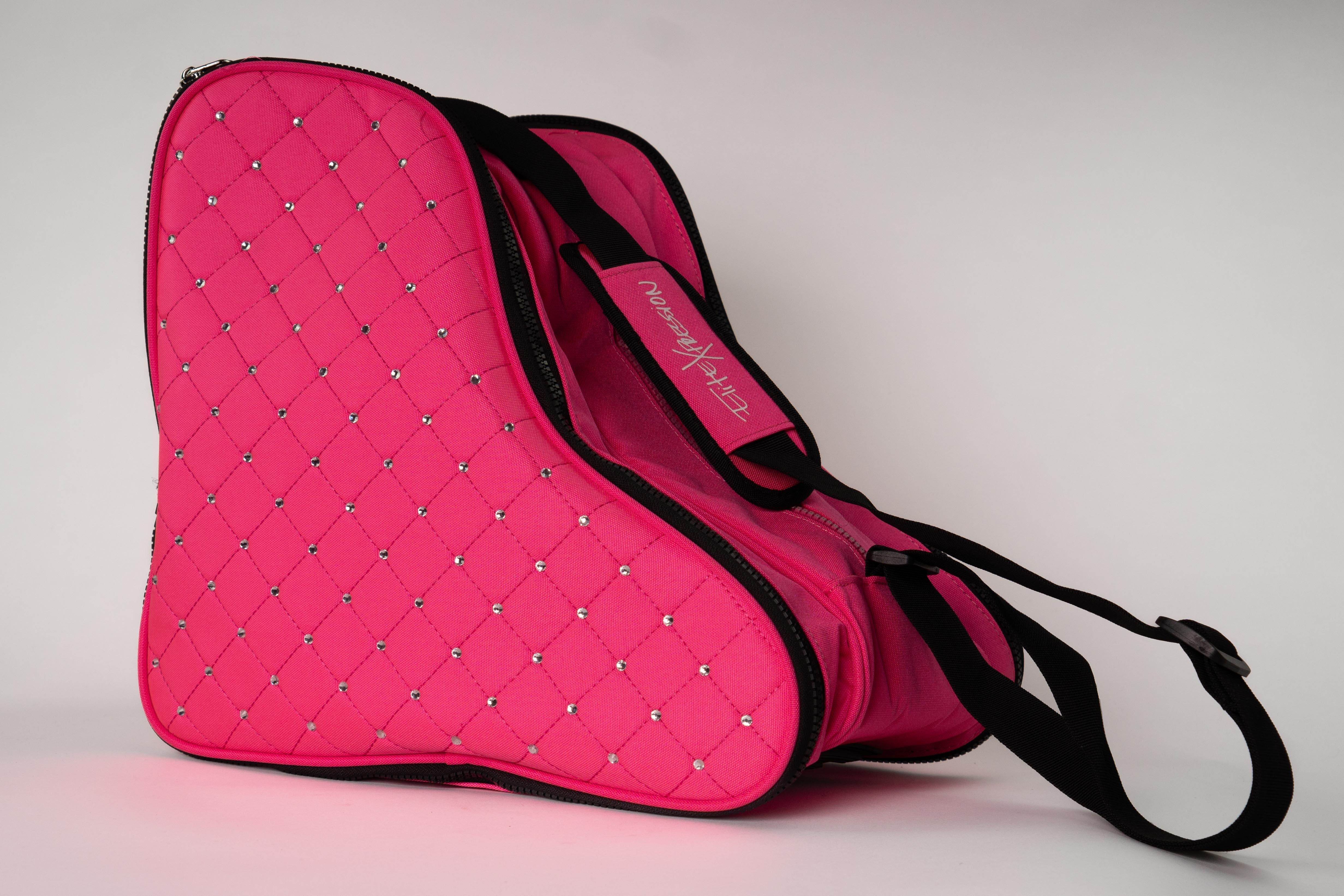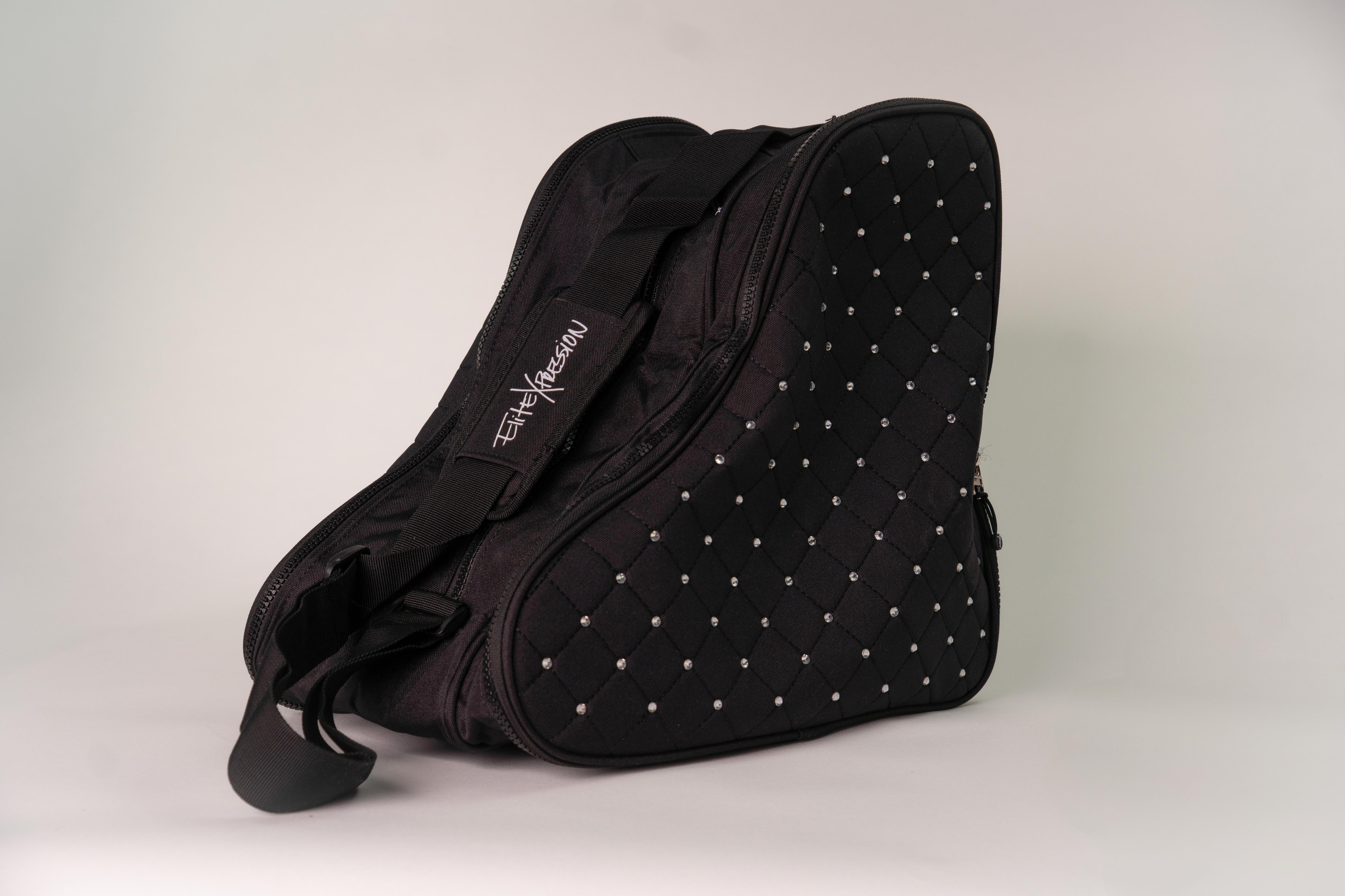 The EliteXpression figure skate bag combines style and function with its quilted exterior, sparkling rhinestones, and sleek black trim. A mesh side pocket adds storage, while the adjustable shoulder strap makes it easy to carry. Inside, the matching lining offers secure space for your skates. Available in both pink and black.