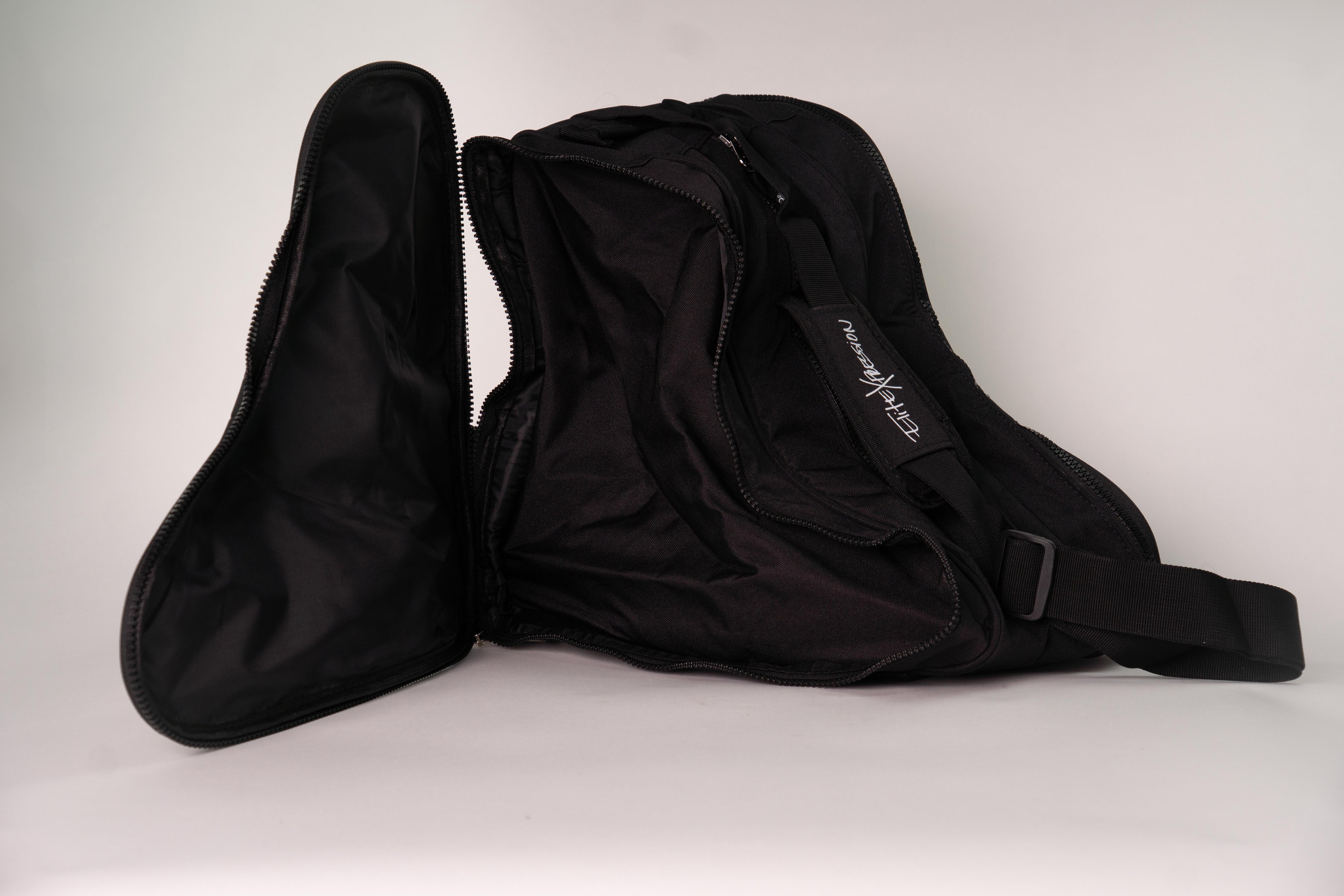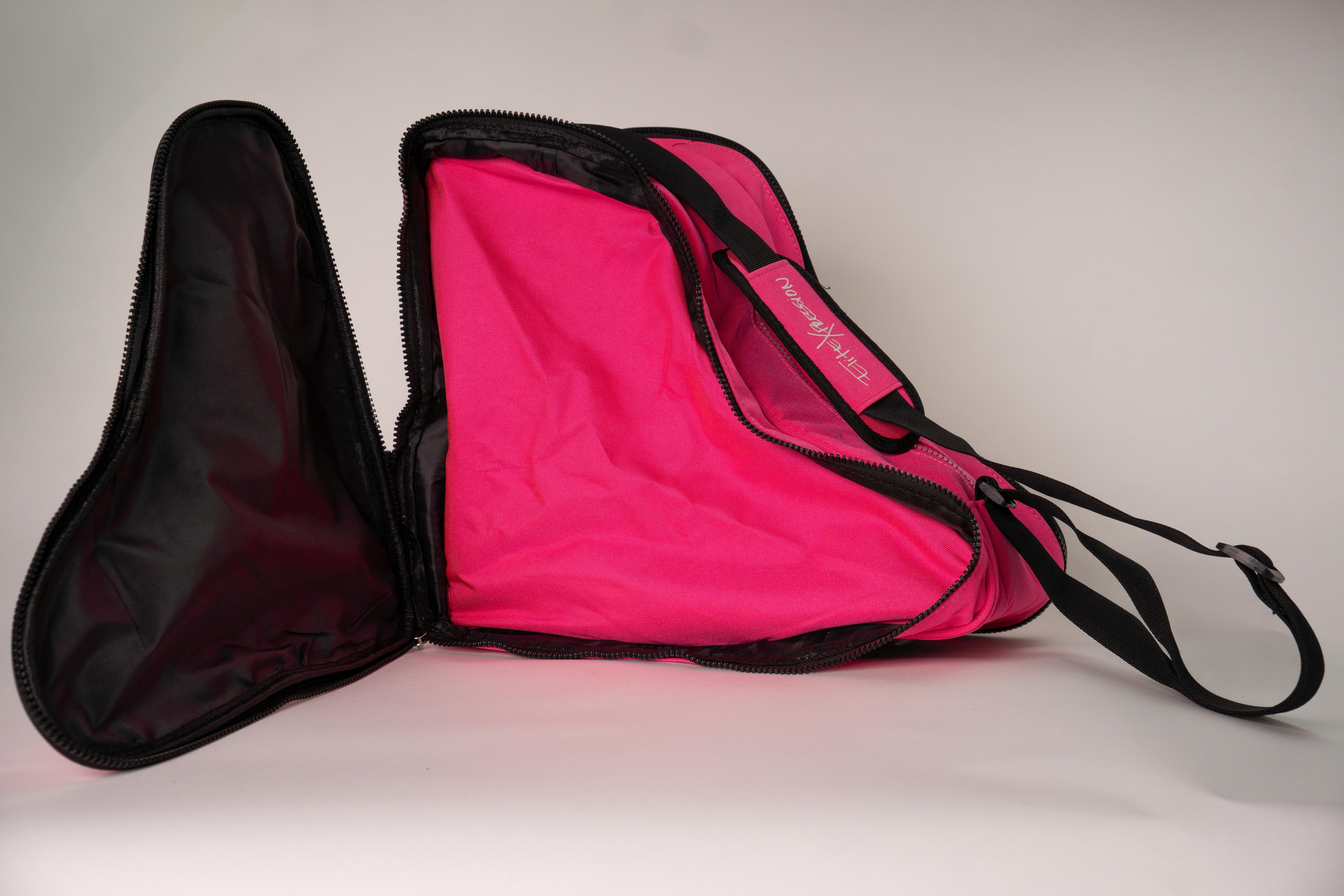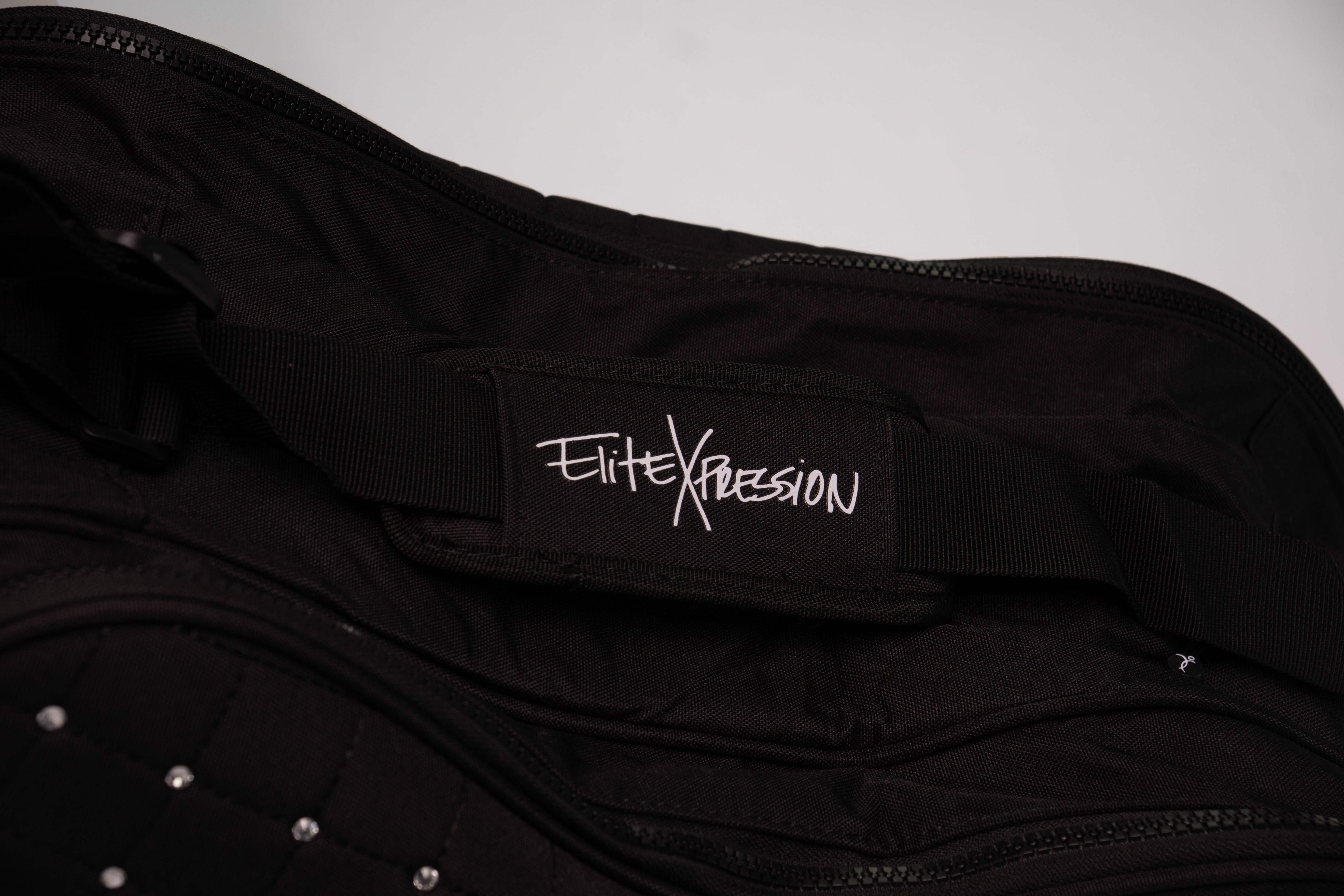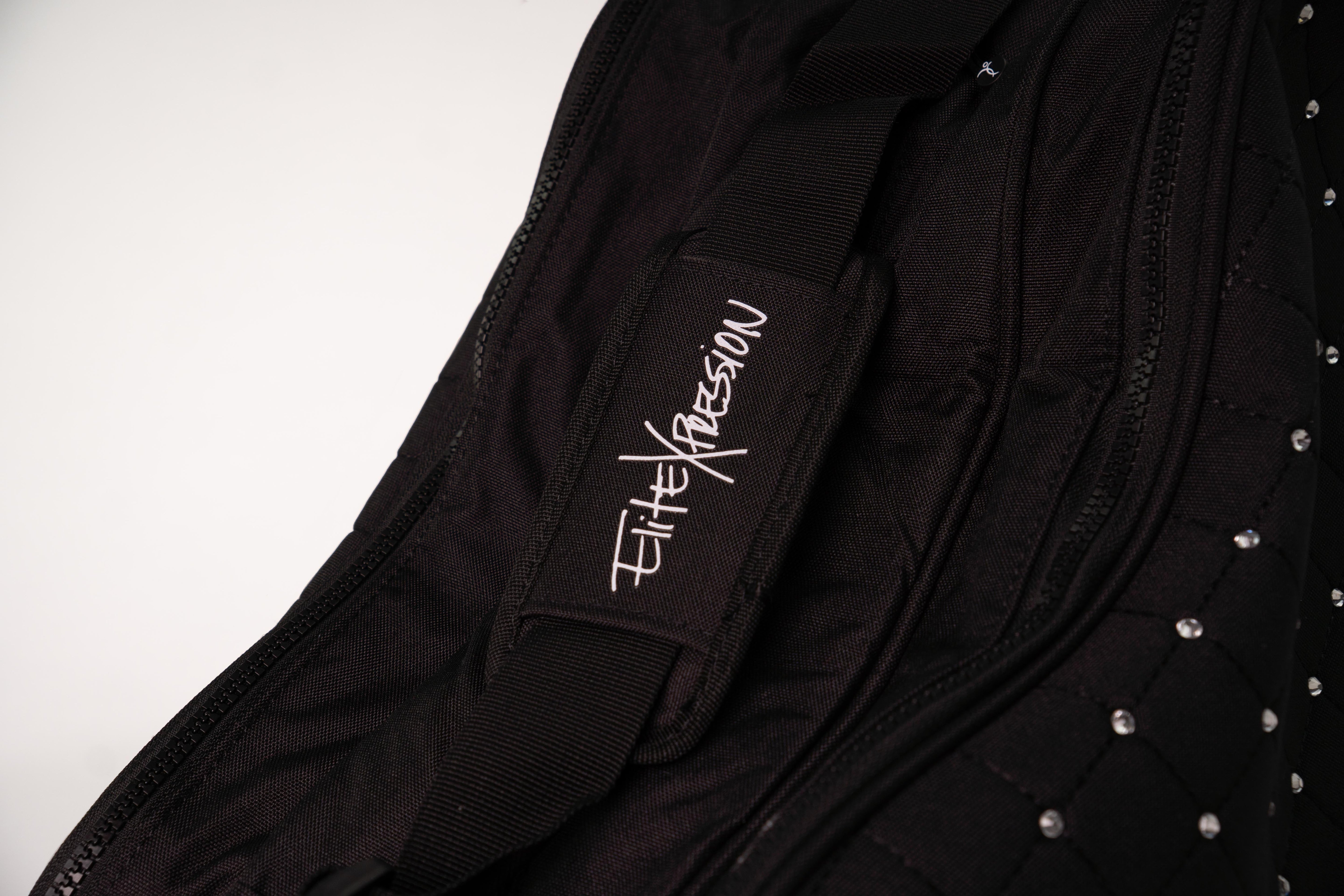 The EliteXpression figure skate bag combines style and function with its quilted exterior, sparkling rhinestones, and sleek black trim. A mesh side pocket adds storage, while the adjustable shoulder strap makes it easy to carry. Inside, the matching lining offers secure space for your skates. Available in both pink and black.