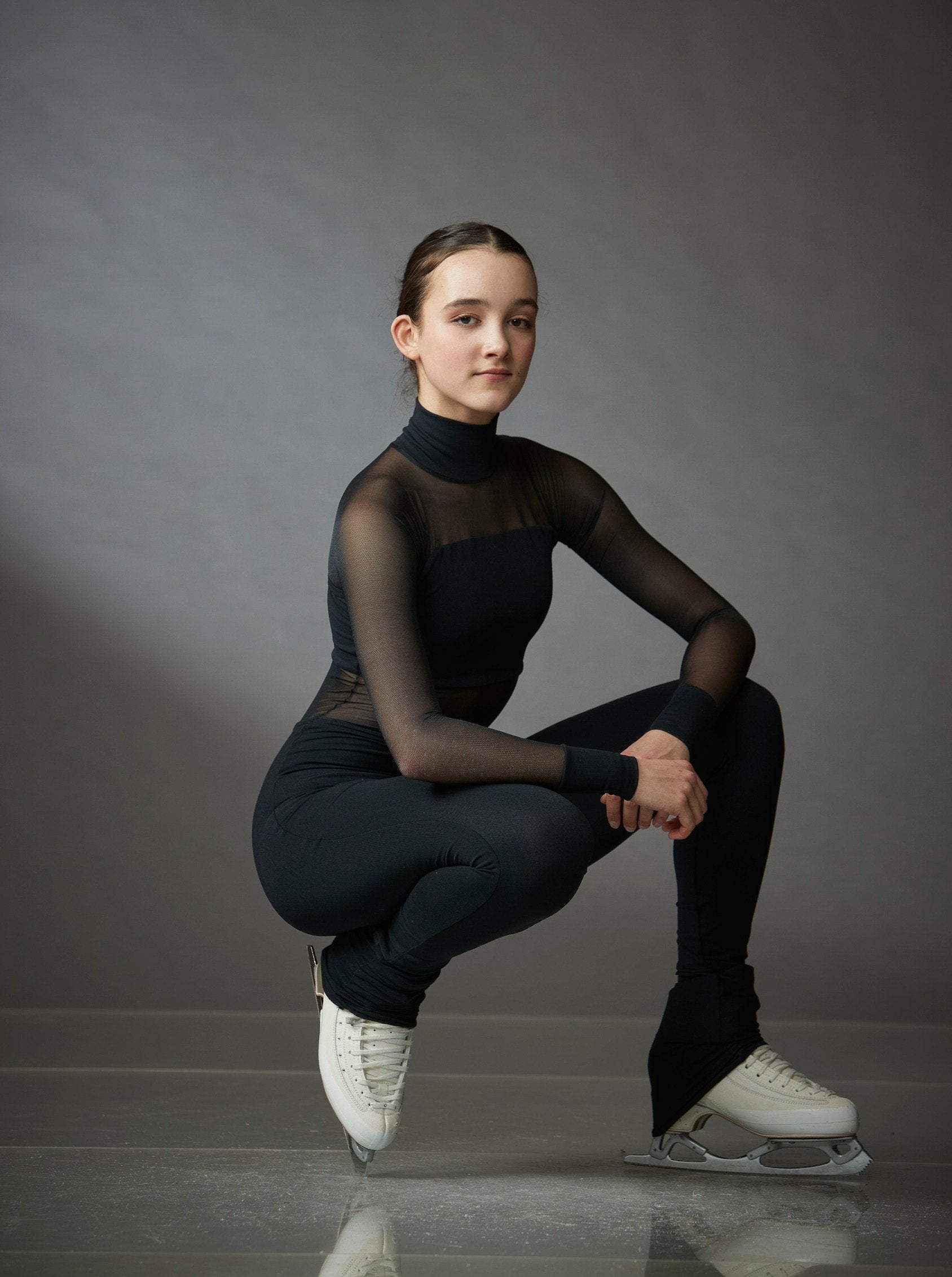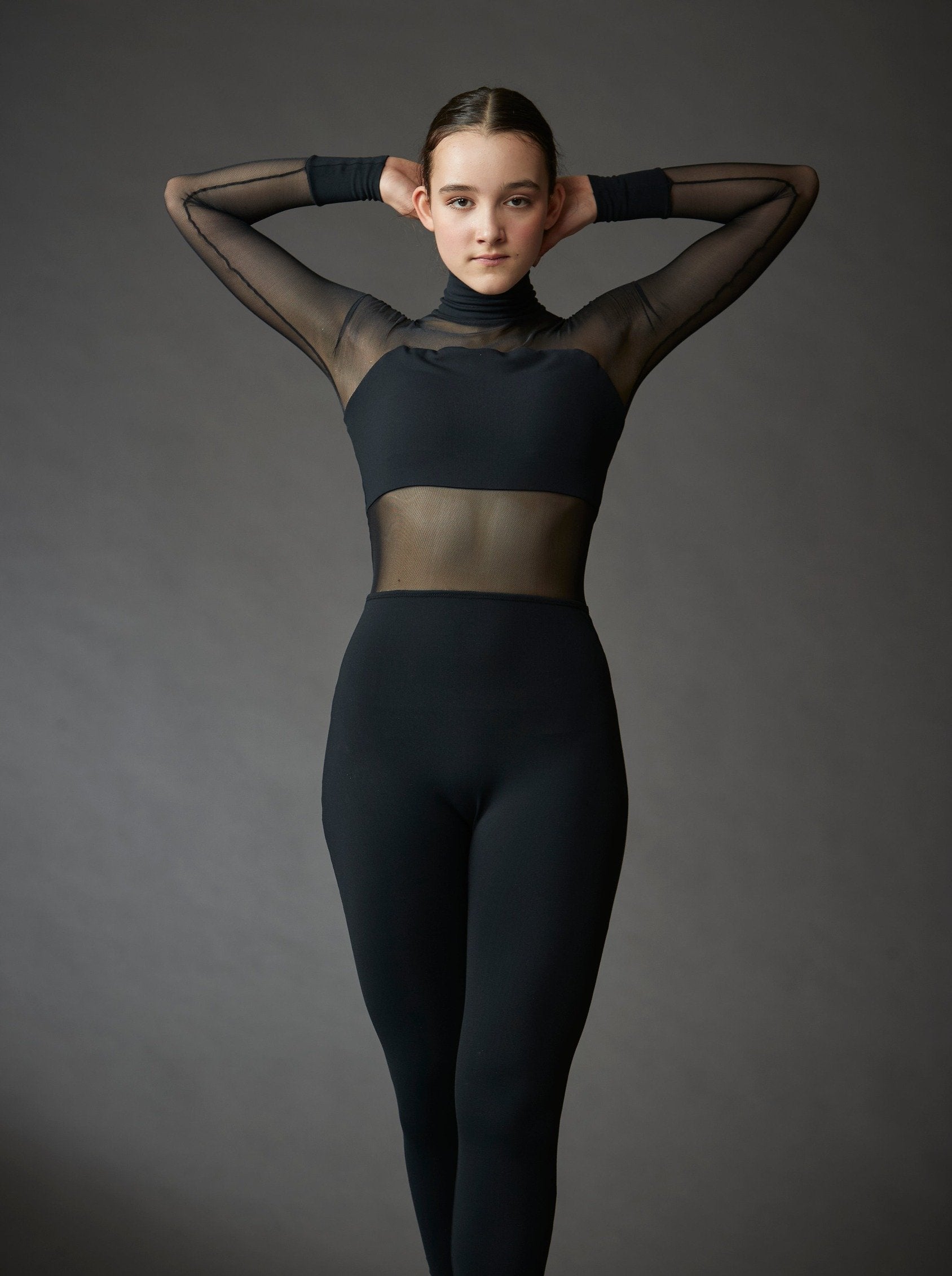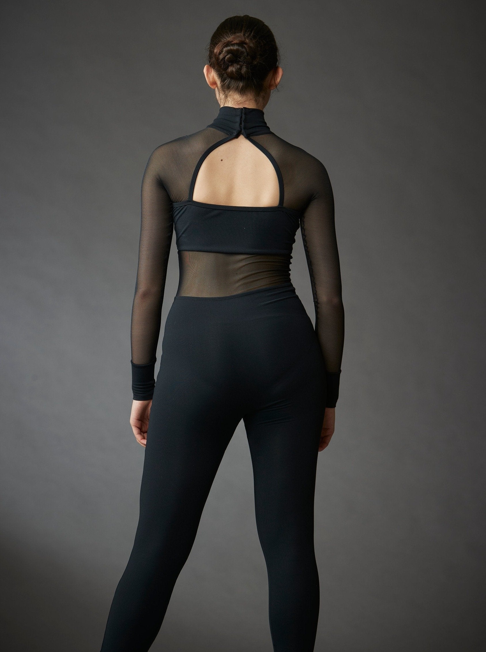 Black Supplex one-piece training outfit with long black mesh sleeves and a mesh panel at the midsection, designed by Elite Xpression for figure skating or dance.