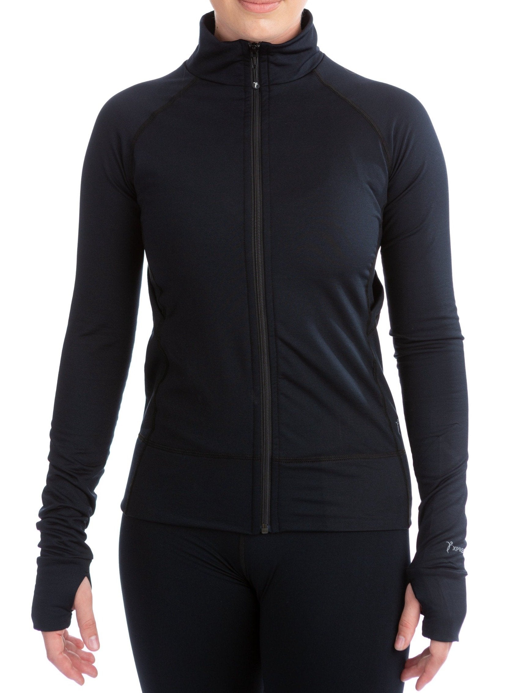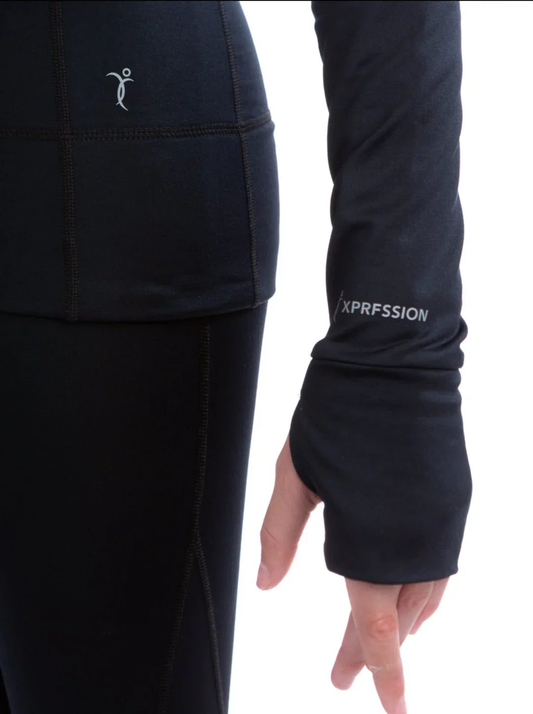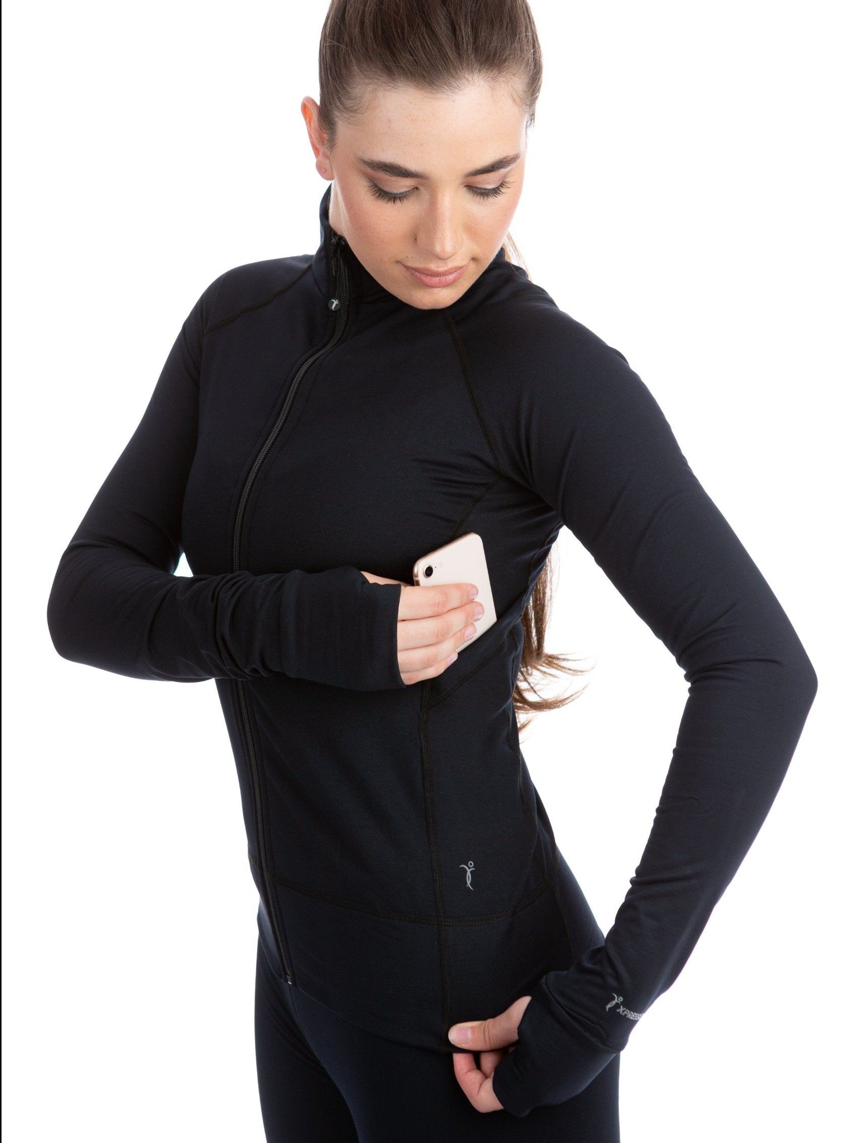 Black tech figure skating training jacket in Fetex fabric, featuring a side pocket for a cellphone and thumb slits. Made with brushed fabric inside for added warmth. Designed by Elite Xpression.