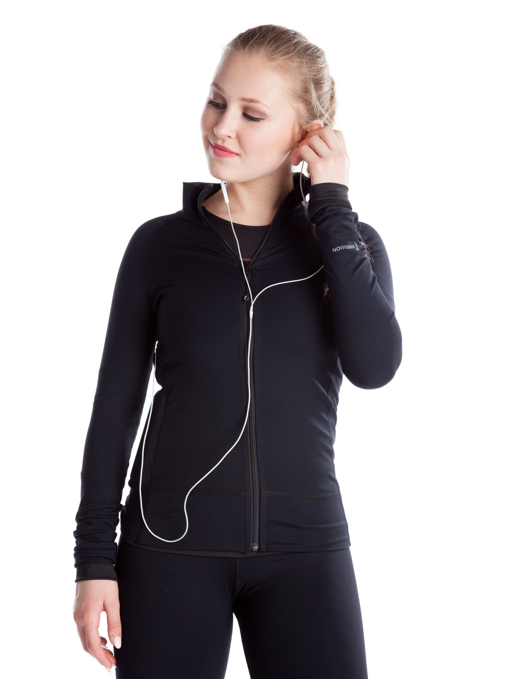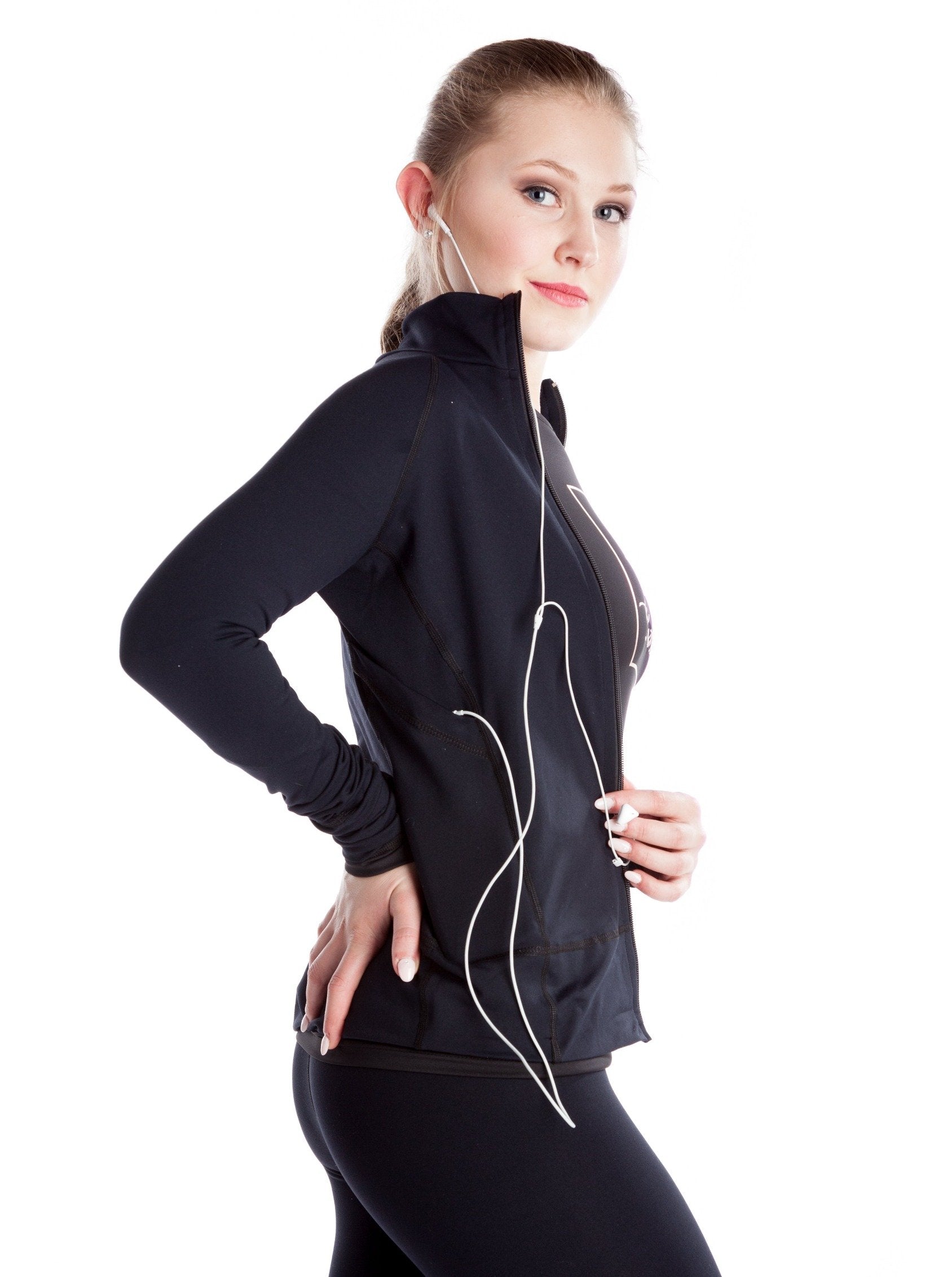 Black tech jacket in warm Vuelta fabric, featuring a cellphone pocket. Designed by Elite Xpression.