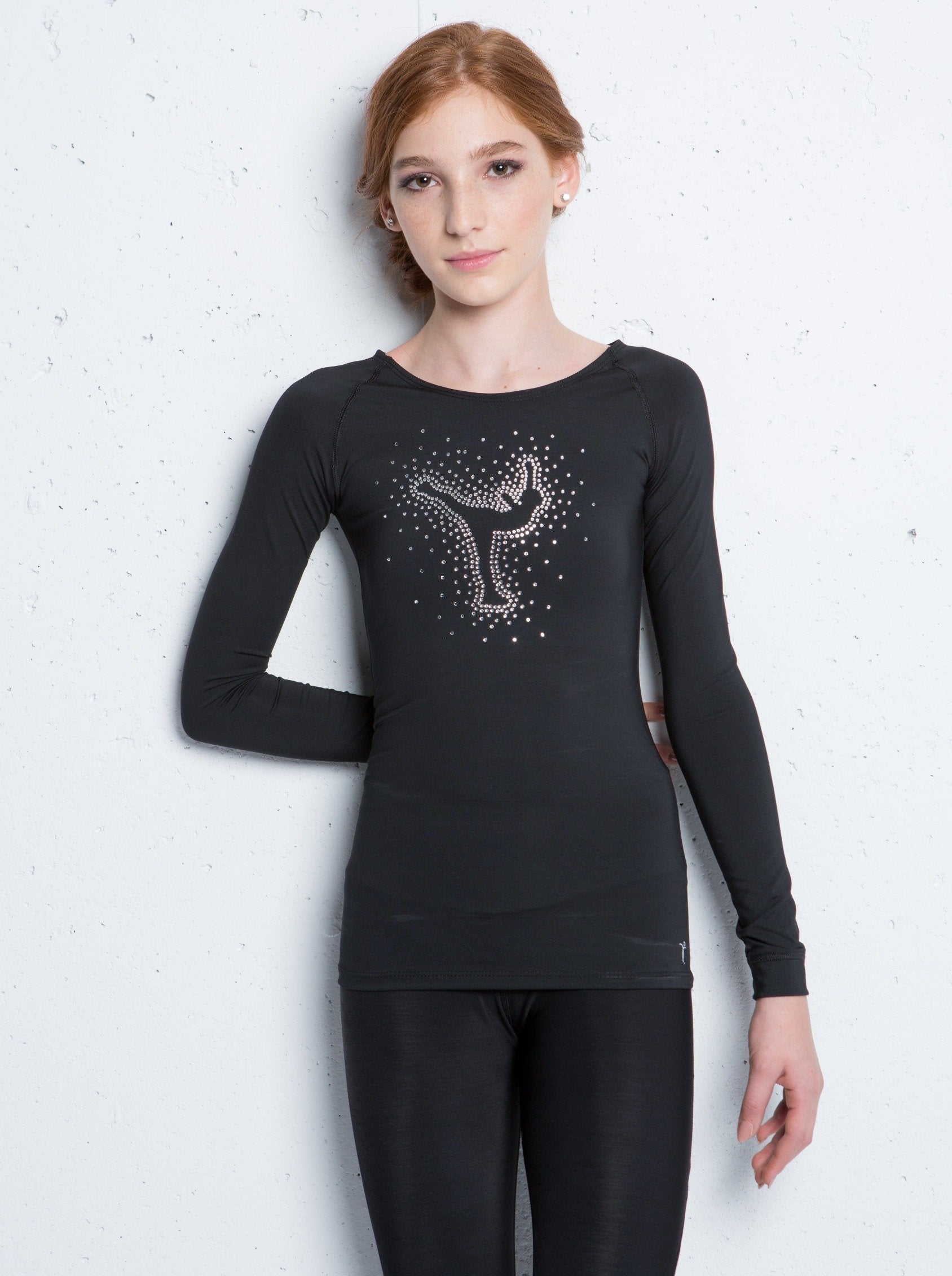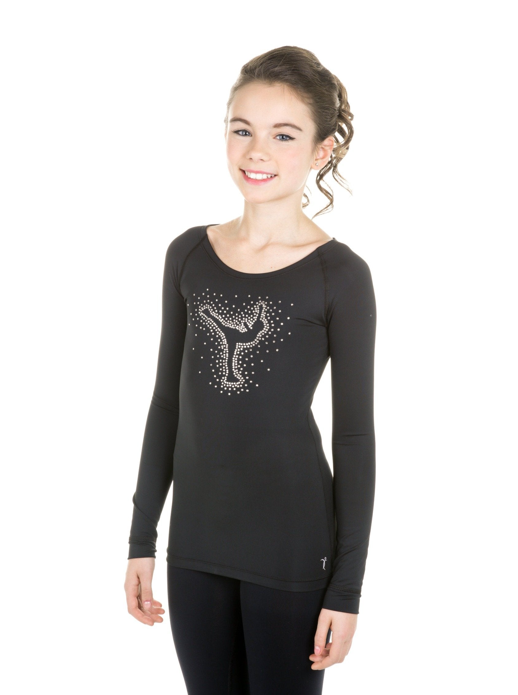 Bling top by Elite Xpression, adorned with rhinestones depicting a figure skater performing a spiral.