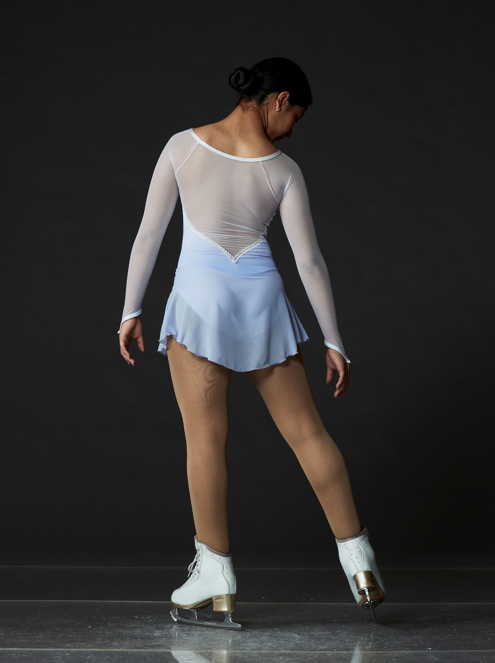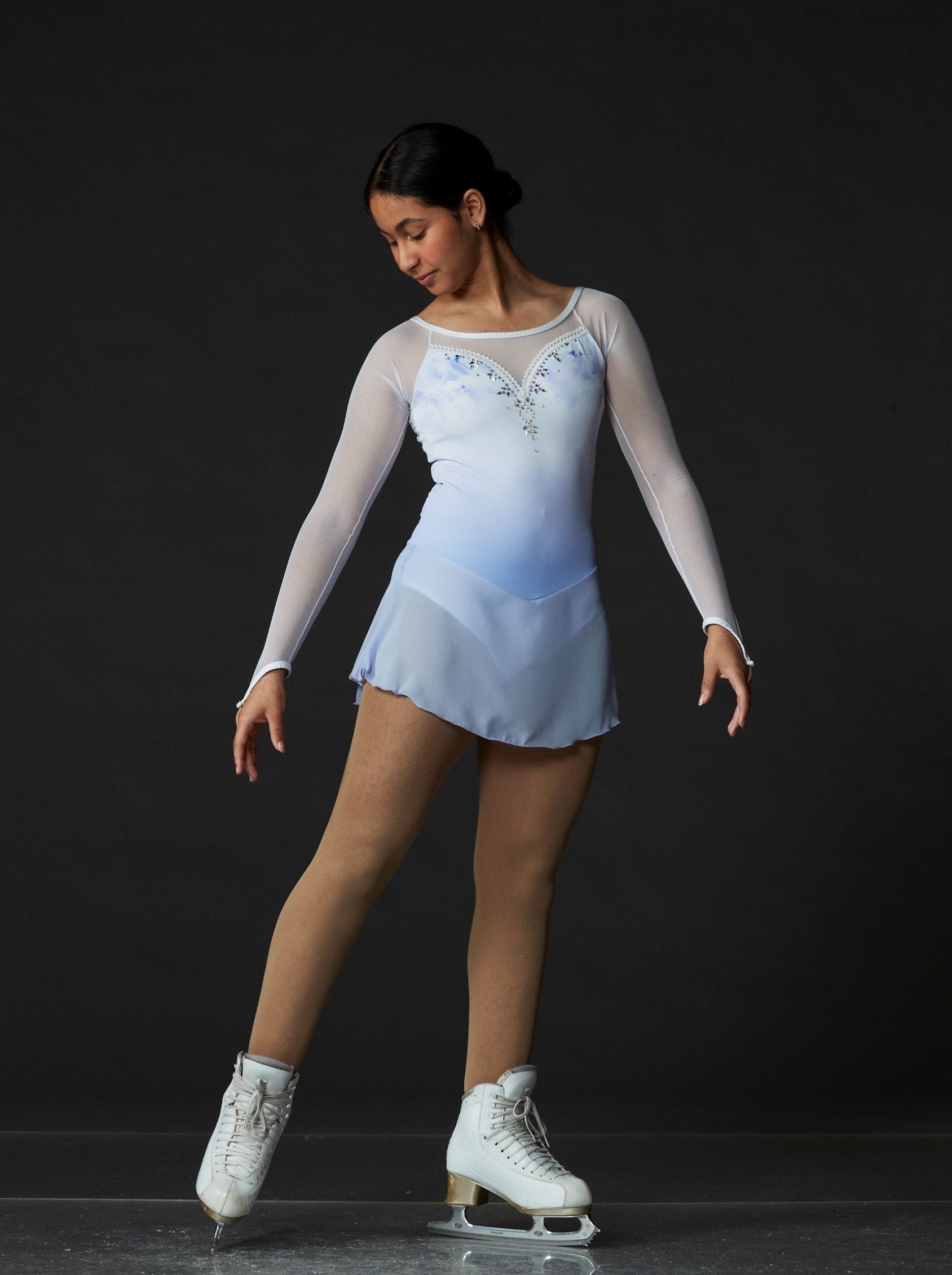 Long-sleeve dress featuring a sublimated bodice with lilac and white flowers fading into a lilac chiffon skirt, from the Elite Xpression collection.