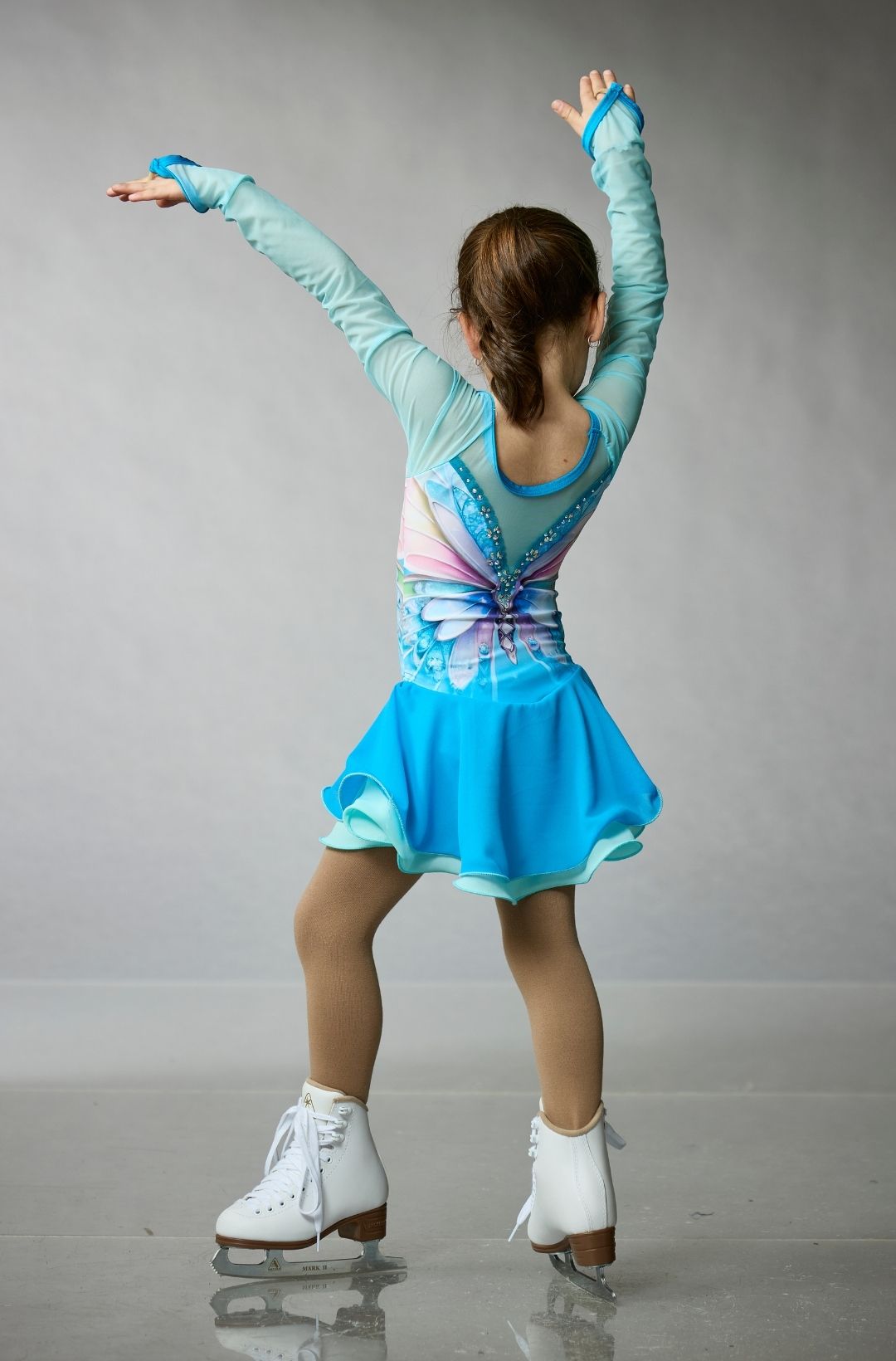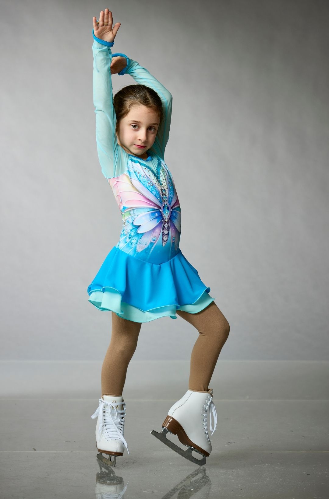 Figure skating dress with sparkling lilac mesh long sleeves, a printed butterfly in shades of light blue, teal, and pink decorated with crystals, and a multi-layered chiffon skirt by Elite Xpression.