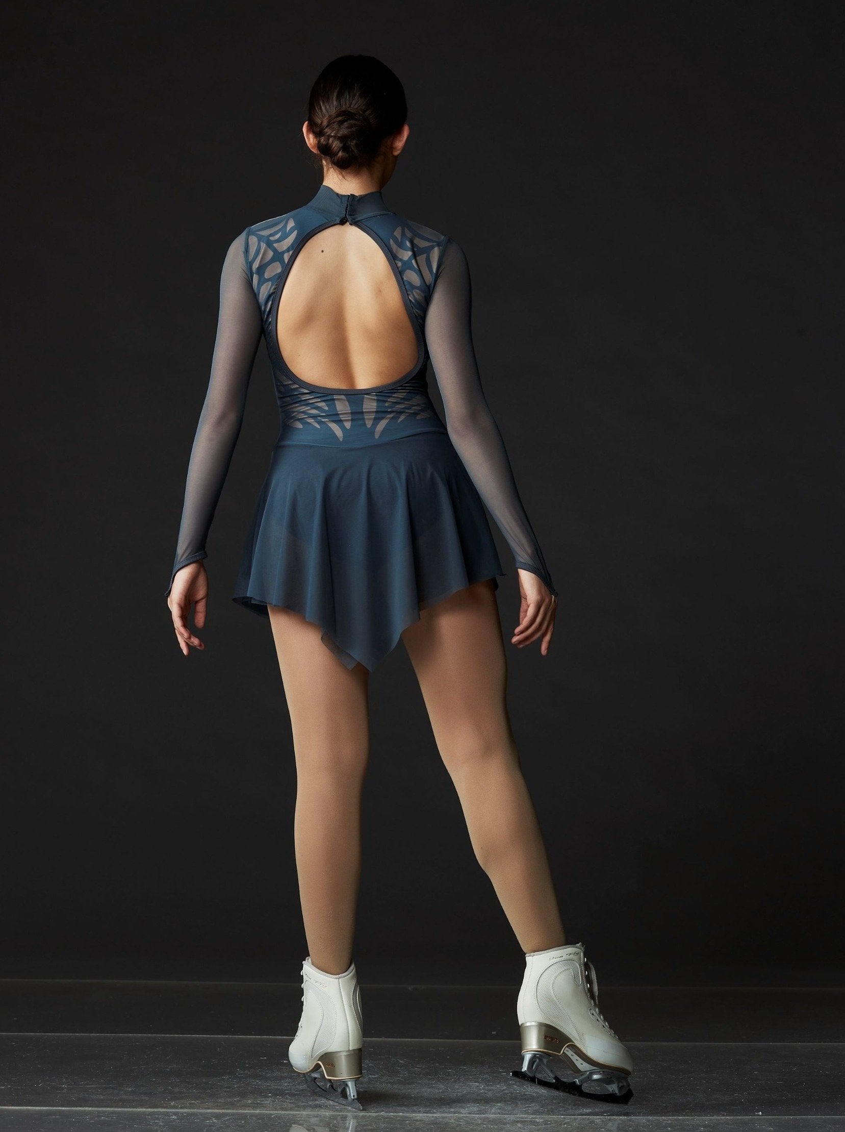Grey figure skating dress with long mesh sleeves, a sublimated bodice adorned with crystals, and a multi-layer mesh skirt, crafted by Elite Xpression.
