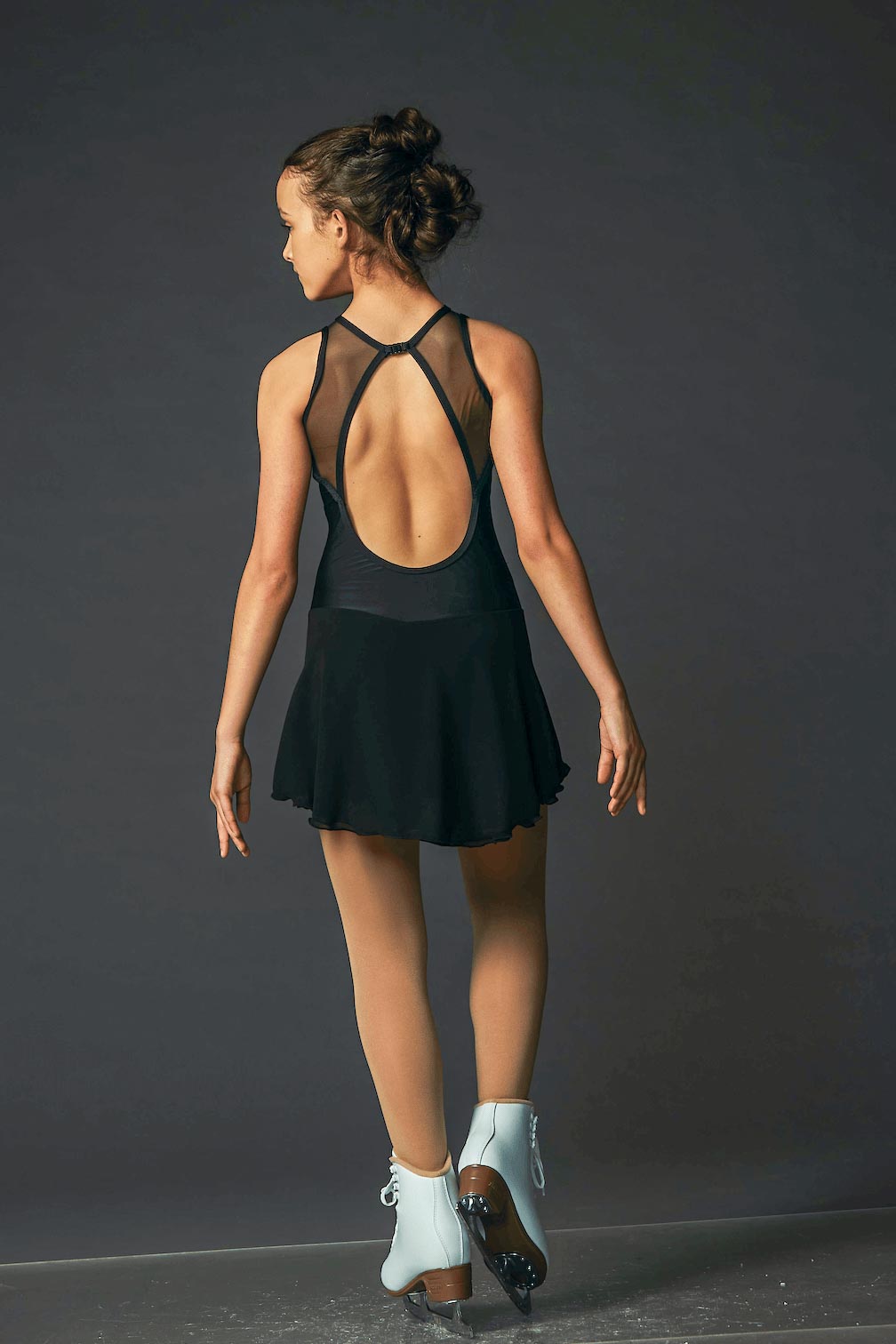 Classic black halter-top figure skating dress with a chiffon skirt, by Elite Xpression.