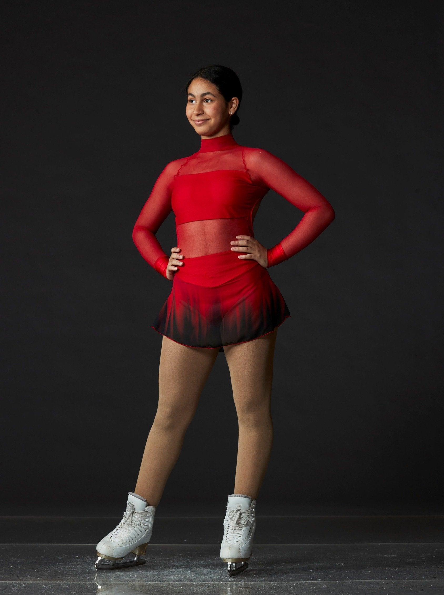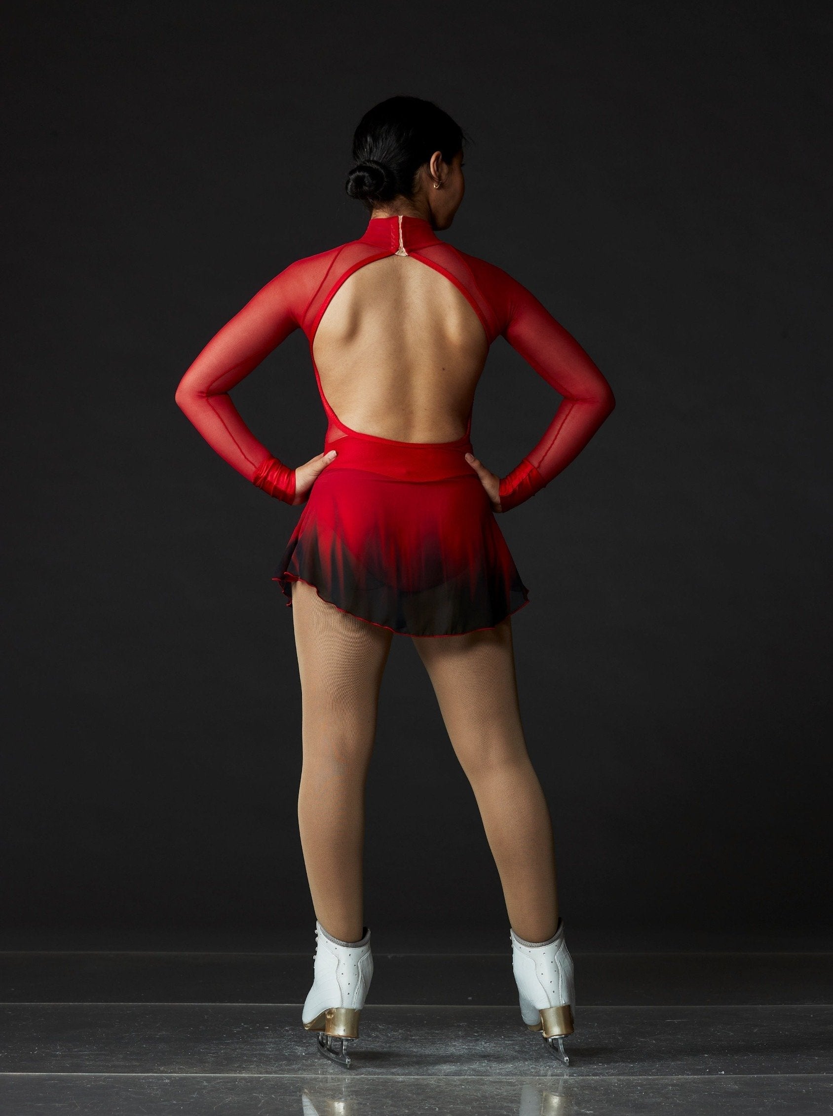 Red figure skating dress by Elite Xpression, featuring a mesh-exposed bodice, sheer mesh long sleeves, and a printed chiffon skirt.