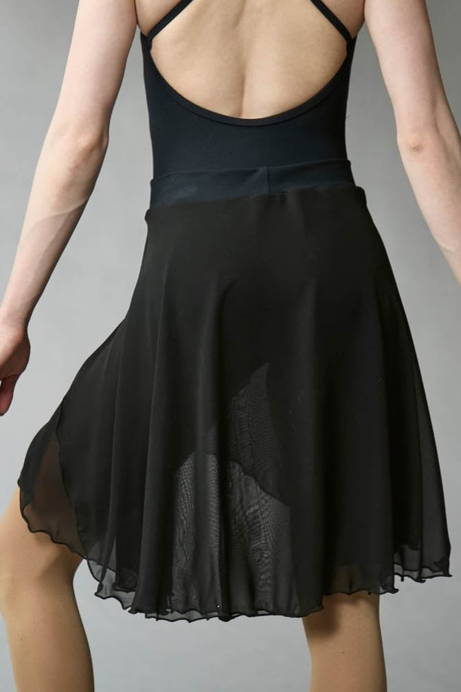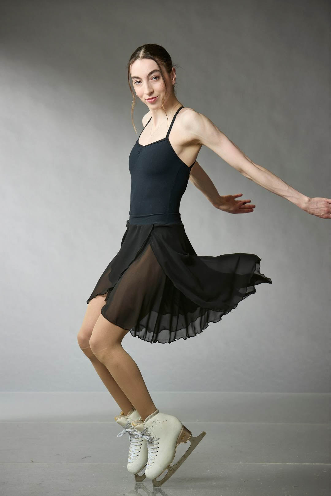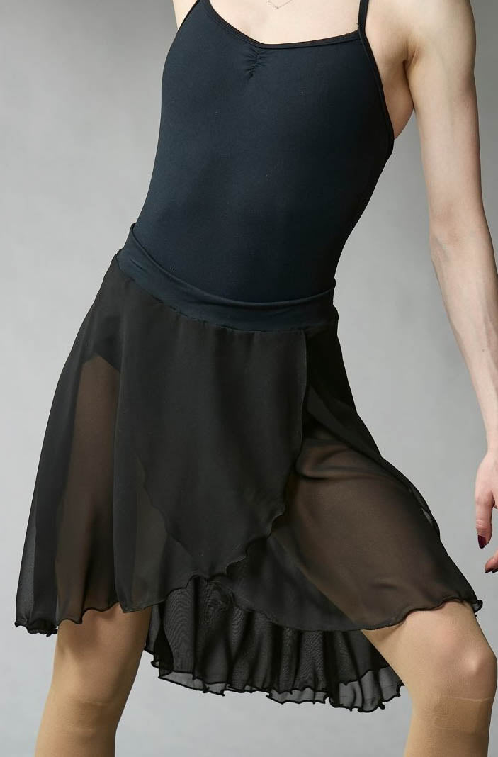 Elegant black chiffon skirt featuring a front cross-over wrap, designed for figure skating by Elite Xpression.