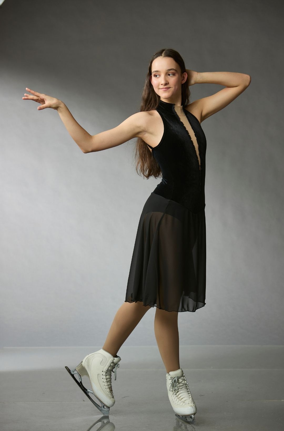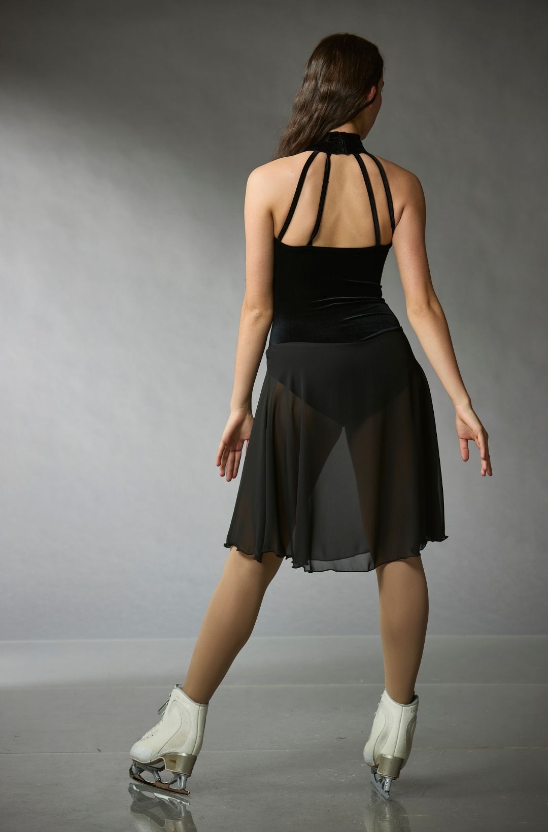 Black figure skating dance dress from the Elite Xpression collection, featuring a single-layer chiffon skirt. The upper portion of the dress is made of soft velvet, with a narrow deep V neckline that adds elegance and sophistication.
