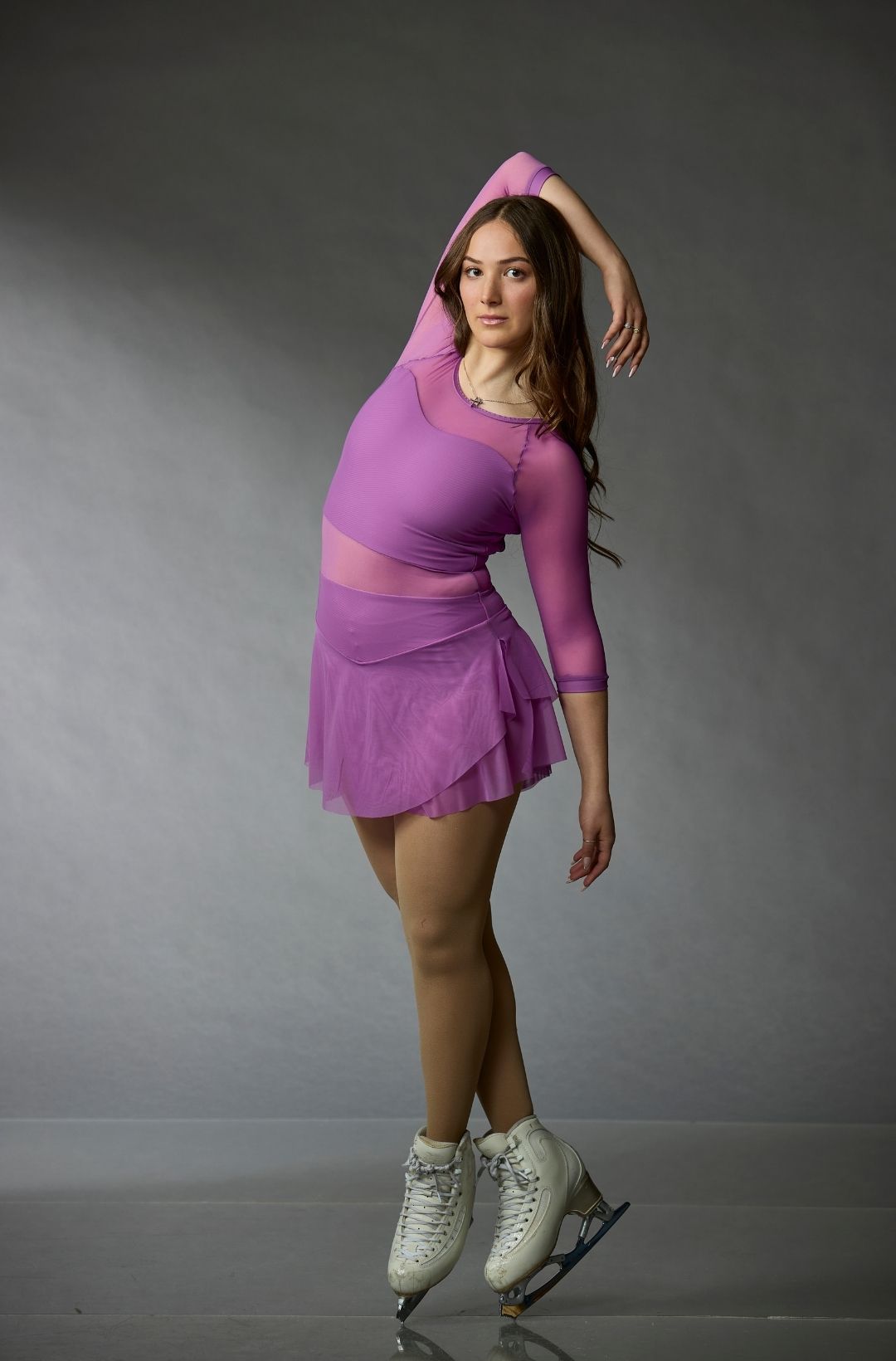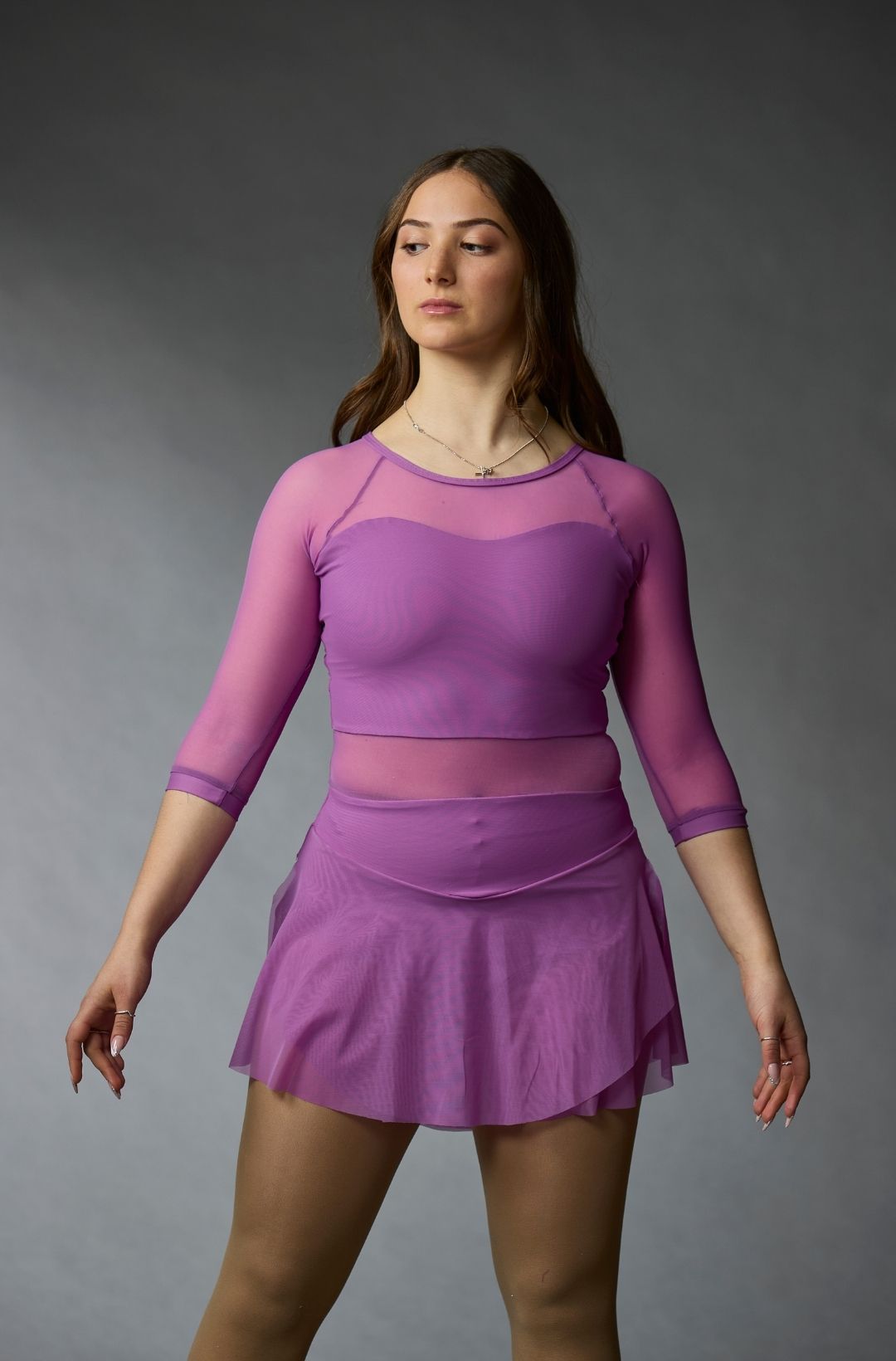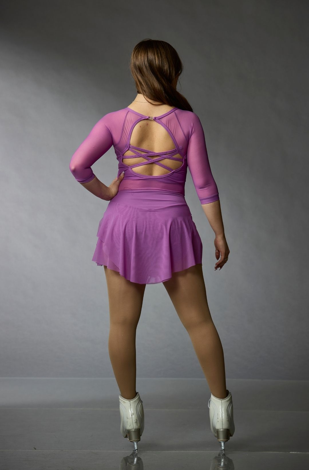 Simple lilac figure skating dress made of mesh, featuring three-quarter sleeves and a two-layer mesh skirt. Criss-cross straps accent the open back, with a mesh insert at the bodice. From the Elite Xpression collection.