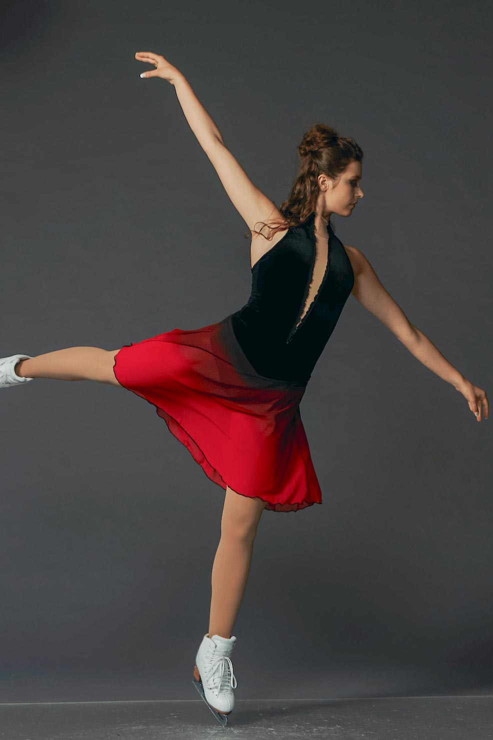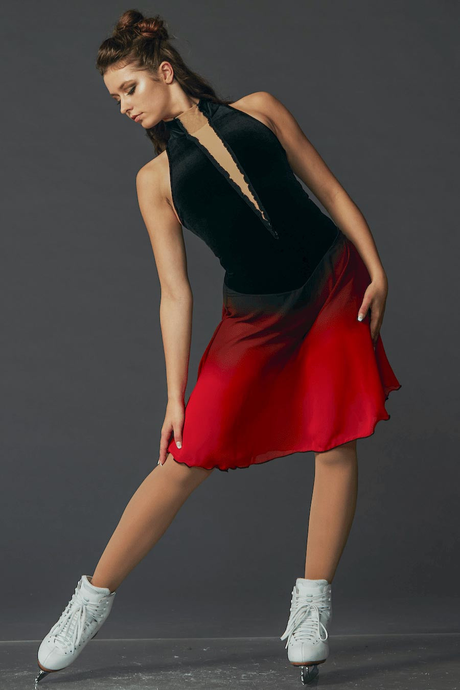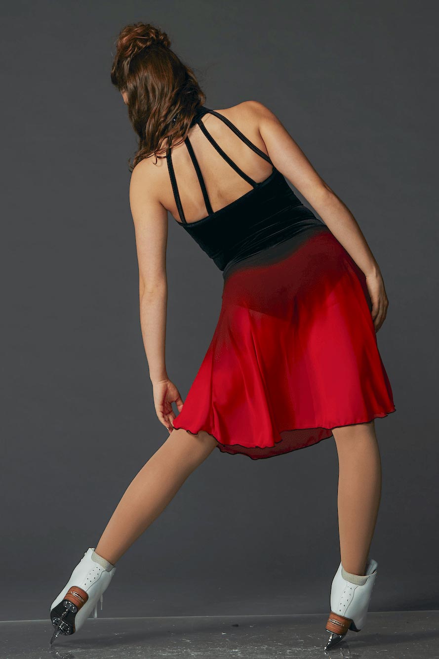 Figure skating dance dress with a faded red chiffon skirt from the collection by Elite Xpression.