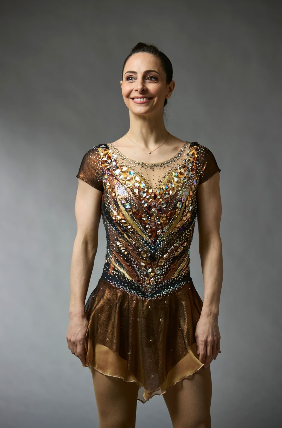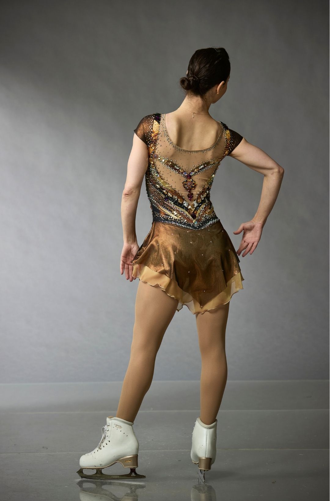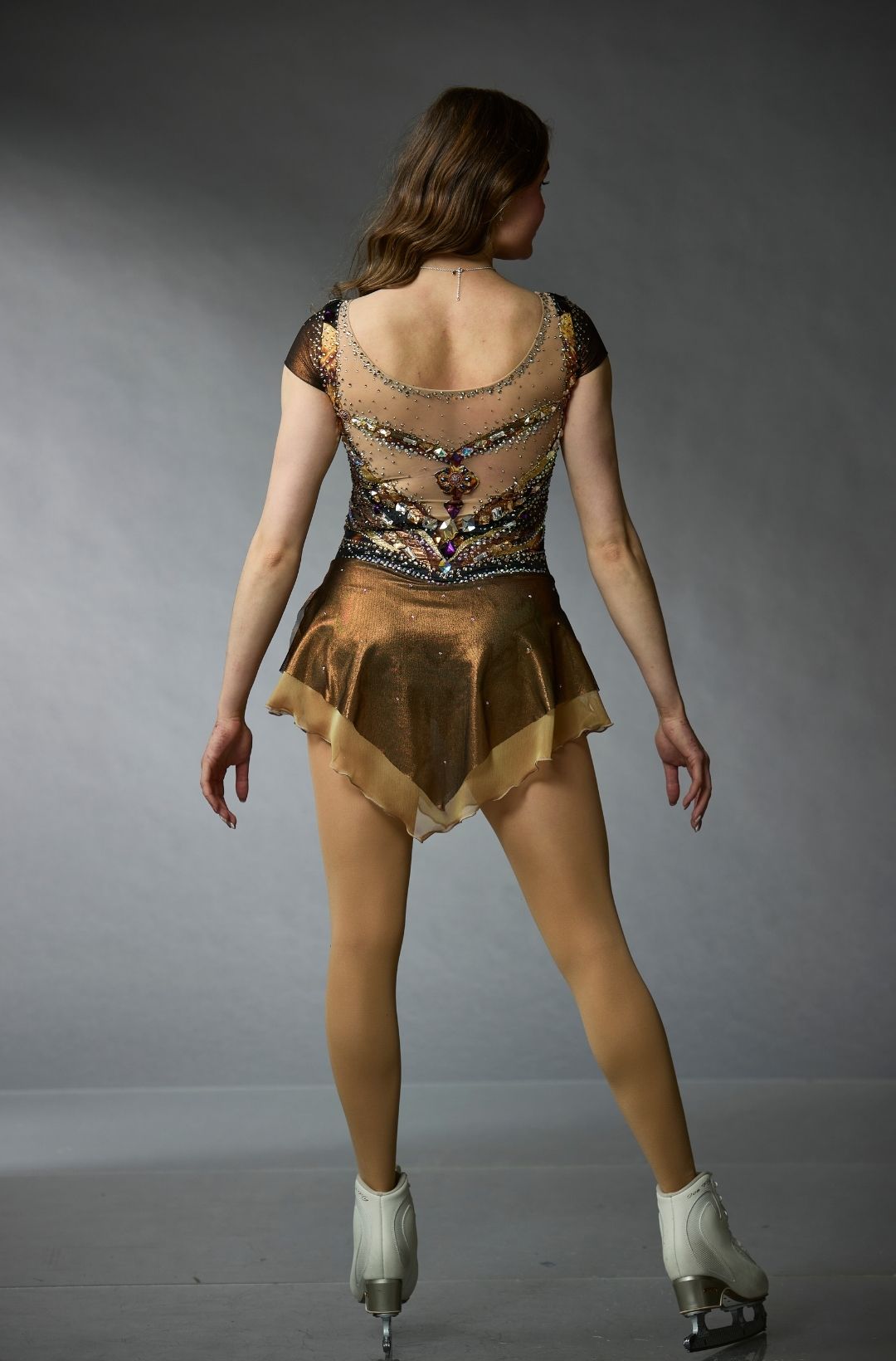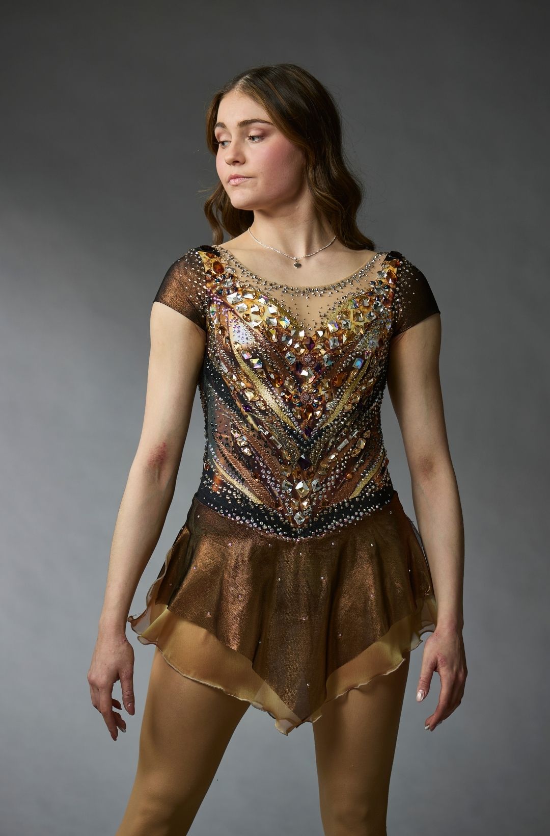 Mesmerizing figure skating dress from EliteXpression’s One of a Kind collection, featuring a deep gold base with sheer long sleeves and a high neckline. The bodice shimmers with intricate silver beading in swirling patterns, paired with a subtly sparkling flared skirt.
