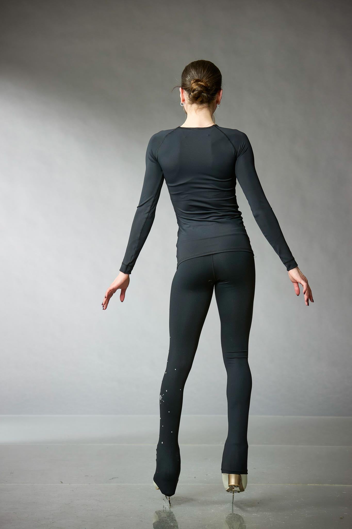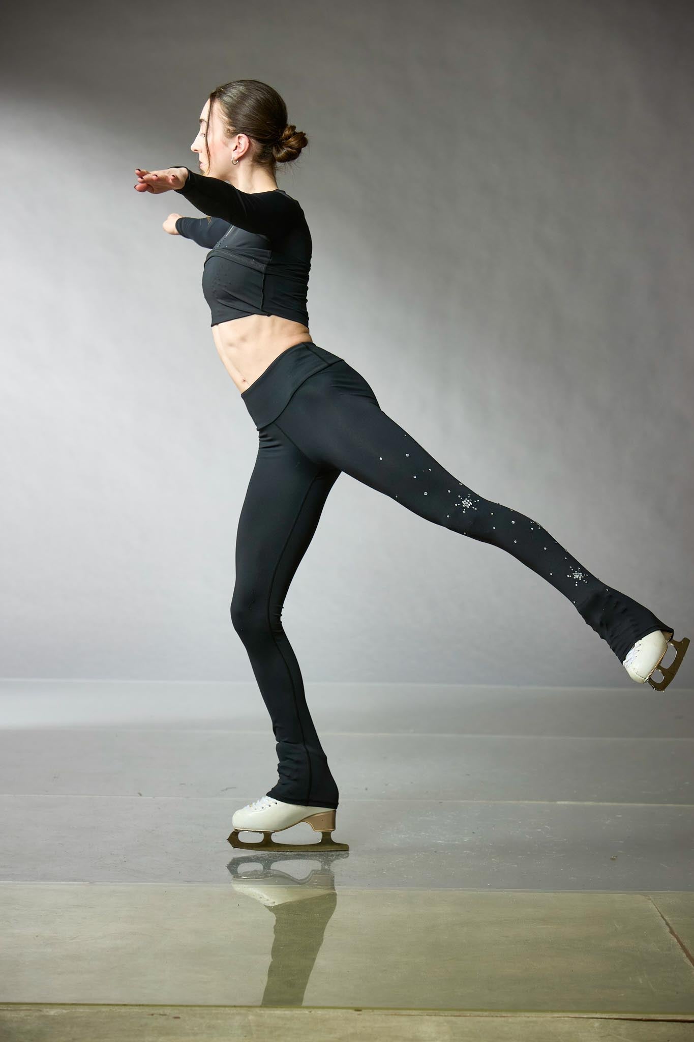 Black figure skating training leggings in Fetex, featuring a wide waistband and a brushed fabric interior for added warmth, with uniquely arranged crystals on the left leg. Designed by Elite Xpression.