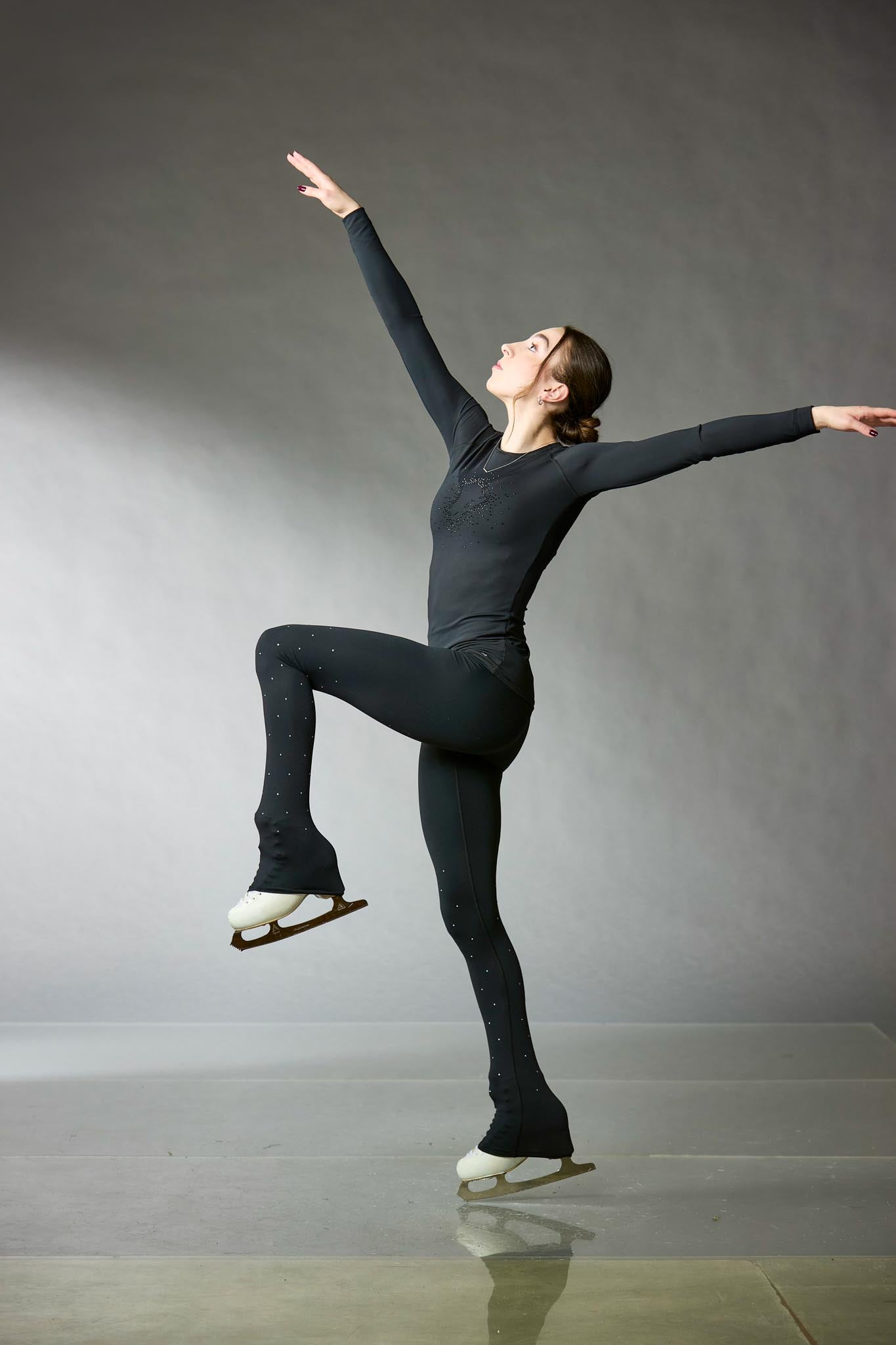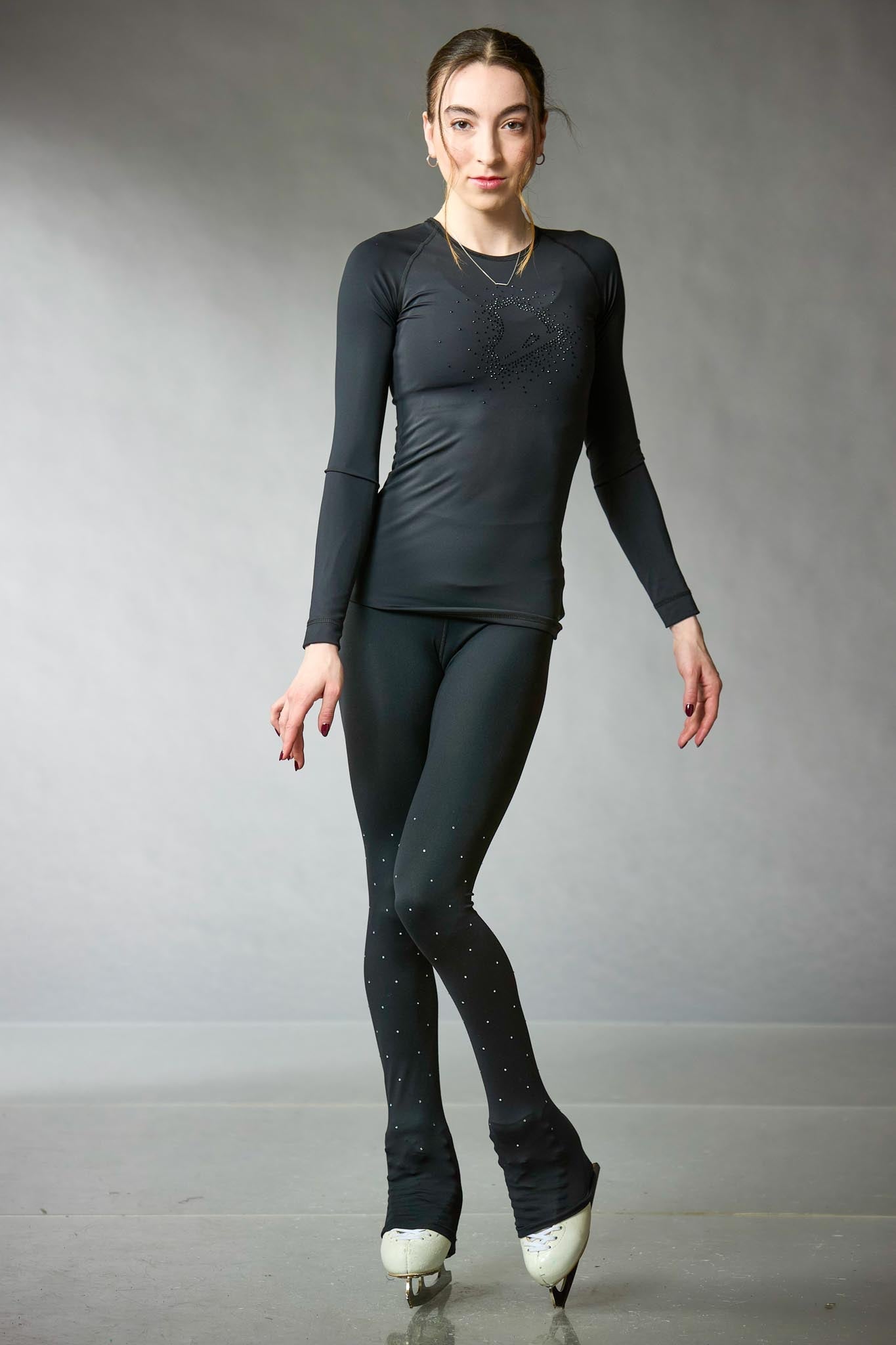 Black figure skating training leggings in Fetex, featuring a wide waistband and a brushed fabric interior for added warmth, with uniquely arranged crystals on the left leg. Designed by Elite Xpression.