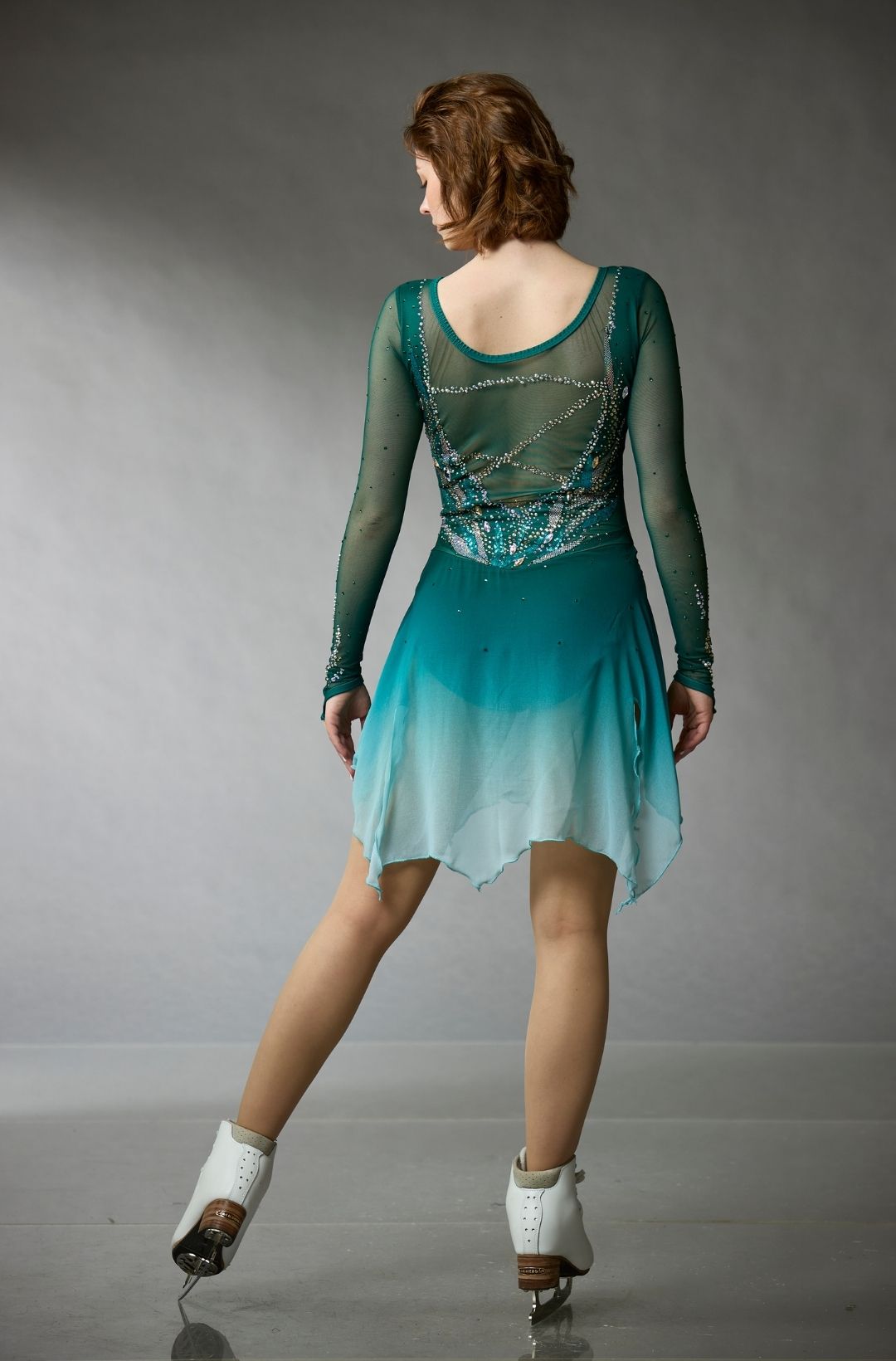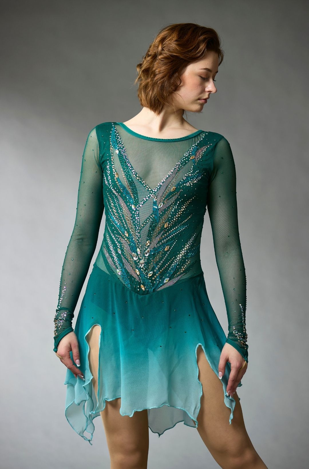Magnificent competition dress featuring a mesh bodice adorned with gold and silver crystals and appliqués. The dress includes long mesh sleeves, a gradient chiffon skirt with pointed edges, and an open back covered with mesh. From the Elite Xpression One of a Kind collection.