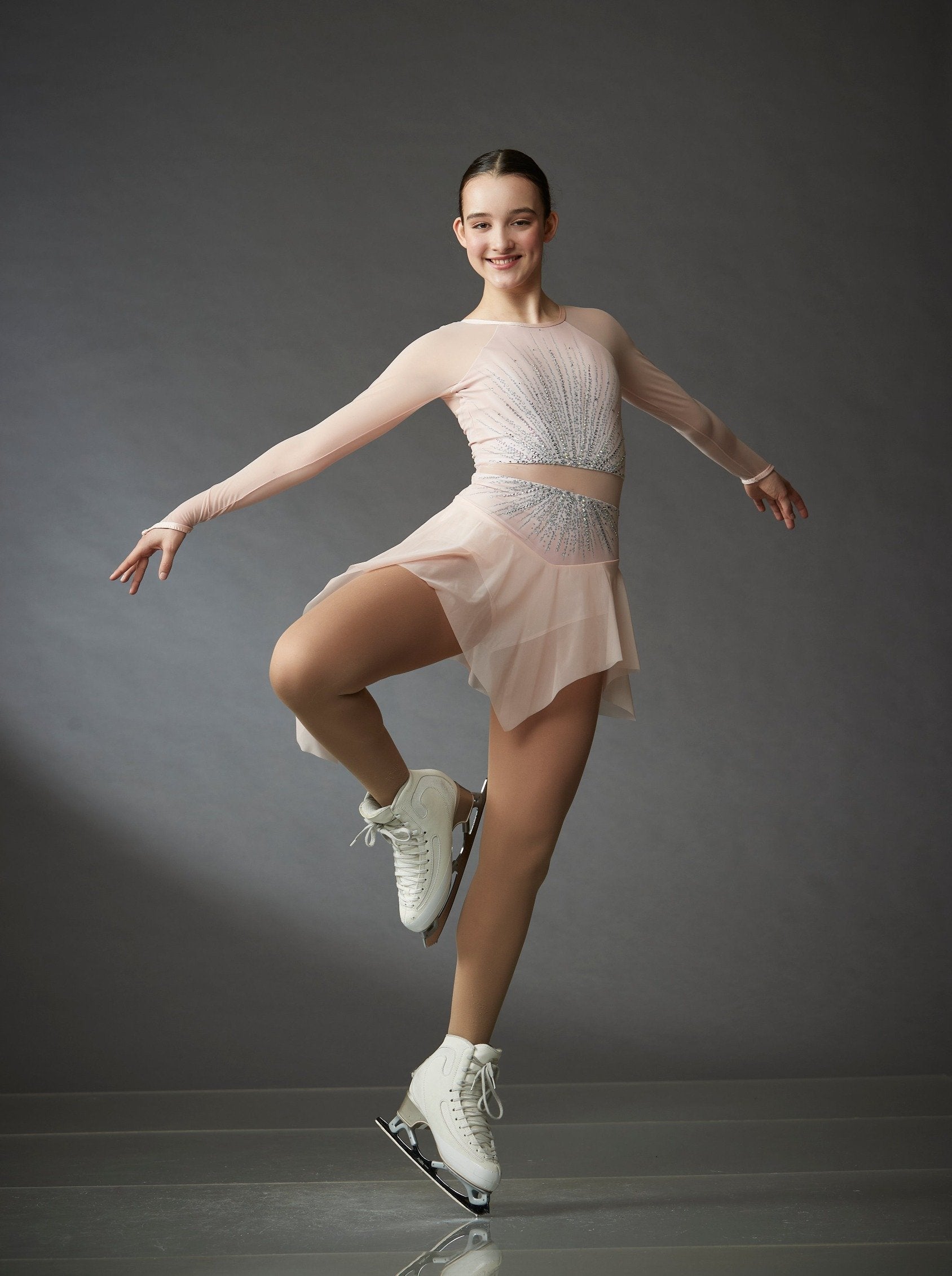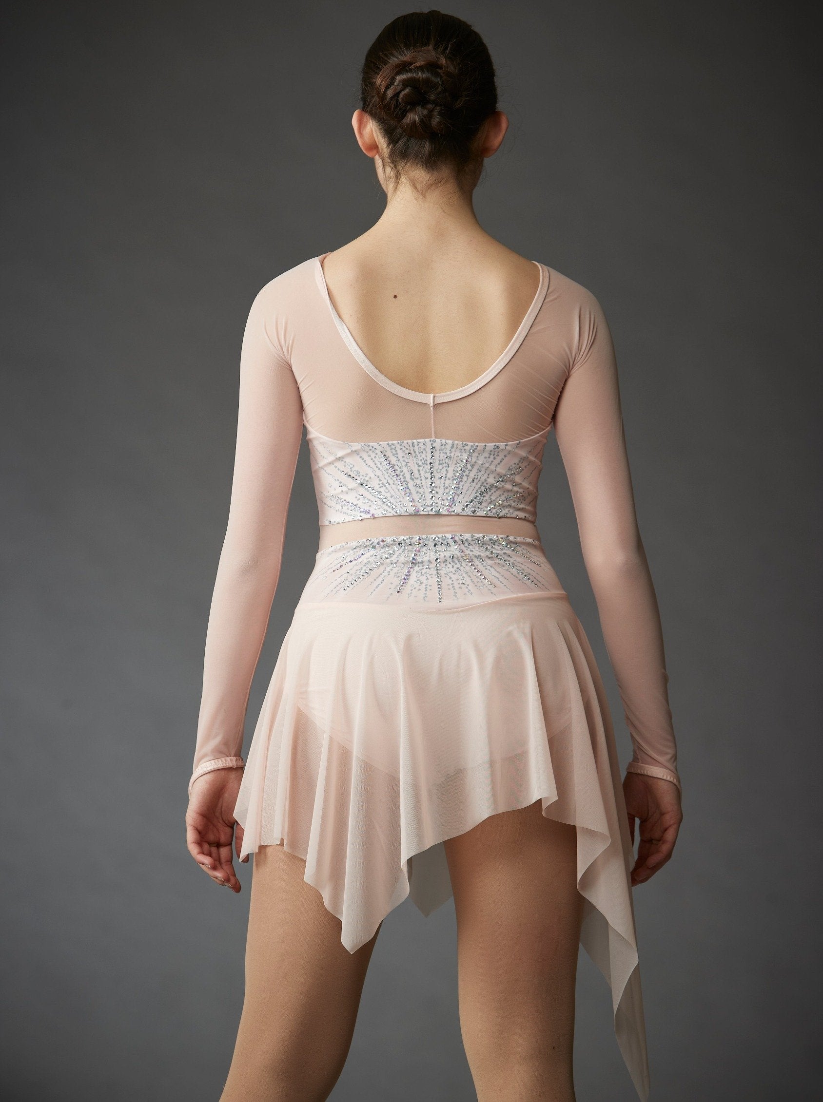 Stunning blush figure skating crop top dress by Elite Xpression, featuring mesh long sleeves, an asymmetrical one-layer mesh skirt, a printed bodice, and crystal embellishments.