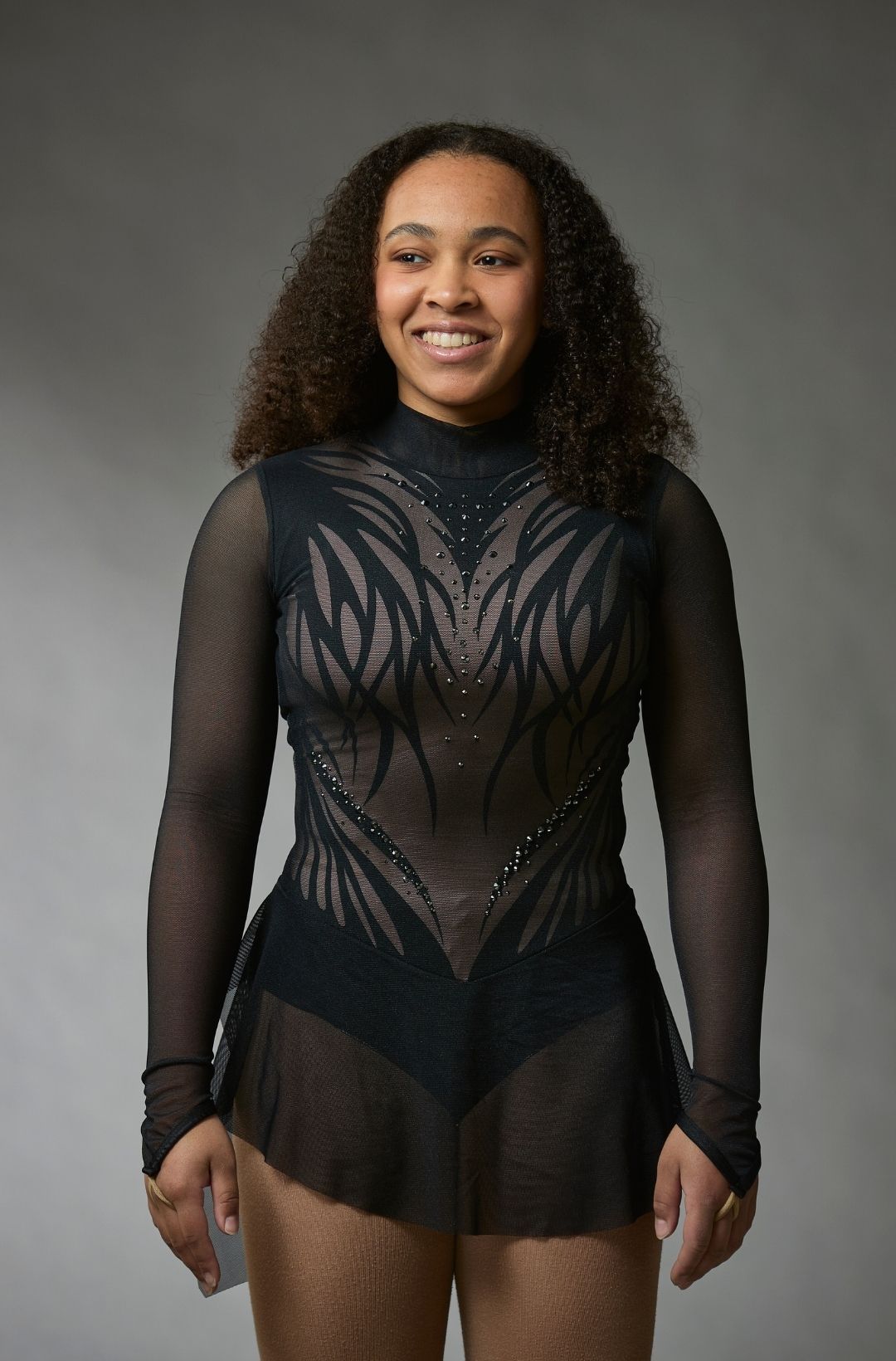 Striking black figure skating dress by Elite Xpression, featuring sheer mesh sleeves, a deep V-front, and swirling black motifs accented with rhinestones. Finished with a layered mesh skirt for graceful movement on the ice.