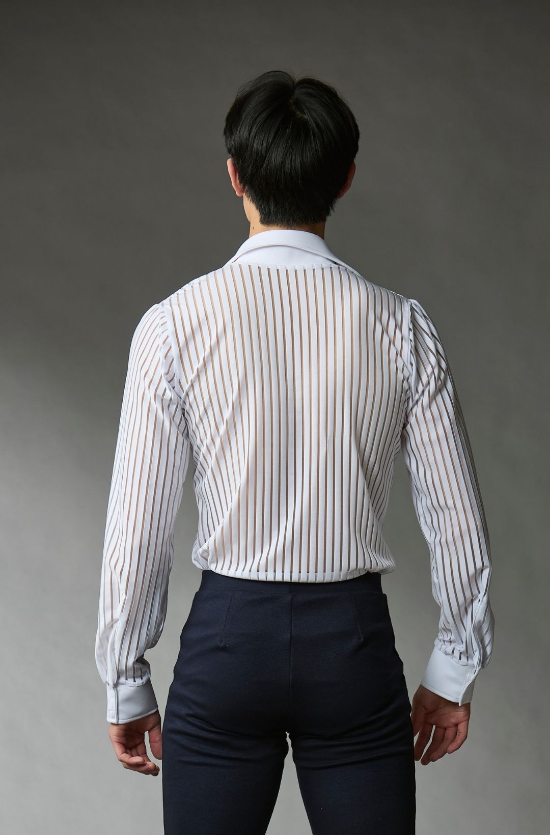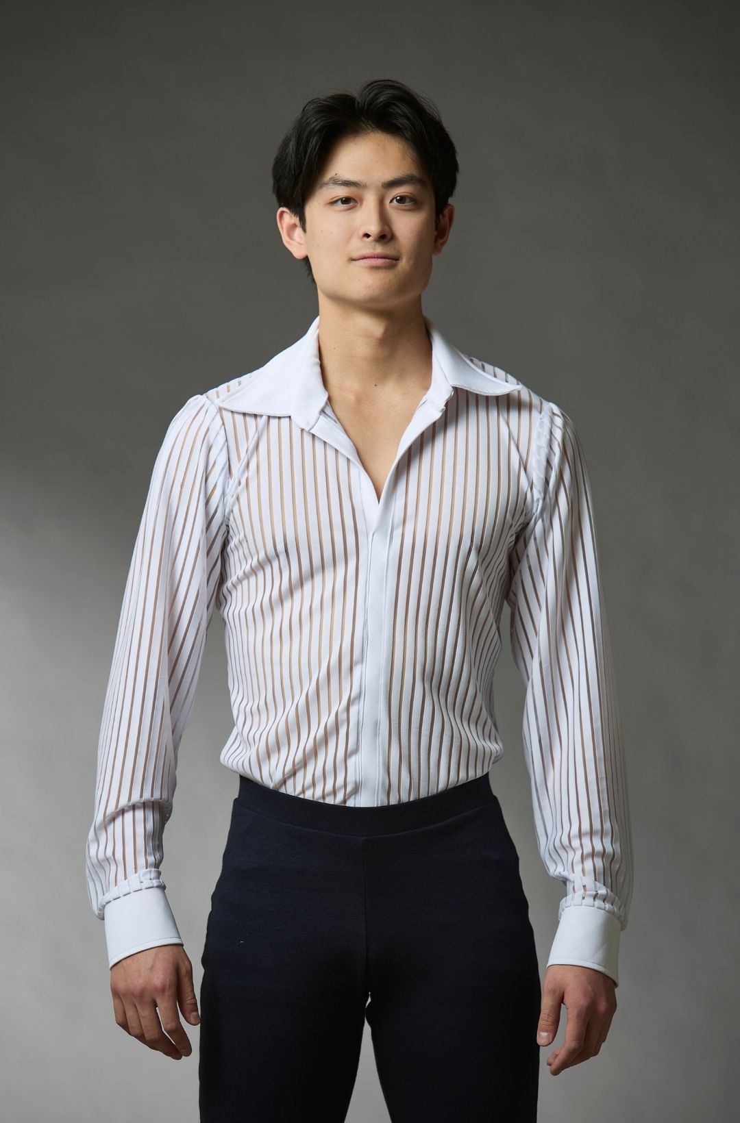 This stylish shirt, crafted from striped soft fabric, combines elegance with high performance. It features a classic collar and snap-button cuffs for a refined look and easy wear. Built-in briefs provide secure support during movement on the ice. Perfect for figure skaters seeking comfort, freedom of motion, and a professional appearance.