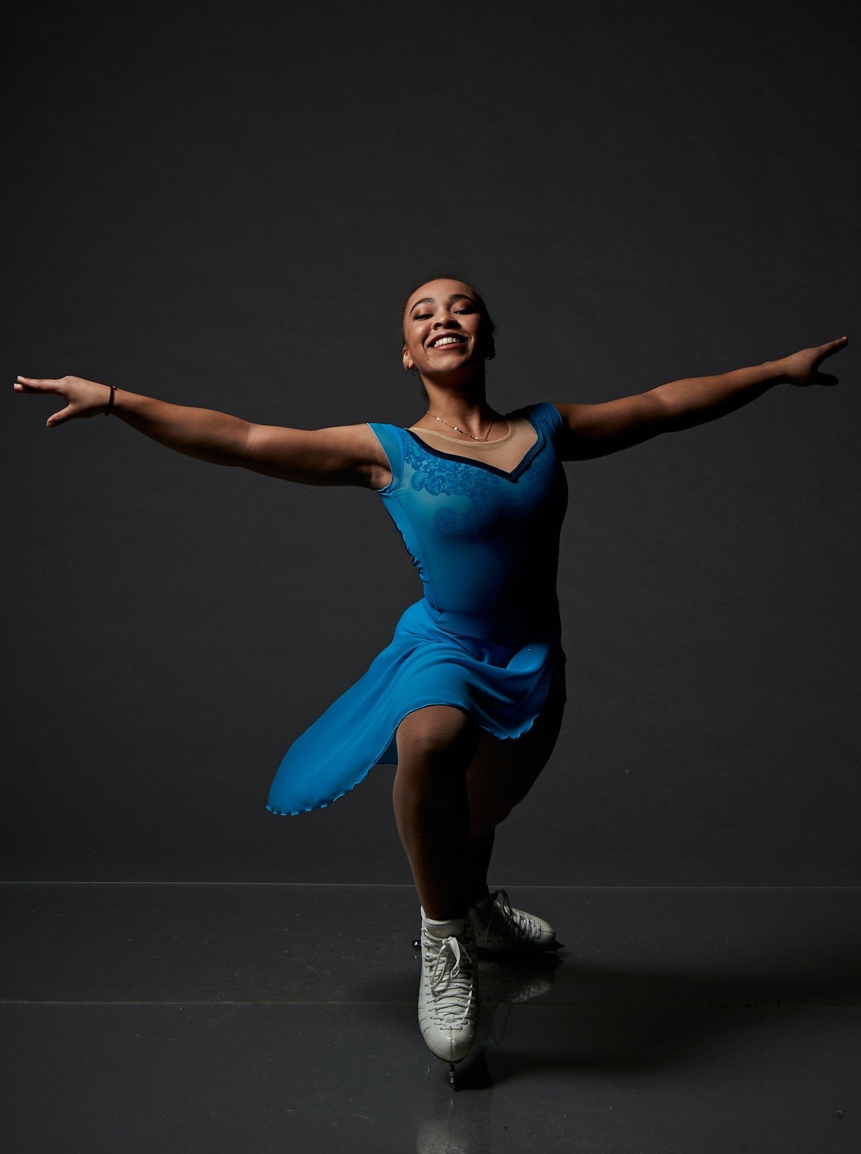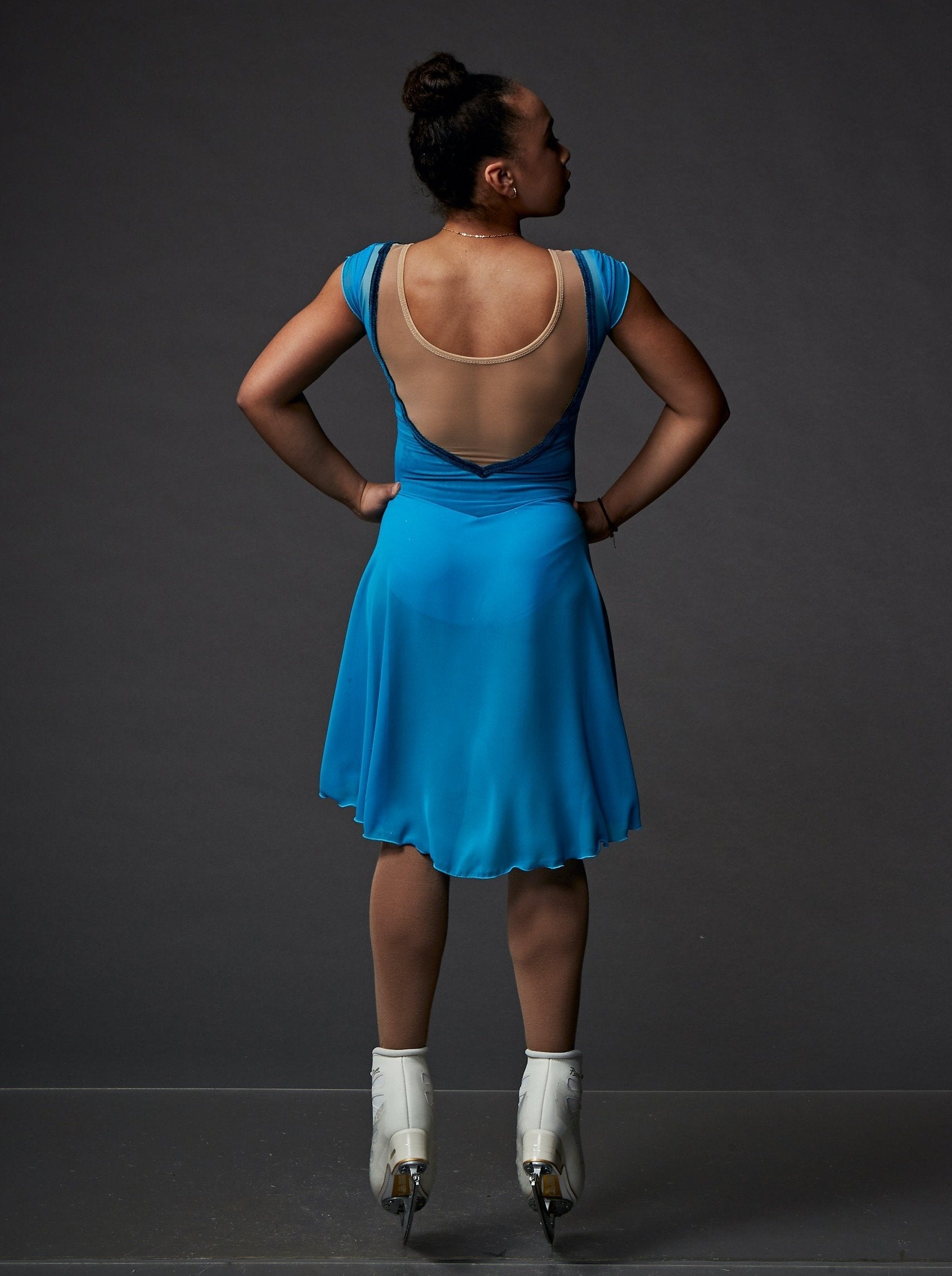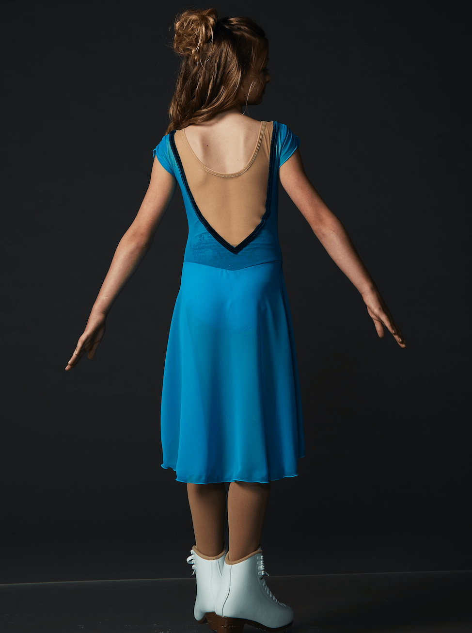 Classic teal dance dress by Elite Xpression, featuring a sublimated bodice with mesh and a flowing chiffon skirt.