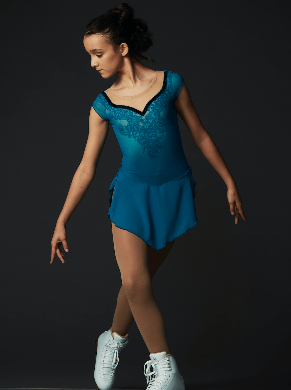 Classic teal dress by Elite Xpression, featuring a sublimated bodice with mesh and a chiffon skirt.