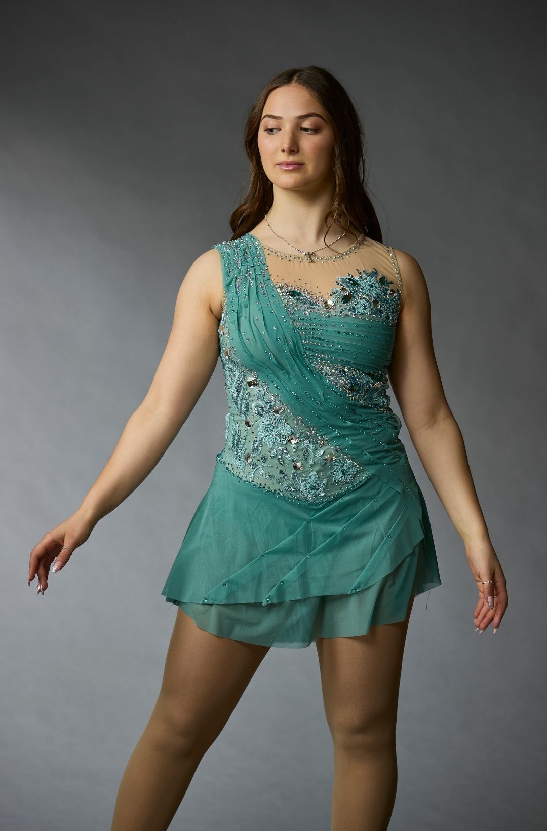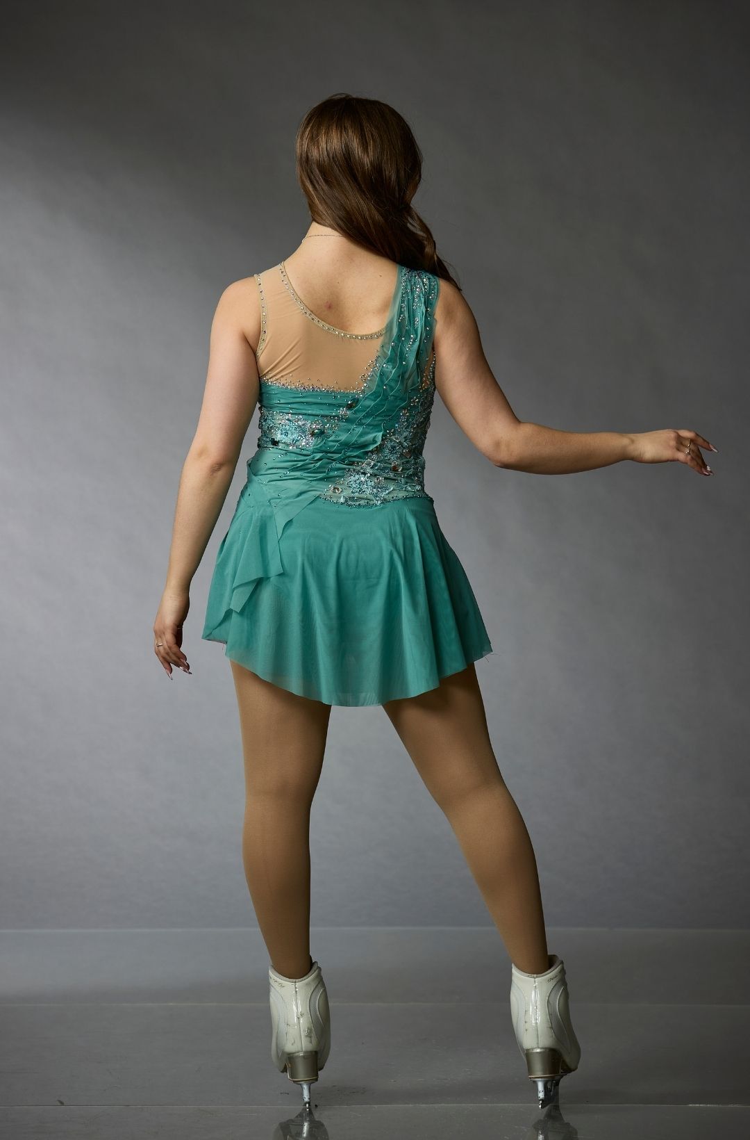 Exquisite mint competition dress for figure skating featuring a single-layer satin skirt. The sleeveless mesh bodice is beautifully embellished with crystals and delicate floral appliqués. This elegant design is part of the EliteXpression One of a Kind collection.