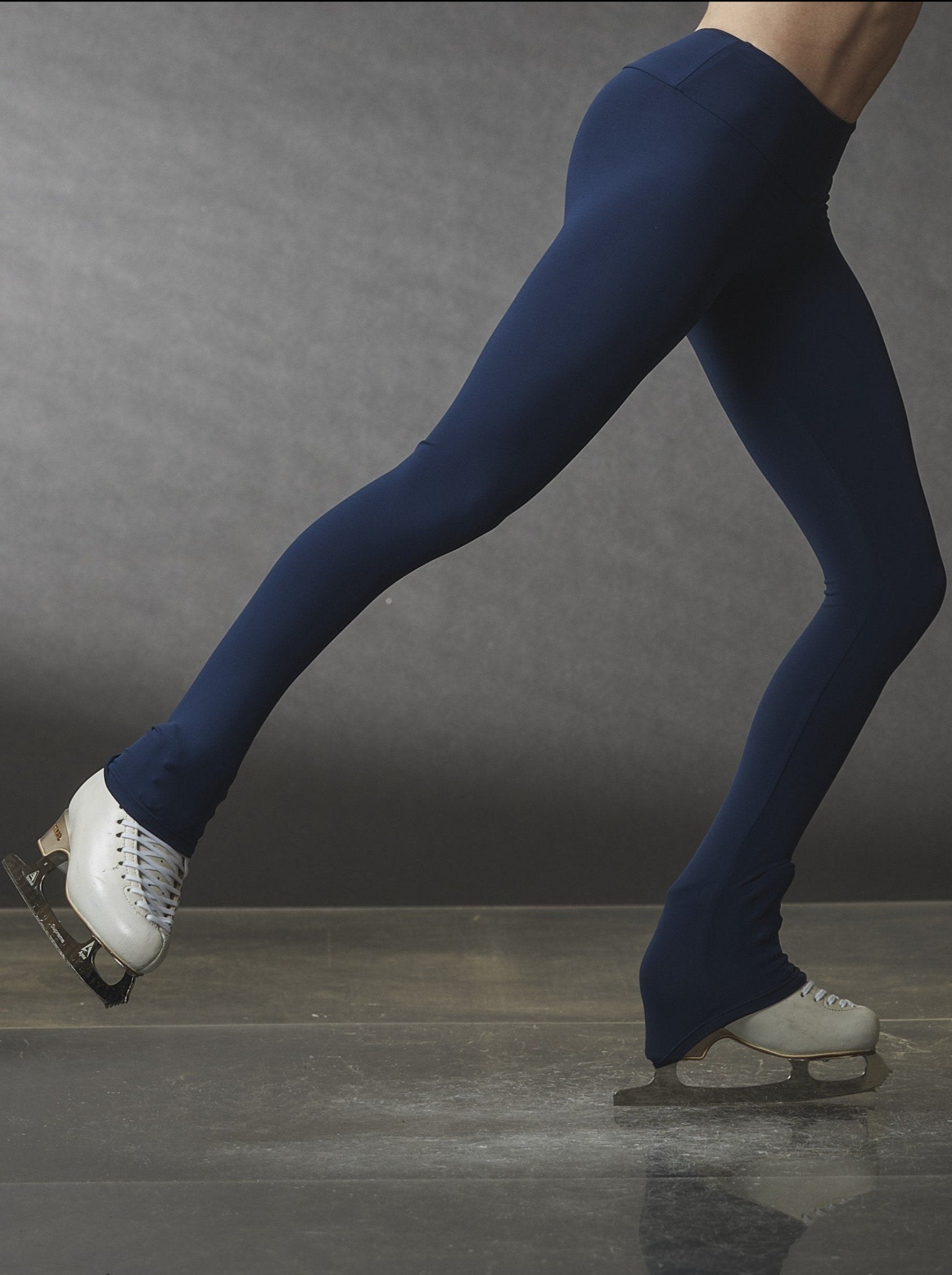 Navy blue figure skating training leggings by Elite Xpression, made from Lycra fabric and featuring a large waistband.