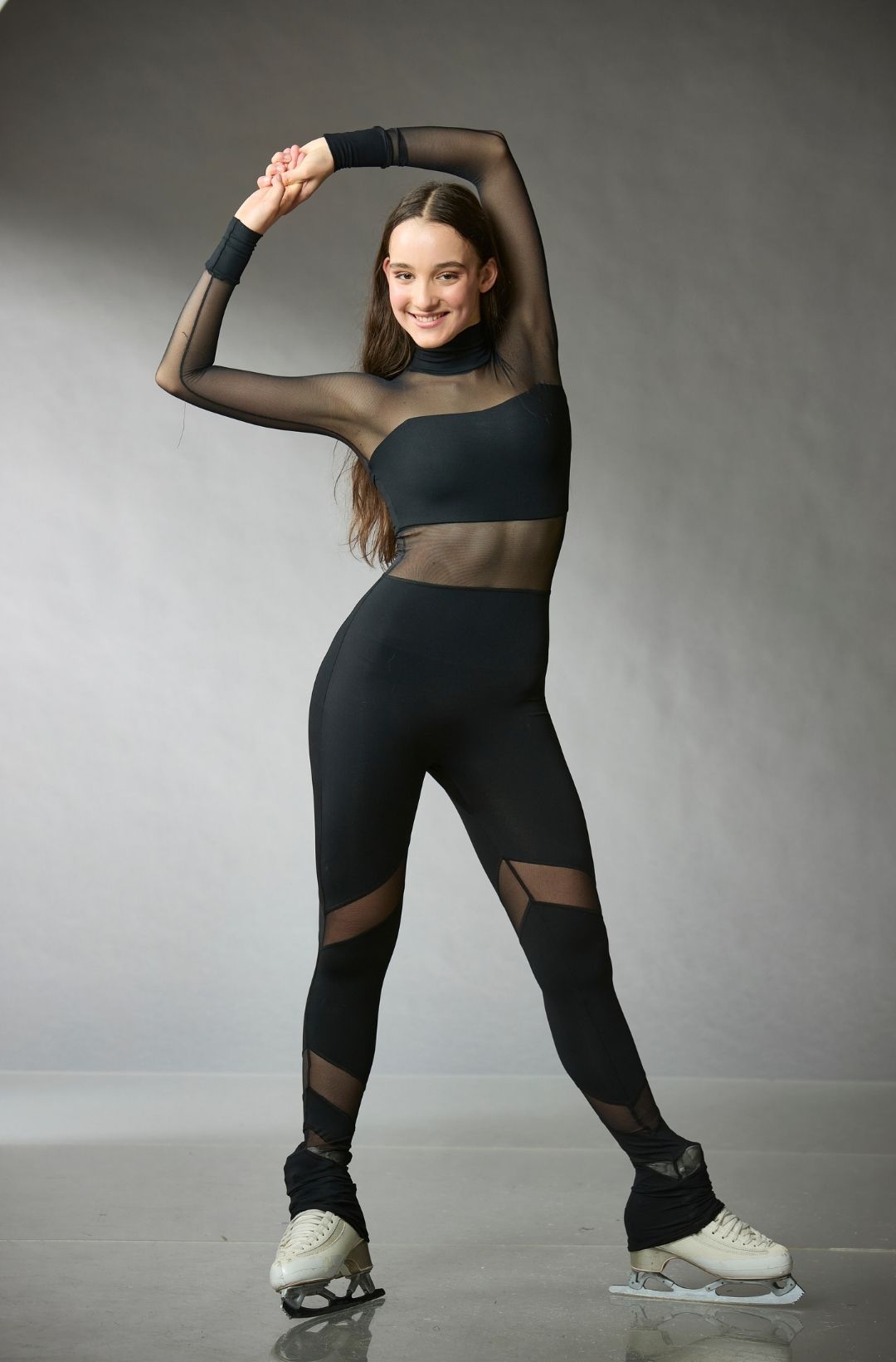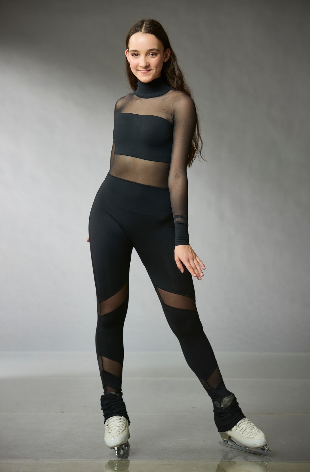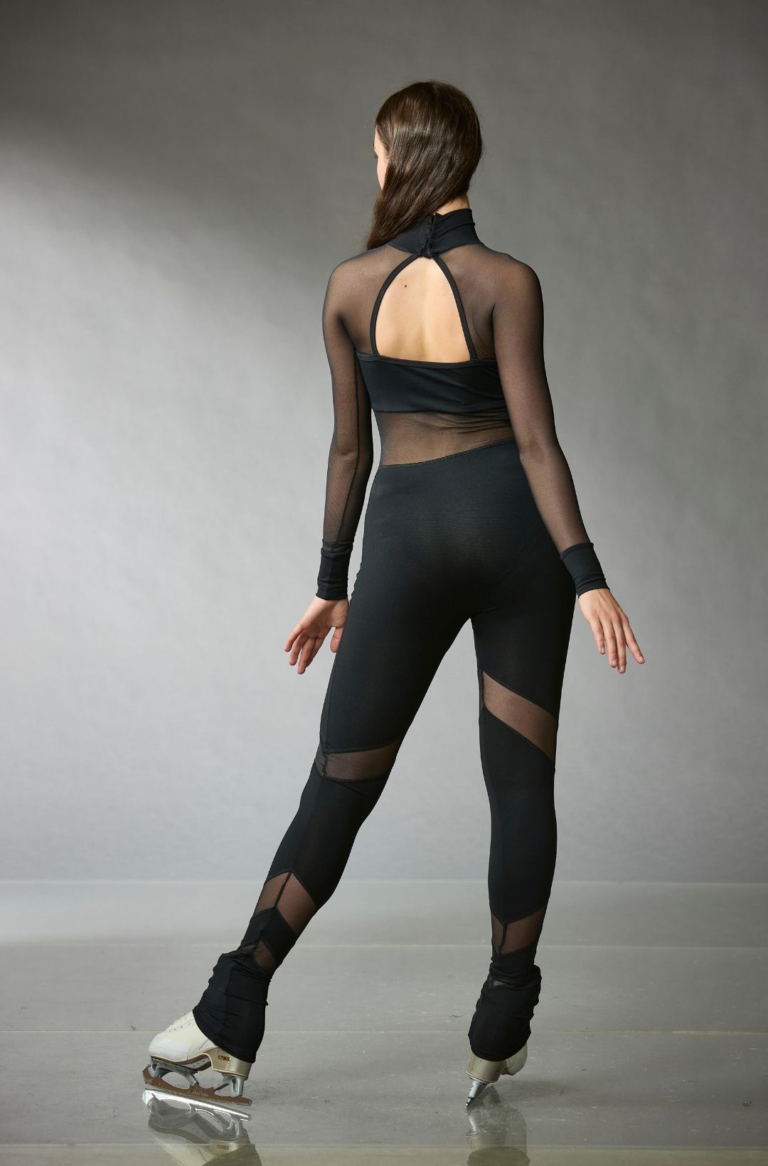 Black Supplex one-piece training outfit with long black mesh sleeves, a mesh panel at the midsection and inserts at the legs, designed by Elite Xpression for figure skating or dance.