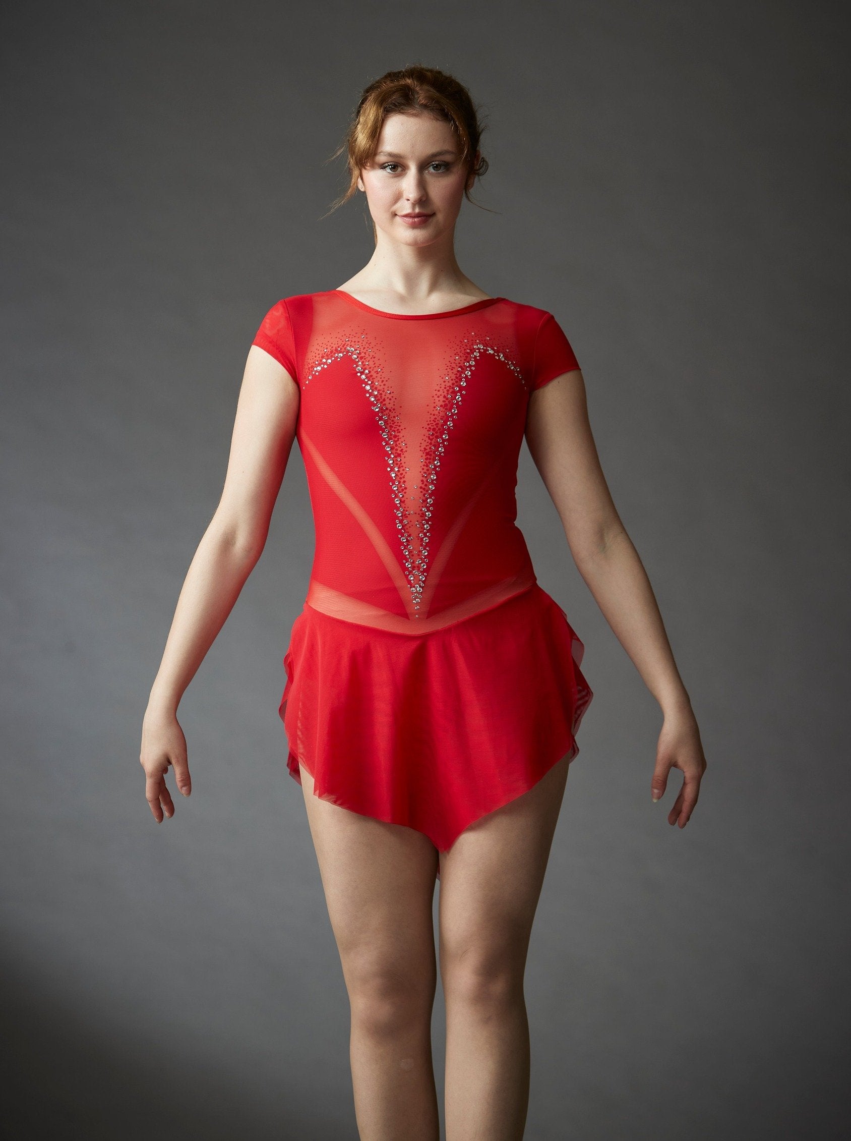 An elegant and versatile red figure skating dress made from mesh fabric, featuring graceful cap sleeves and a double-layered mesh skirt. The bodice showcases delicate red mesh, beautifully embellished with shimmering crystals for a refined touch of sparkle. Crafted by Elite Xpression.