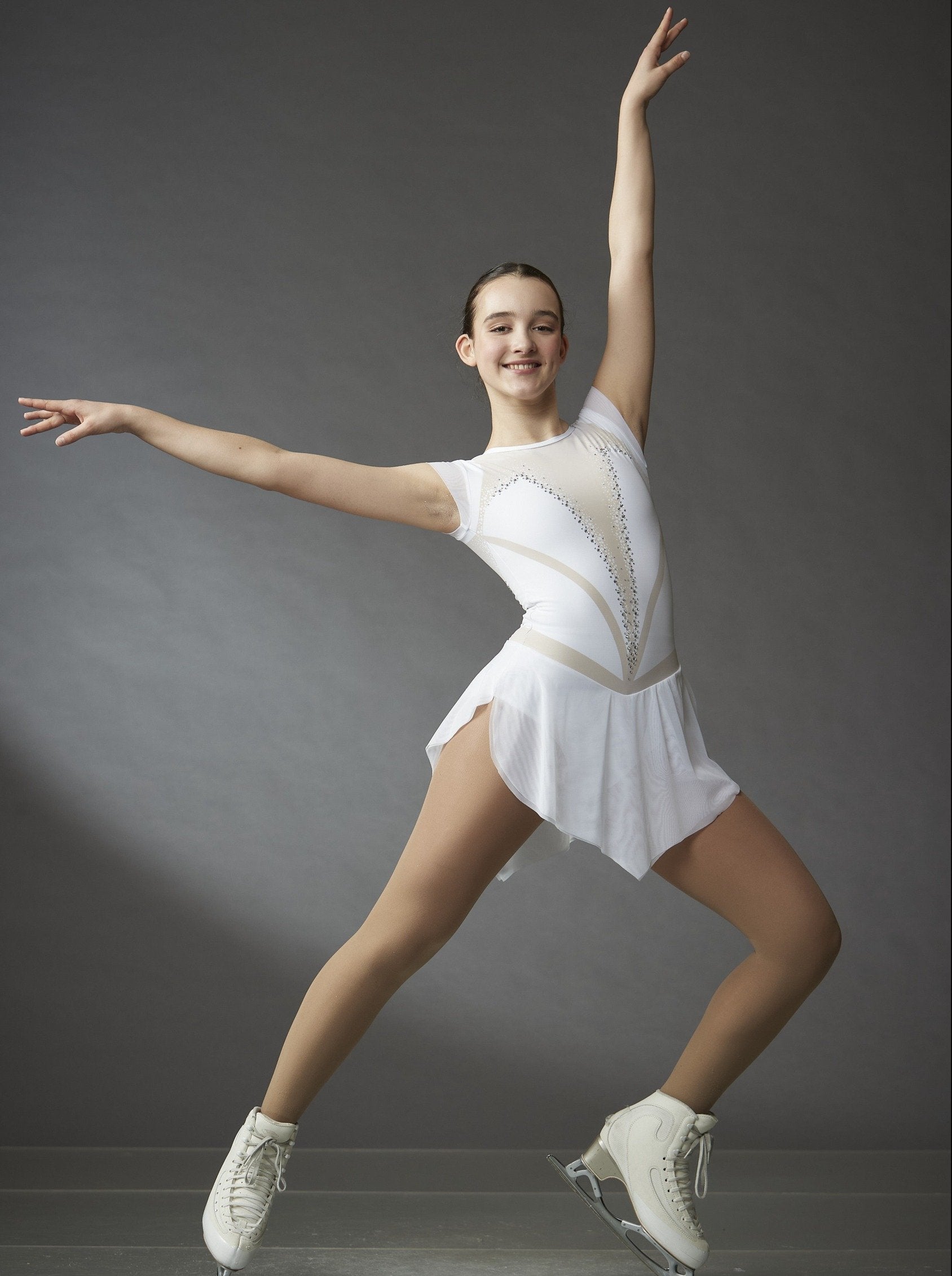 An elegant and versatile white figure skating dress made from mesh fabric, featuring graceful cap sleeves and a double-layered mesh skirt. The bodice showcases delicate white mesh, beautifully embellished with shimmering crystals for a refined touch of sparkle. Crafted by Elite Xpression.