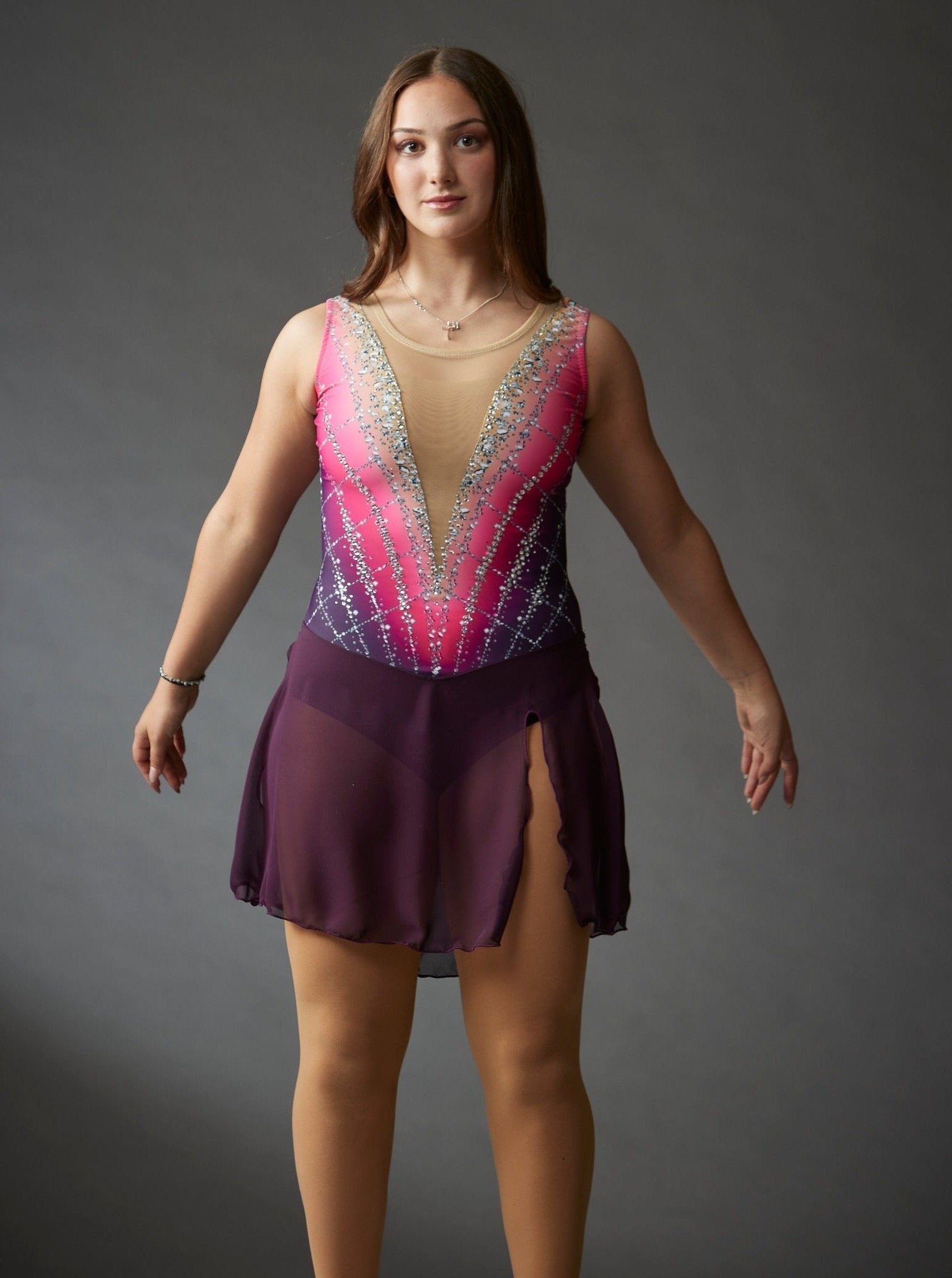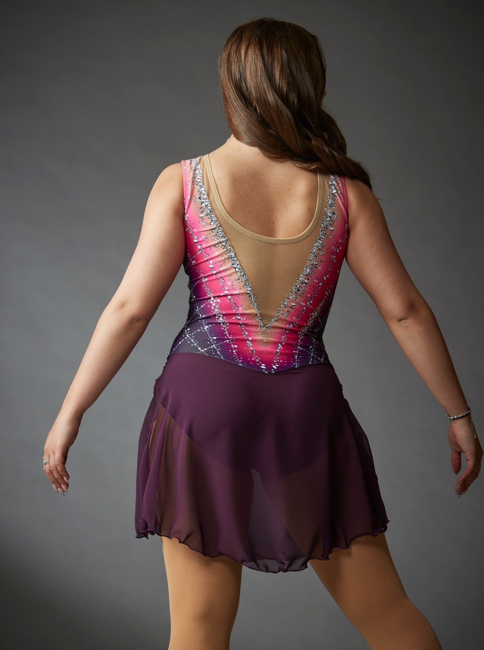 Sleeveless figure skating dress with a gem-printed bodice in a plum fade-out, adorned with crystal embellishments and finished with a single-layer chiffon skirt. Meticulously crafted by Elite Xpression.