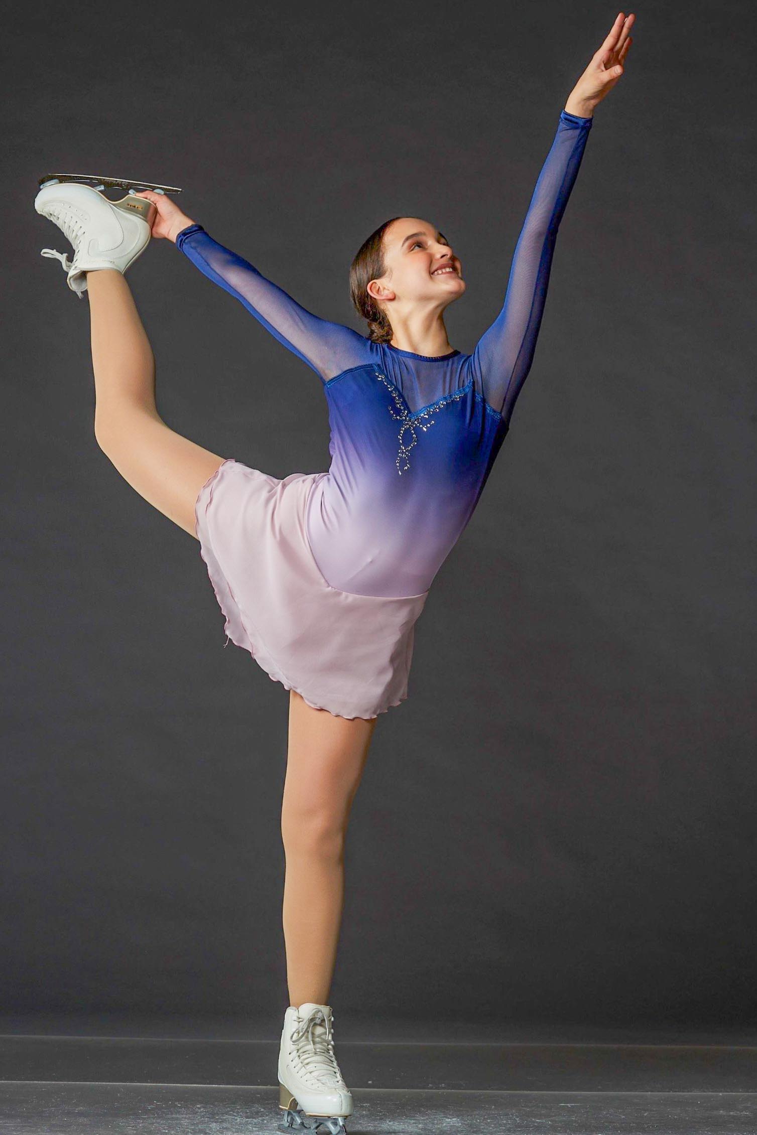 Faded dress featuring a blue bodice that transitions to light pink, embellished with crystals and complemented by a double-layer chiffon skirt. From the Elite Xpression collection.