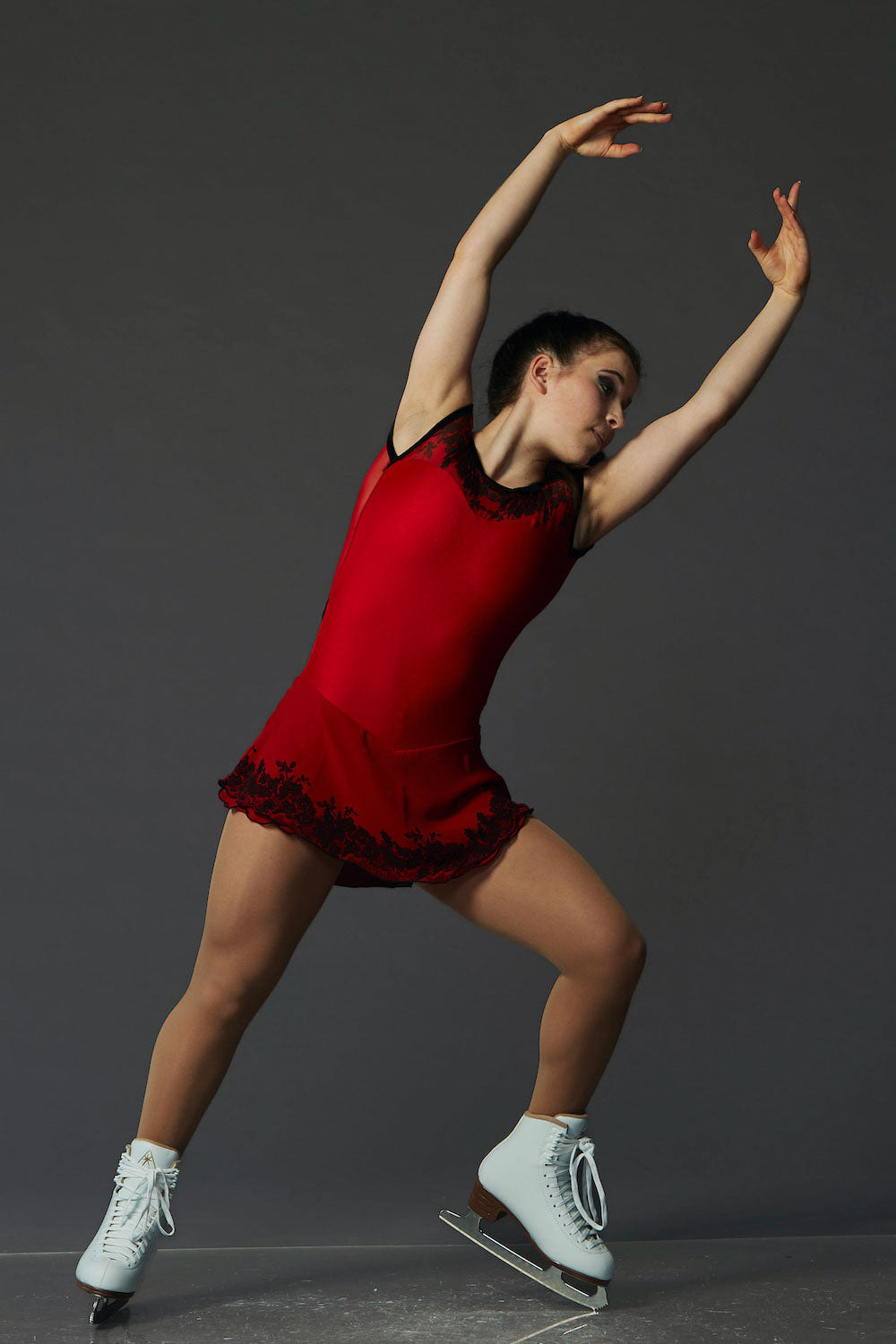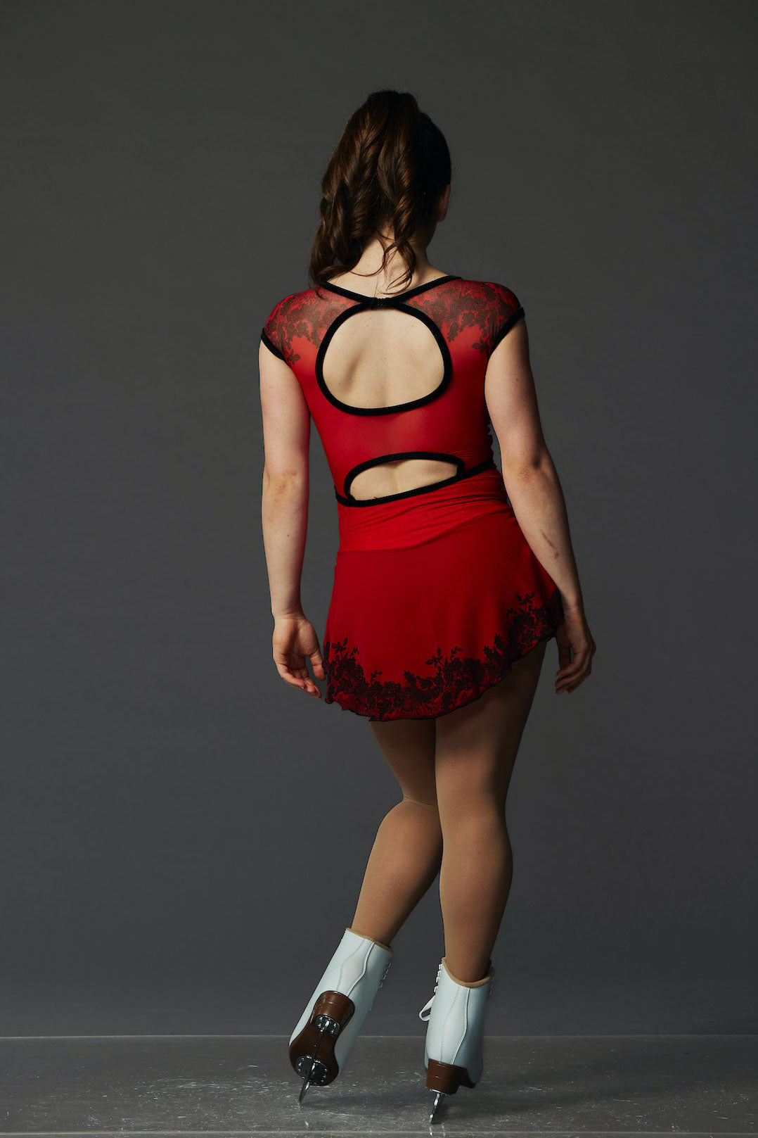 Red figure skating dress with an open back, featuring mesh printed with a black lace pattern and a chiffon skirt. Crafted by Elite Xpression. Also available in royal blue.