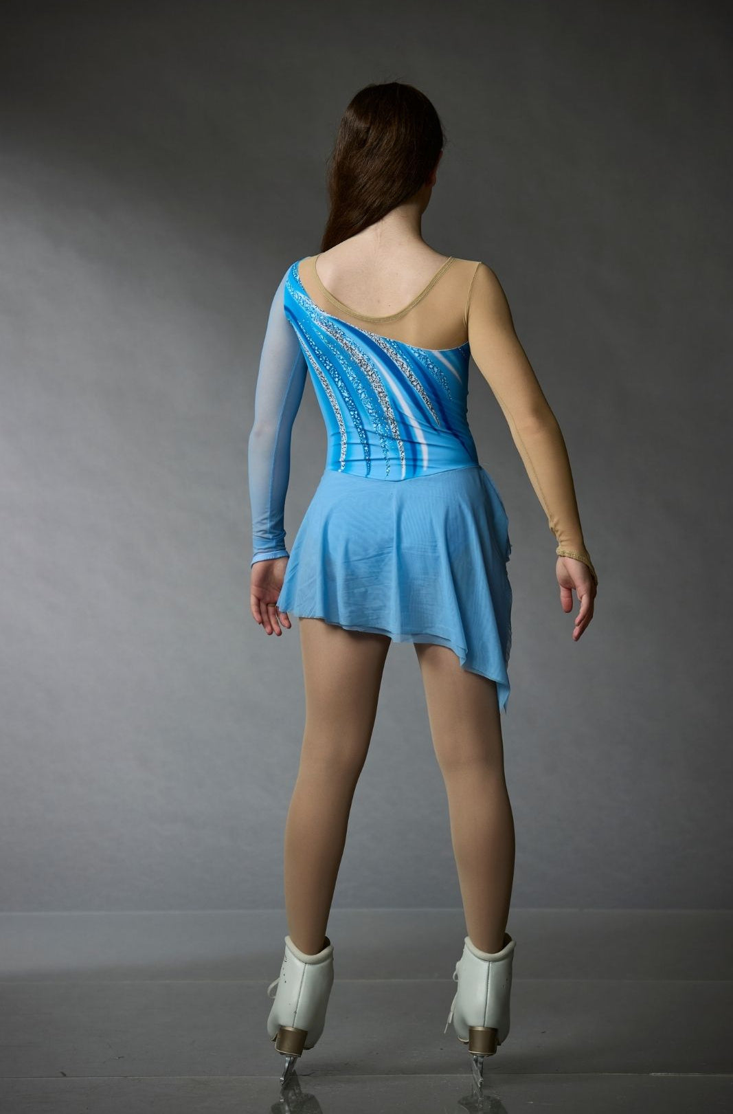 Light blue figure skating dress with a printed bodice, mesh sleeves, and a two-layer oblong mesh skirt from the Elite Xpression Collection.