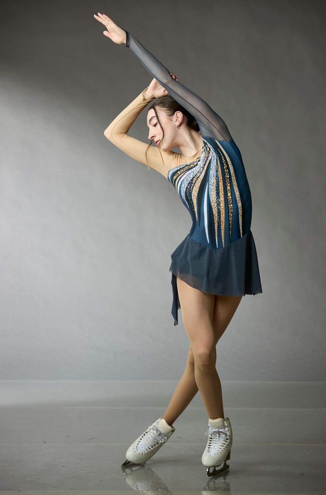Charcoal figure skating dress with a printed bodice, mesh sleeves, and a two-layer oblong mesh skirt from the Elite Xpression Collection.