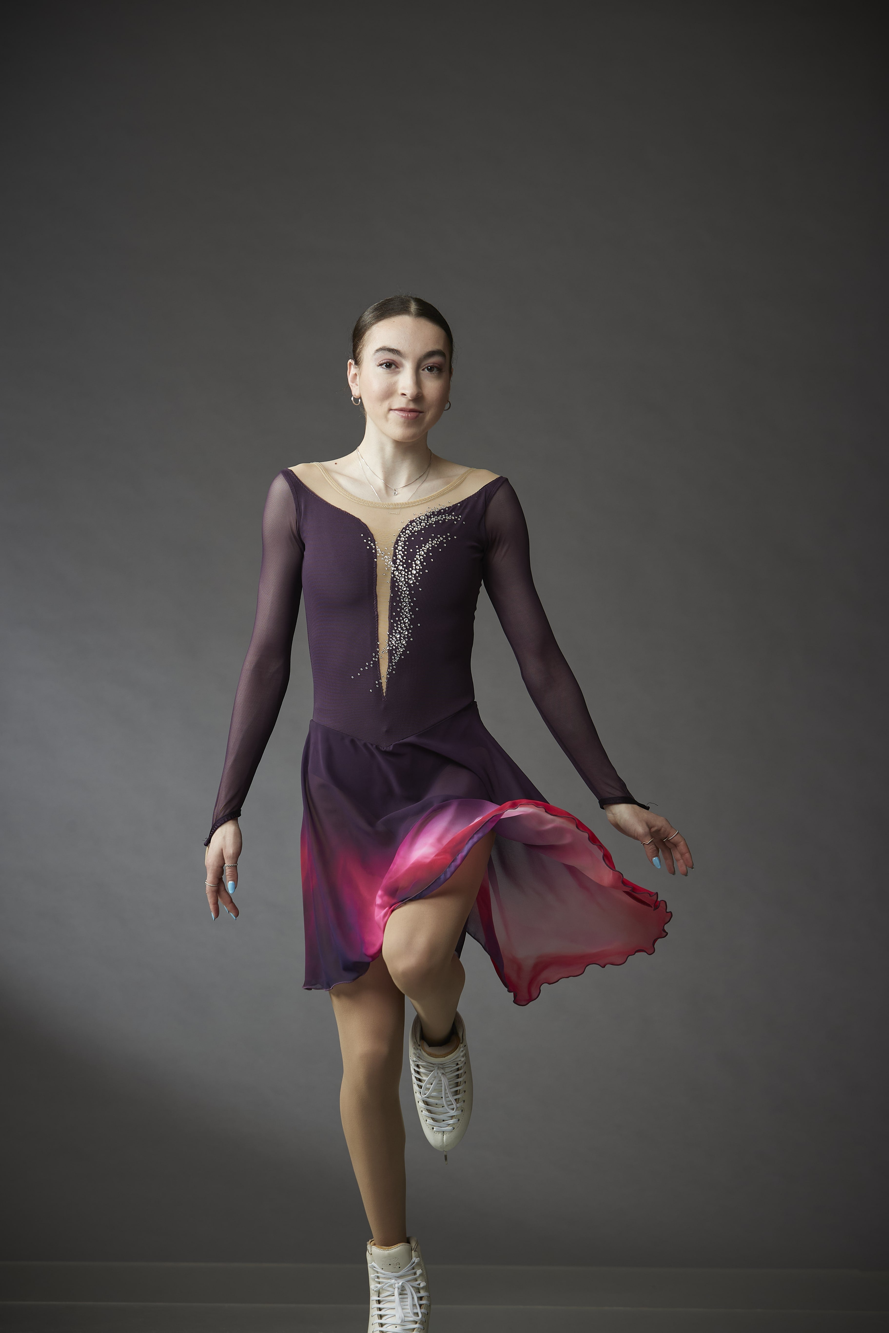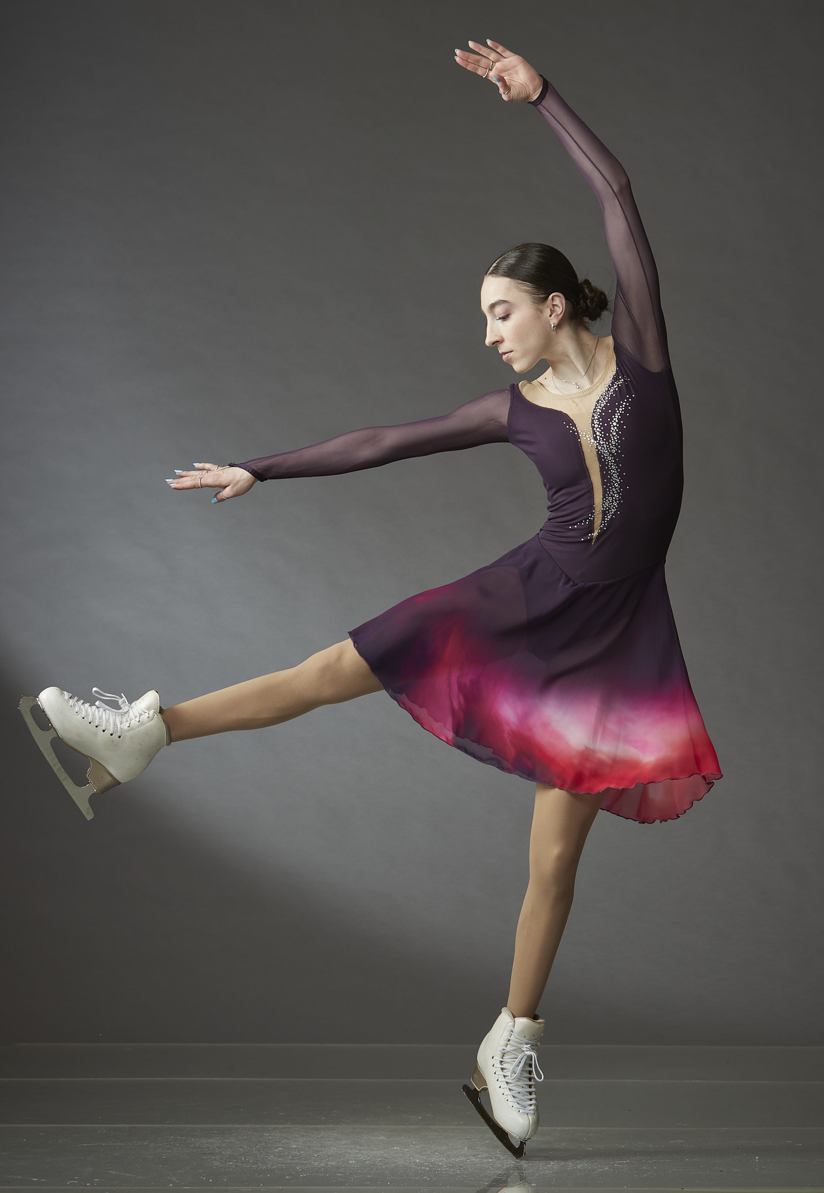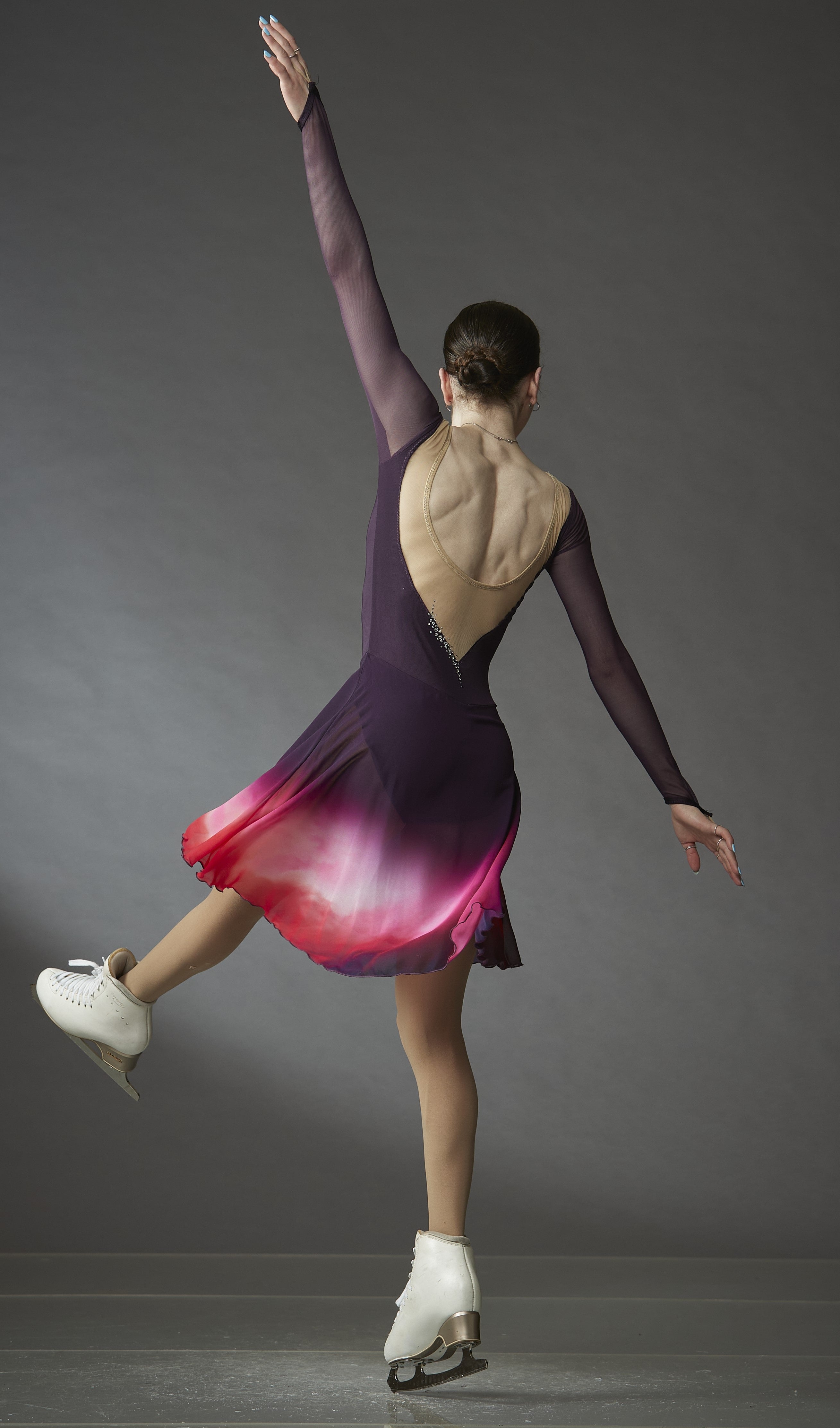 Elegant plum figure skating dress — perfect for dance or synchronized skating — featuring long mesh sleeves, crystal embellishments, a mesh bodice, and a chiffon skirt printed in rich tones ranging from bright plum to fuchsia. By Elite Xpression.