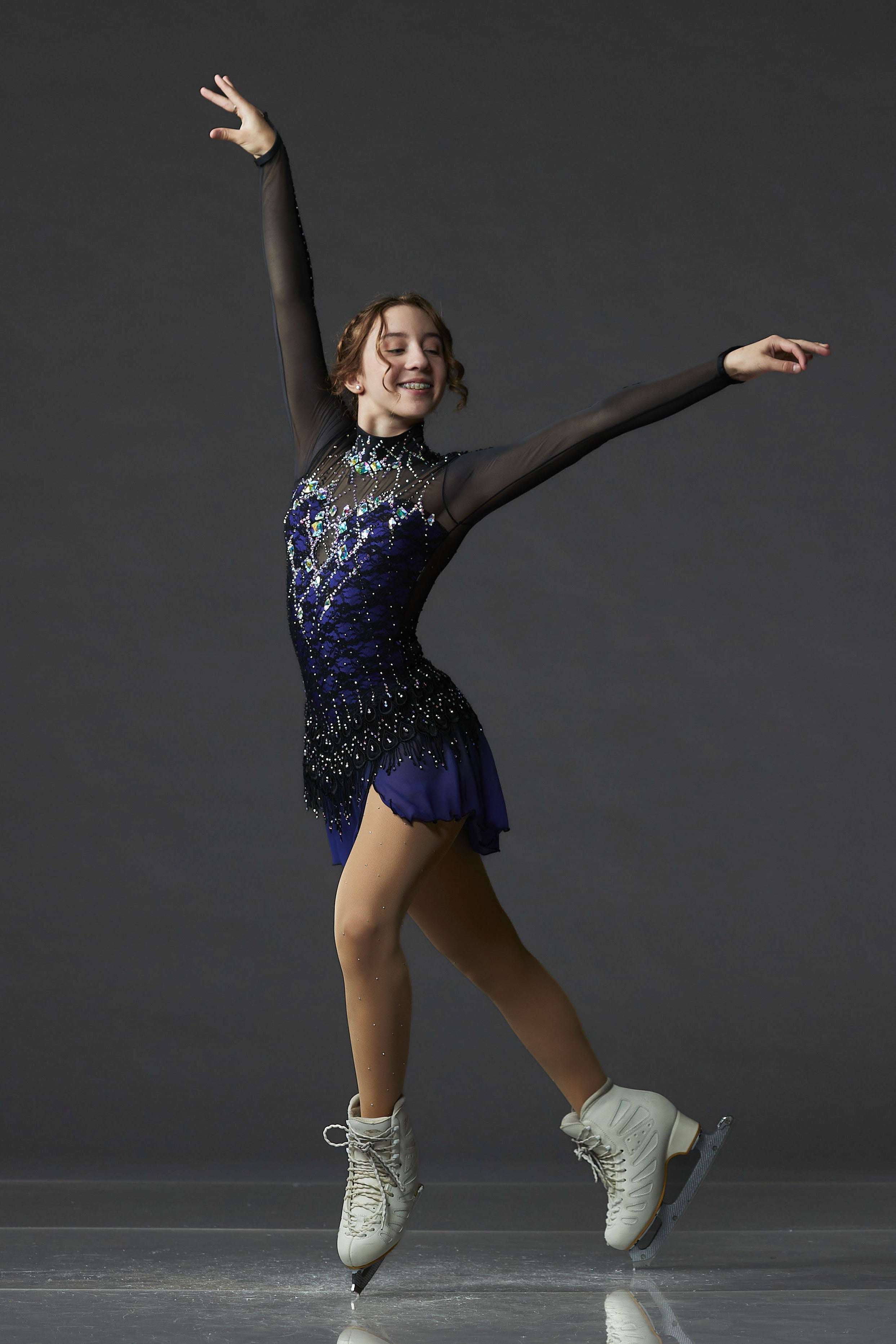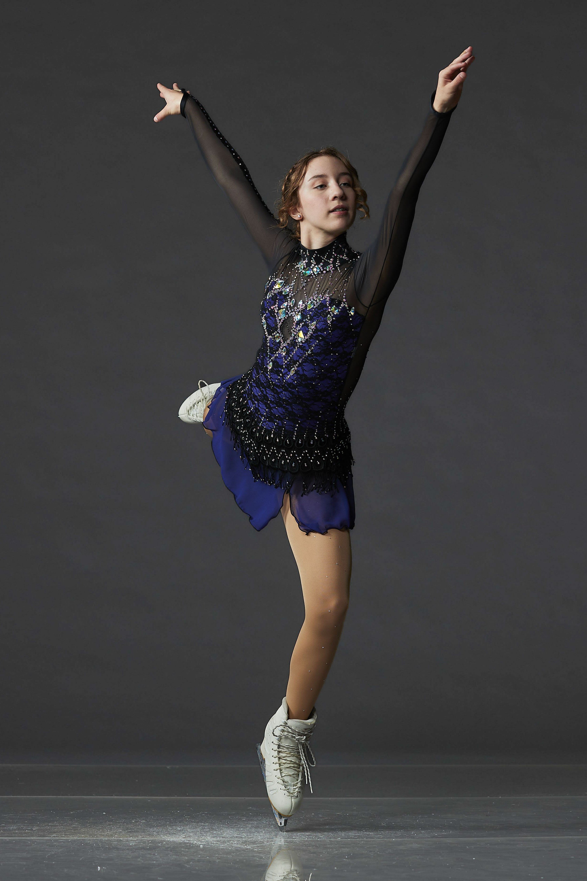 Unique black and purple figure skating competition dress with a lace bodice, long mesh sleeves decorated with appliqués and crystals, and a chiffon skirt embellished with lace and crystals. From the Collection One of a Kind by Elite Xpression.