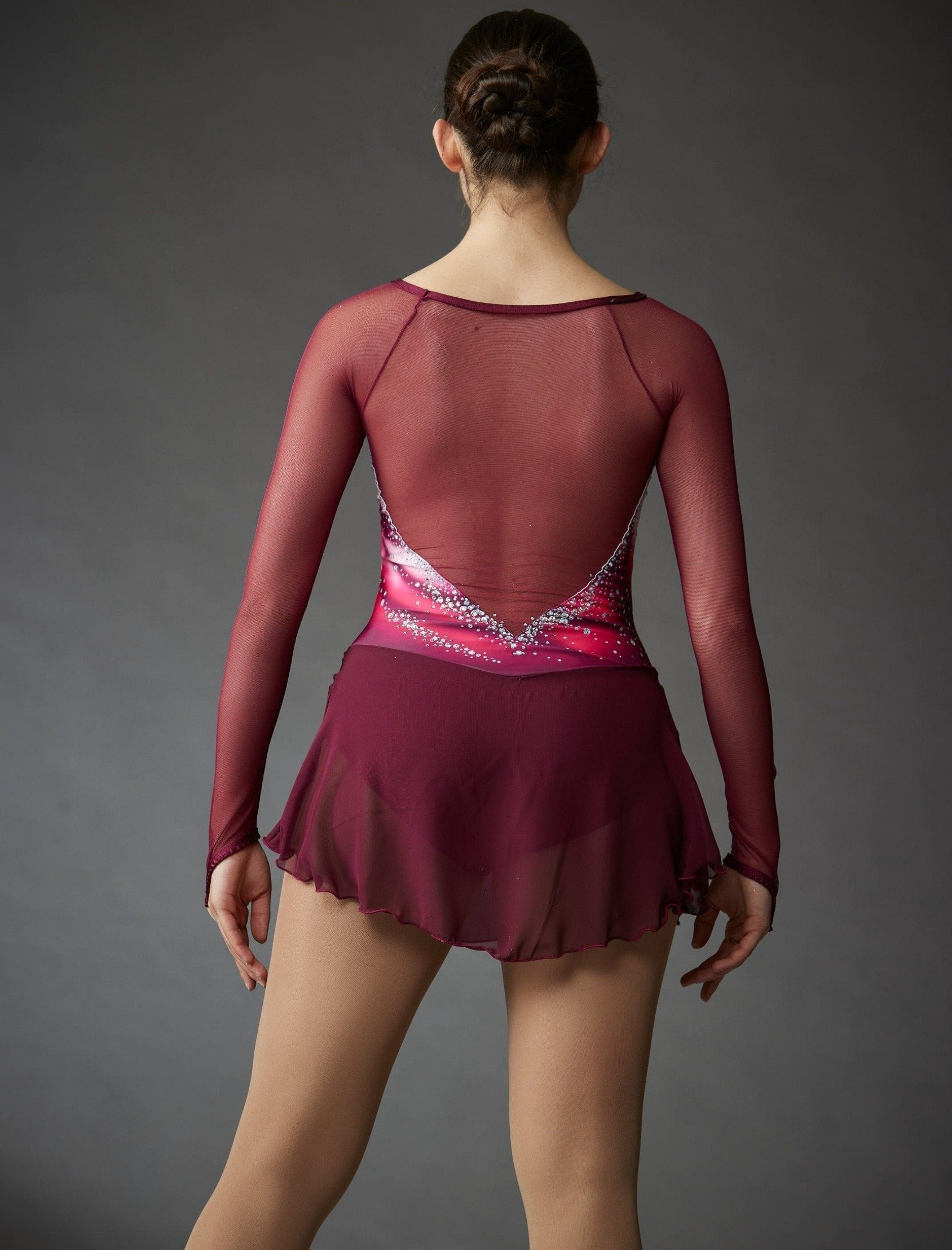 Robe de patinage artistique à manches longues en maille, avec un corsage imprimé bordeaux en fondu enchaîné, orné de cristaux pour ajouter de l'éclat, par Elite Xpression.