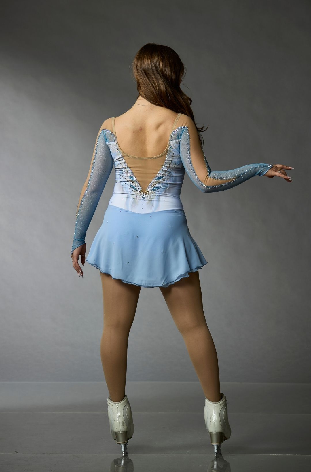 Délicate robe de patinage artistique de la collection One of a Kind d'Elite Xpression, d'une douce teinte bleu glacé, avec des manches longues transparentes. Le corsage est orné d'embellissements complexes en cristal et en plumes, et est magnifiquement complété par un dos en V profond. Avec sa jupe évasée, elle est parfaite pour une performance gracieuse et onirique sur la glace.
