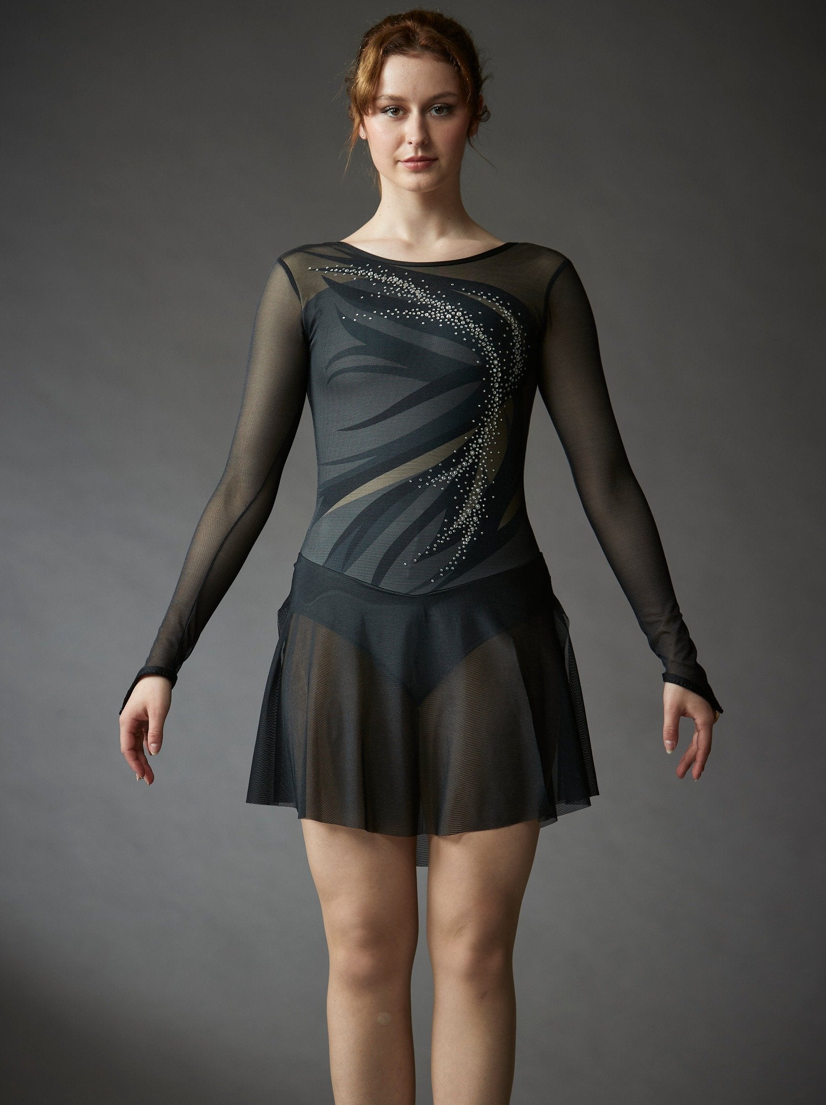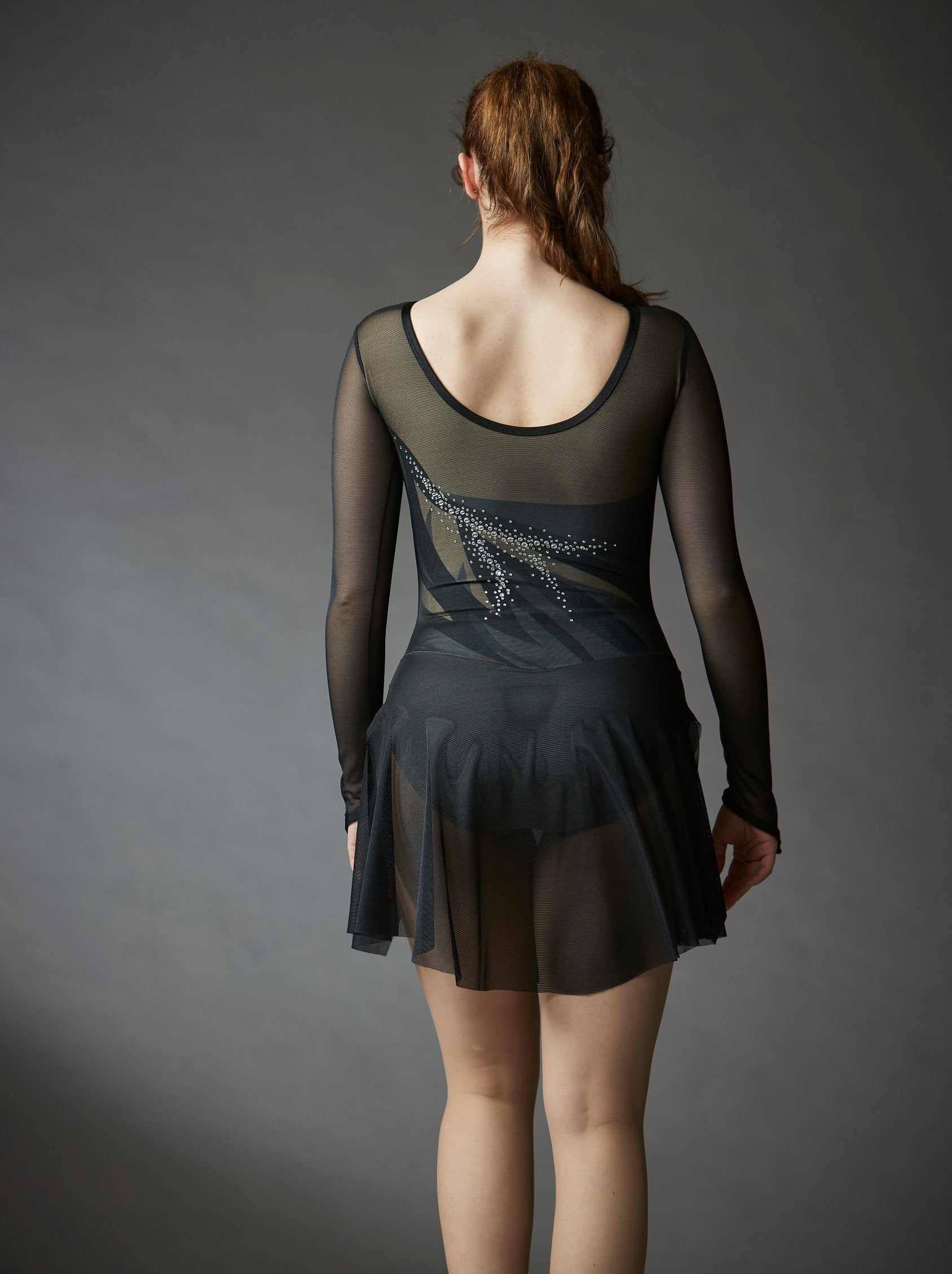 Robe de patinage artistique noire intemporelle ornée de cristaux étincelants, dotée de manches longues en maille et d'une jupe en maille simple avec fentes, conçue par Elite Xpression.