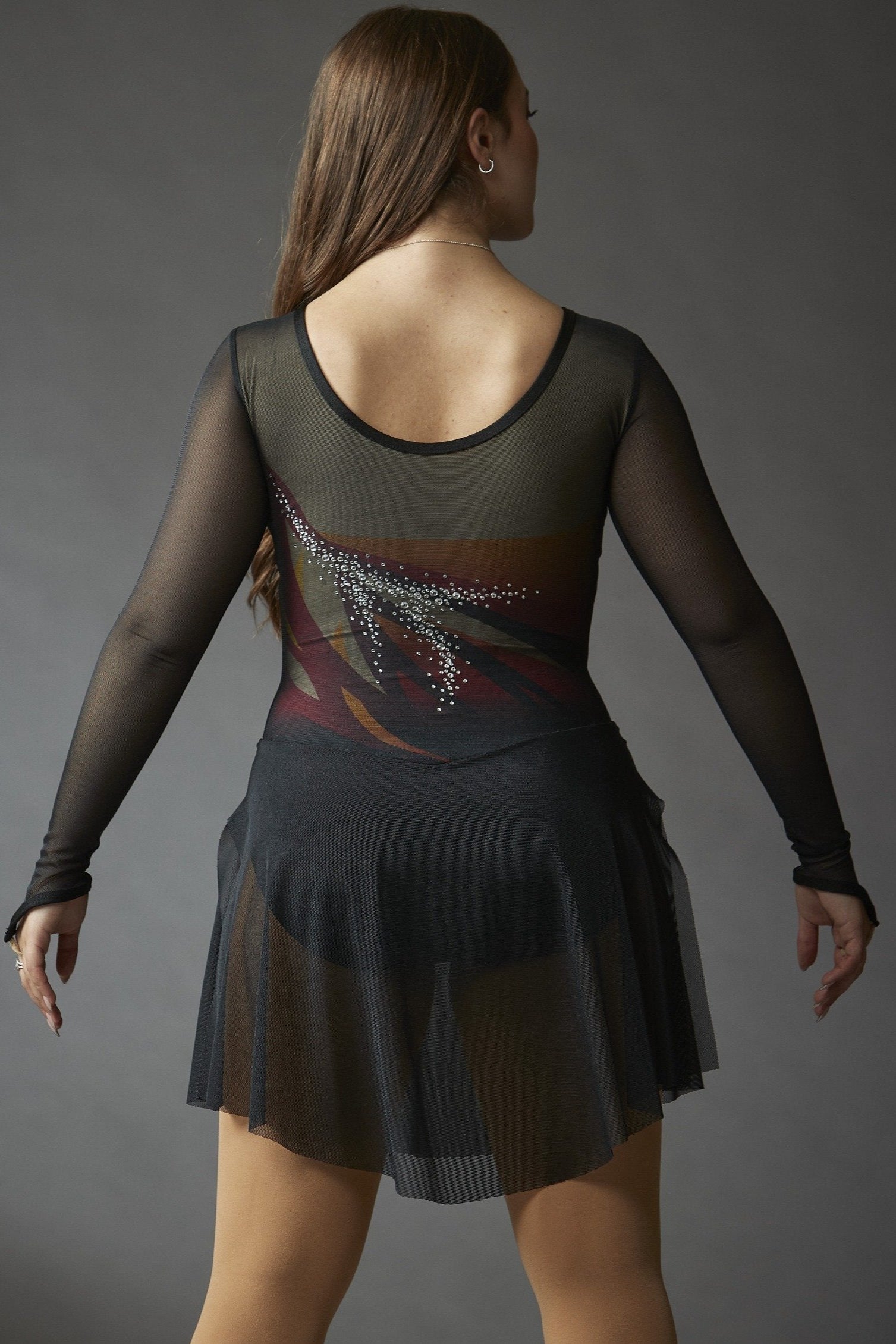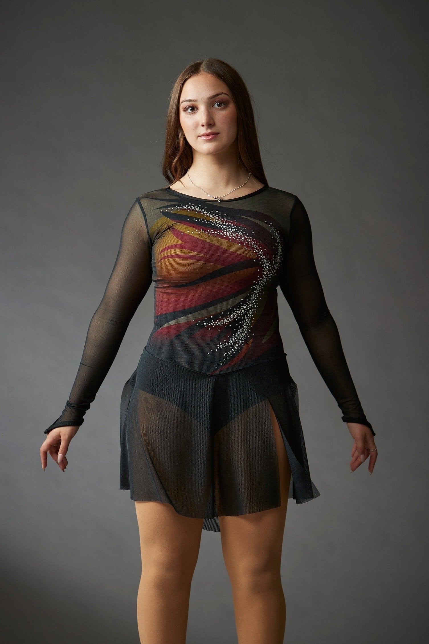 Robe de patinage artistique rouge et intemporelle, ornée de cristaux étincelants, dotée de manches longues en maille et d'une jupe en maille simple avec fentes, conçue par Elite Xpression.