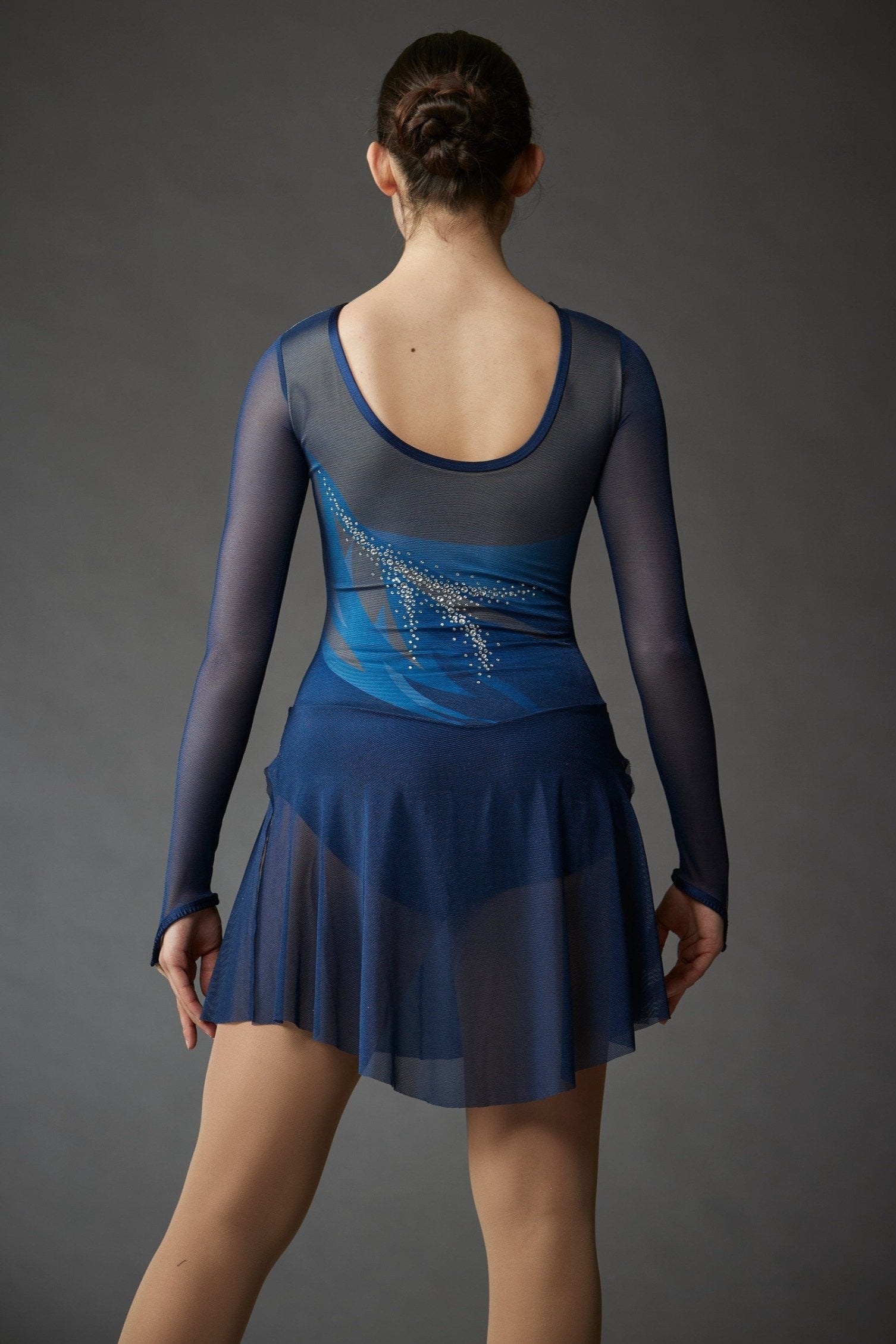 Robe de patinage artistique royale et intemporelle, ornée de cristaux étincelants, dotée de manches longues en maille et d'une jupe en maille simple avec fentes, conçue par Elite Xpression.