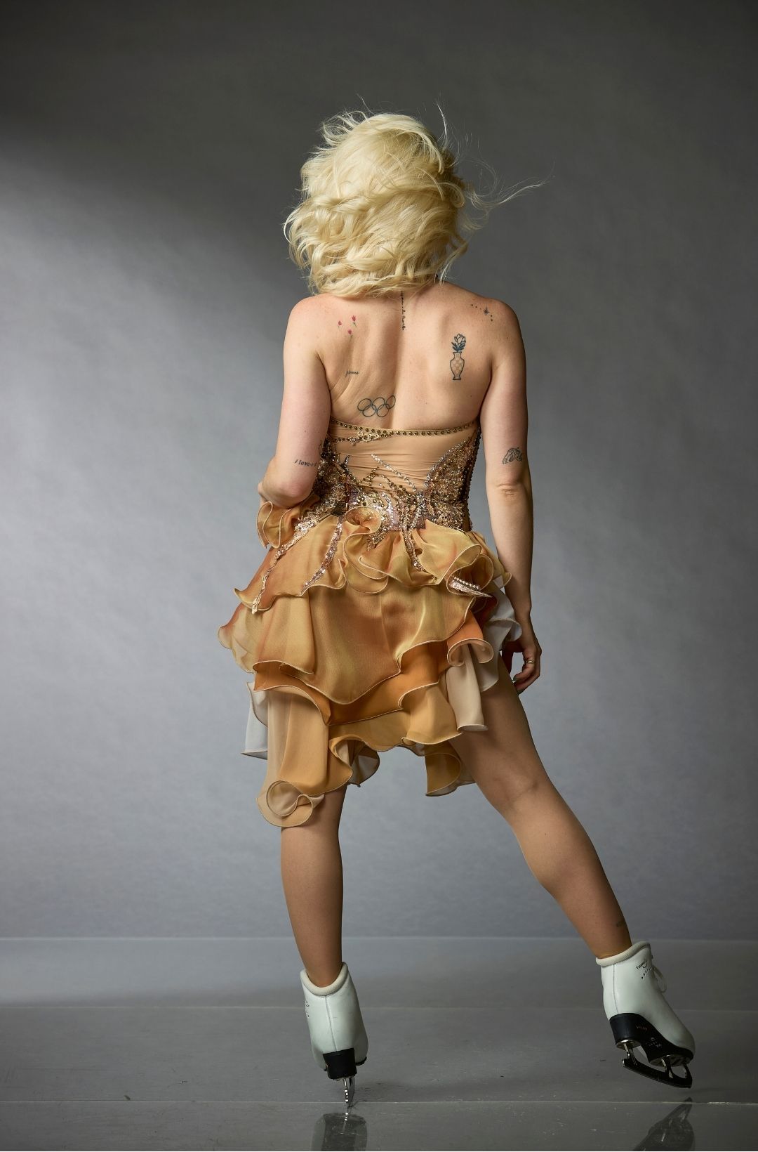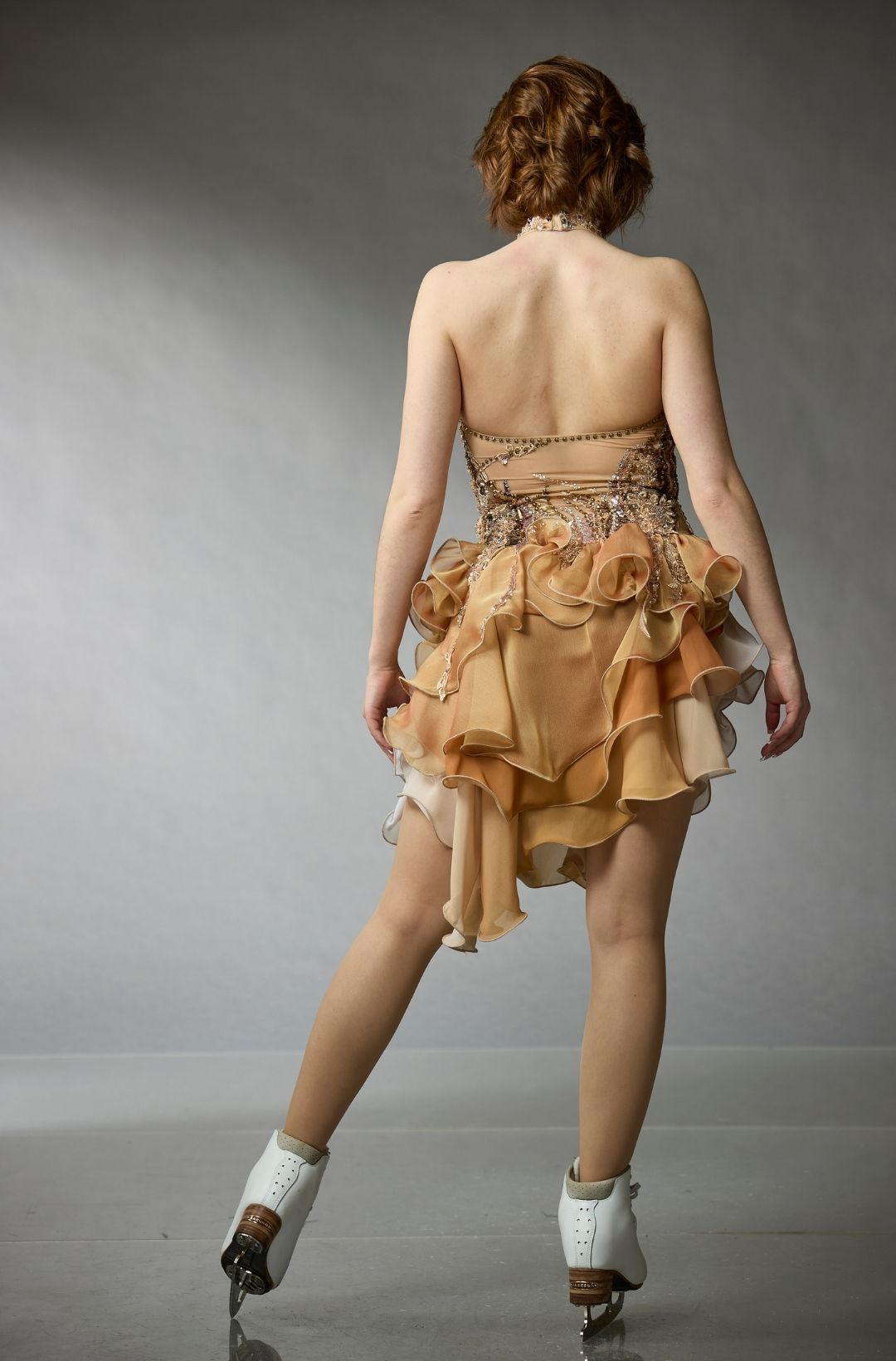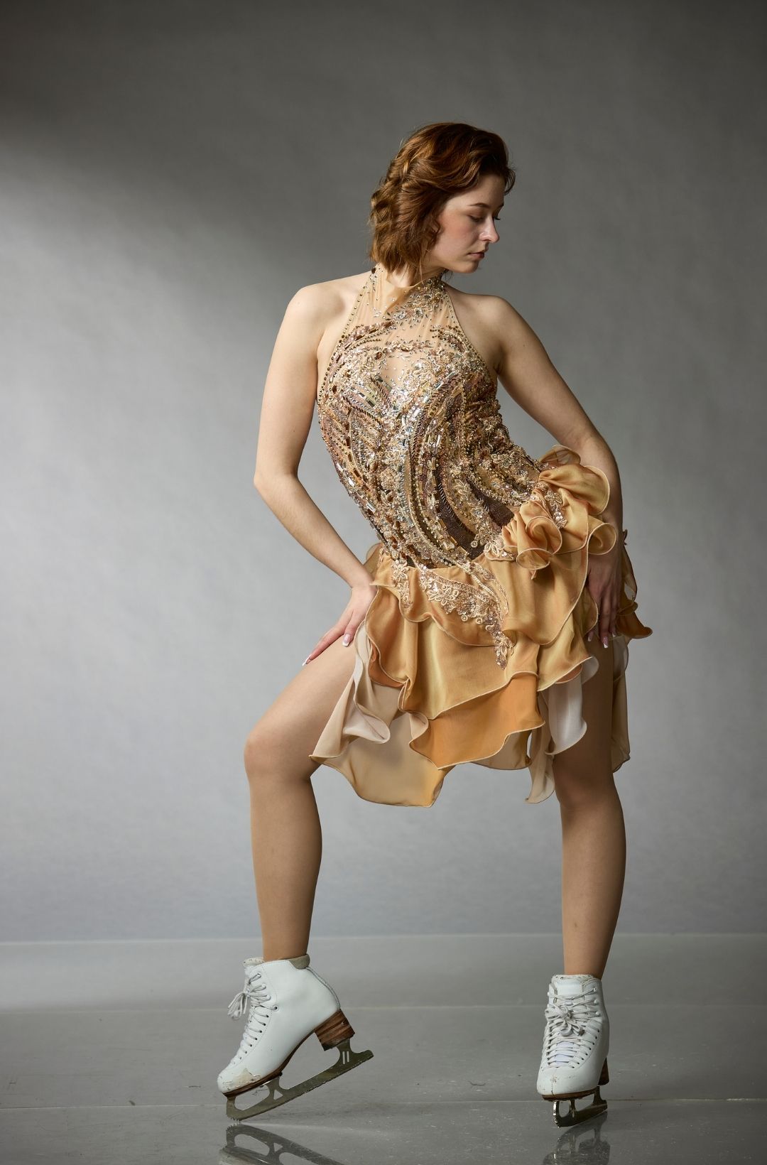 Robe de patinage artistique de la collection One of a Kind d'Elite Xpression, avec une base dorée rayonnante et des manches longues transparentes. Le corsage est orné de cristaux de différentes teintes et complété par une jupe évasée qui s'estompe subtilement en un or plus profond. Parfait pour une performance audacieuse et confiante sur la glace.