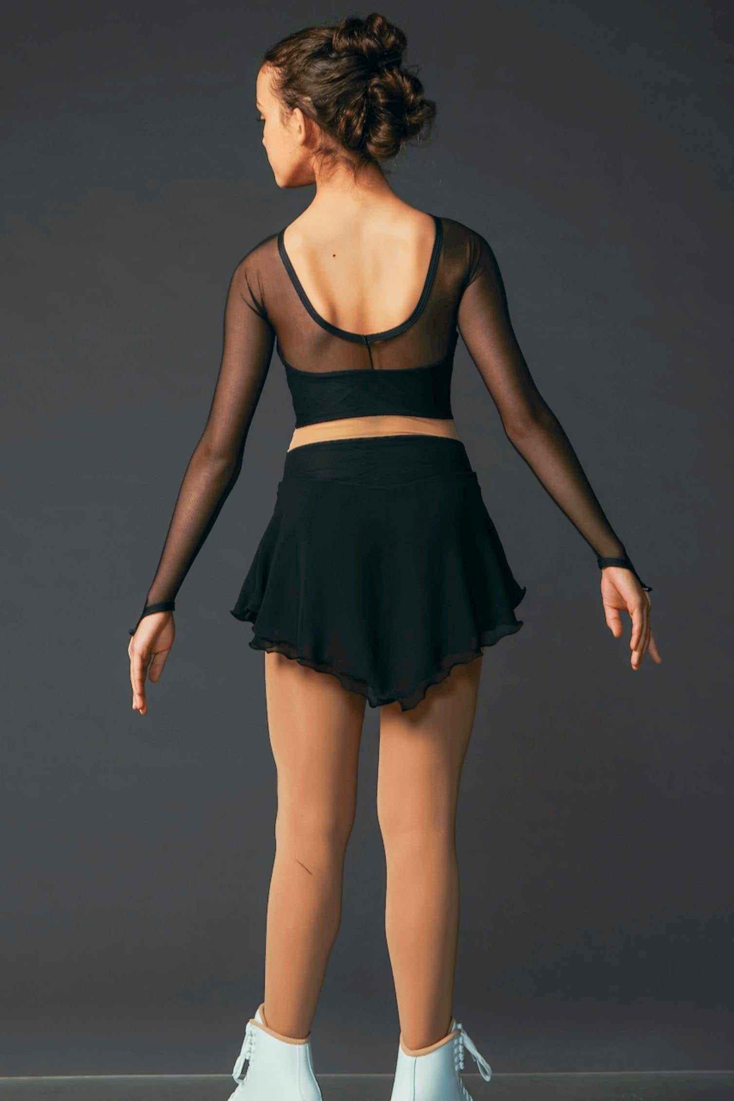 Robe noire avec corsage en filet et manches longues en filet et jupe en mousseline pour le patinage artistique par Elite Xpression