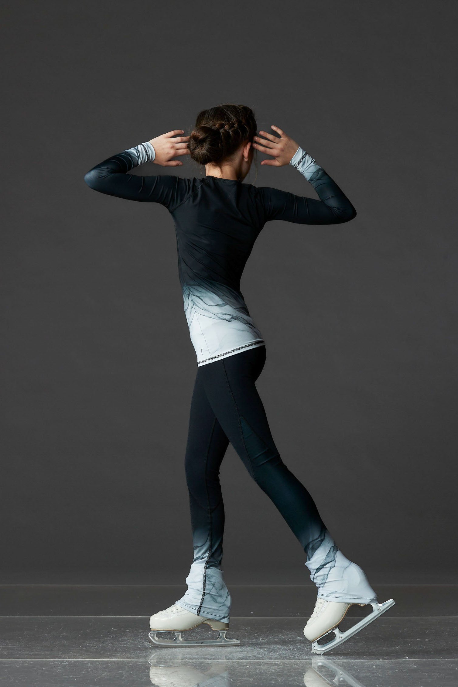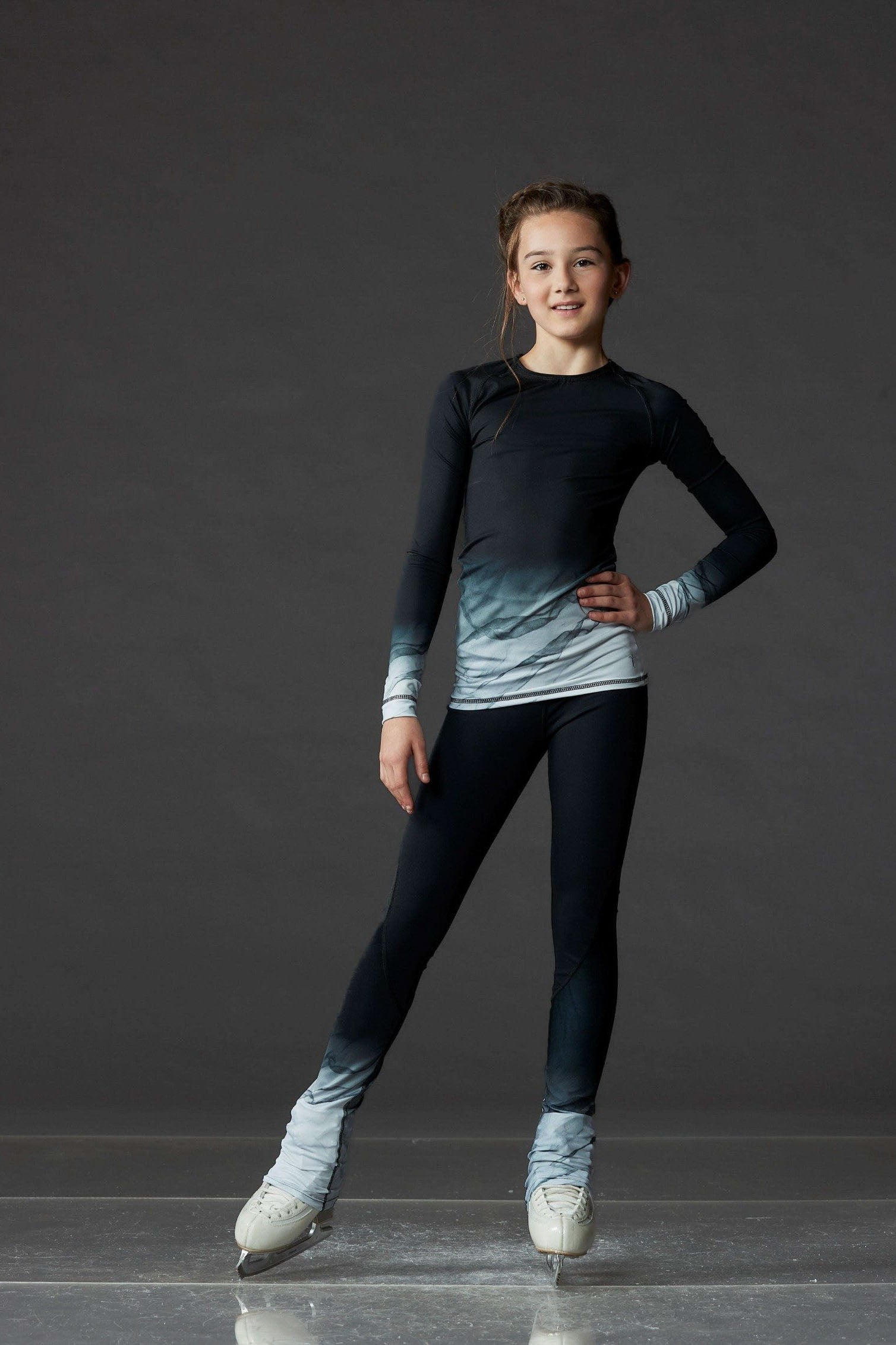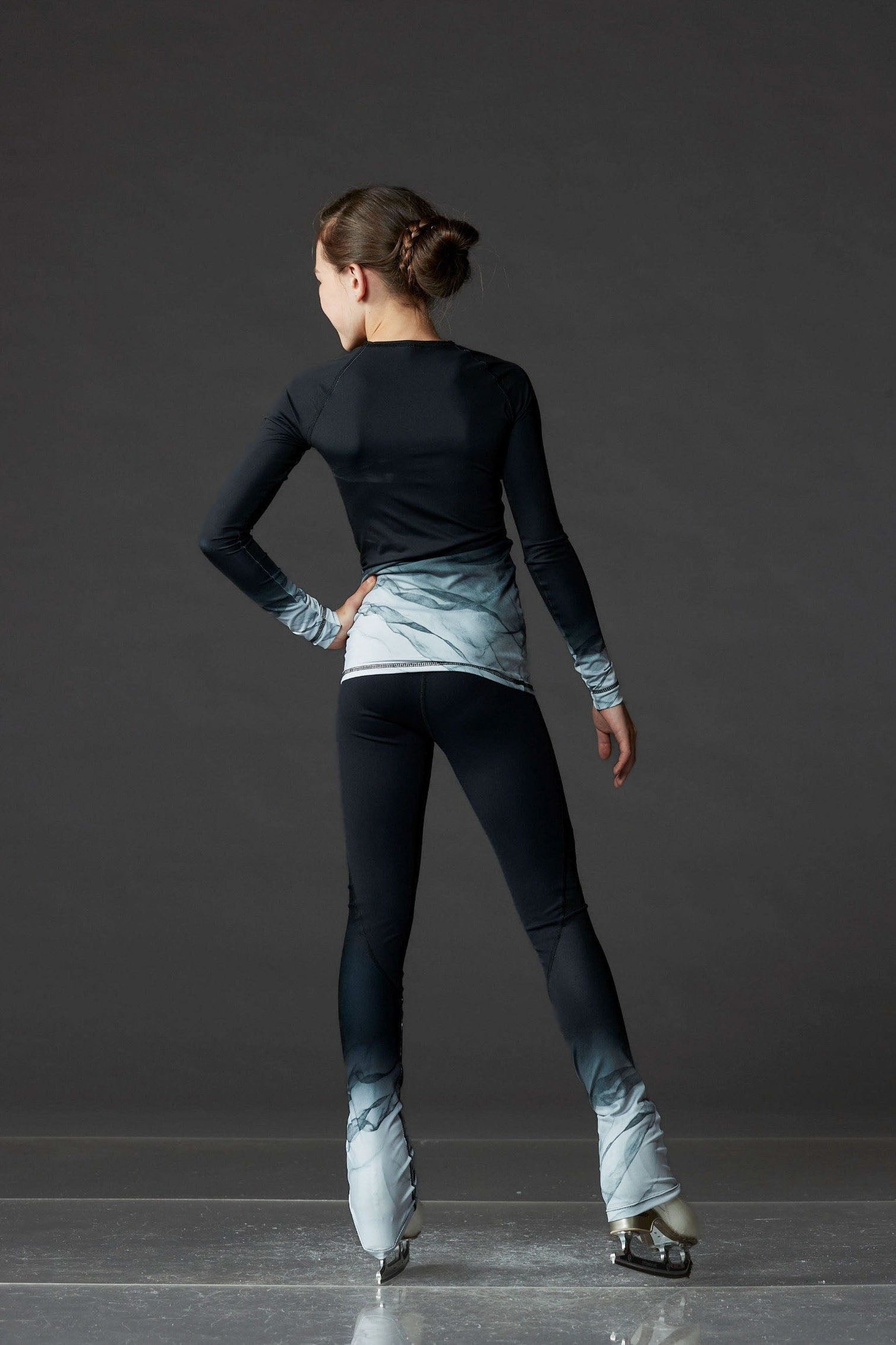 Black long-sleeve training shirt featuring marbled grey sublimated sleeves, made by Elite Xpression. Pair it with high-waist marbled grey leggings.