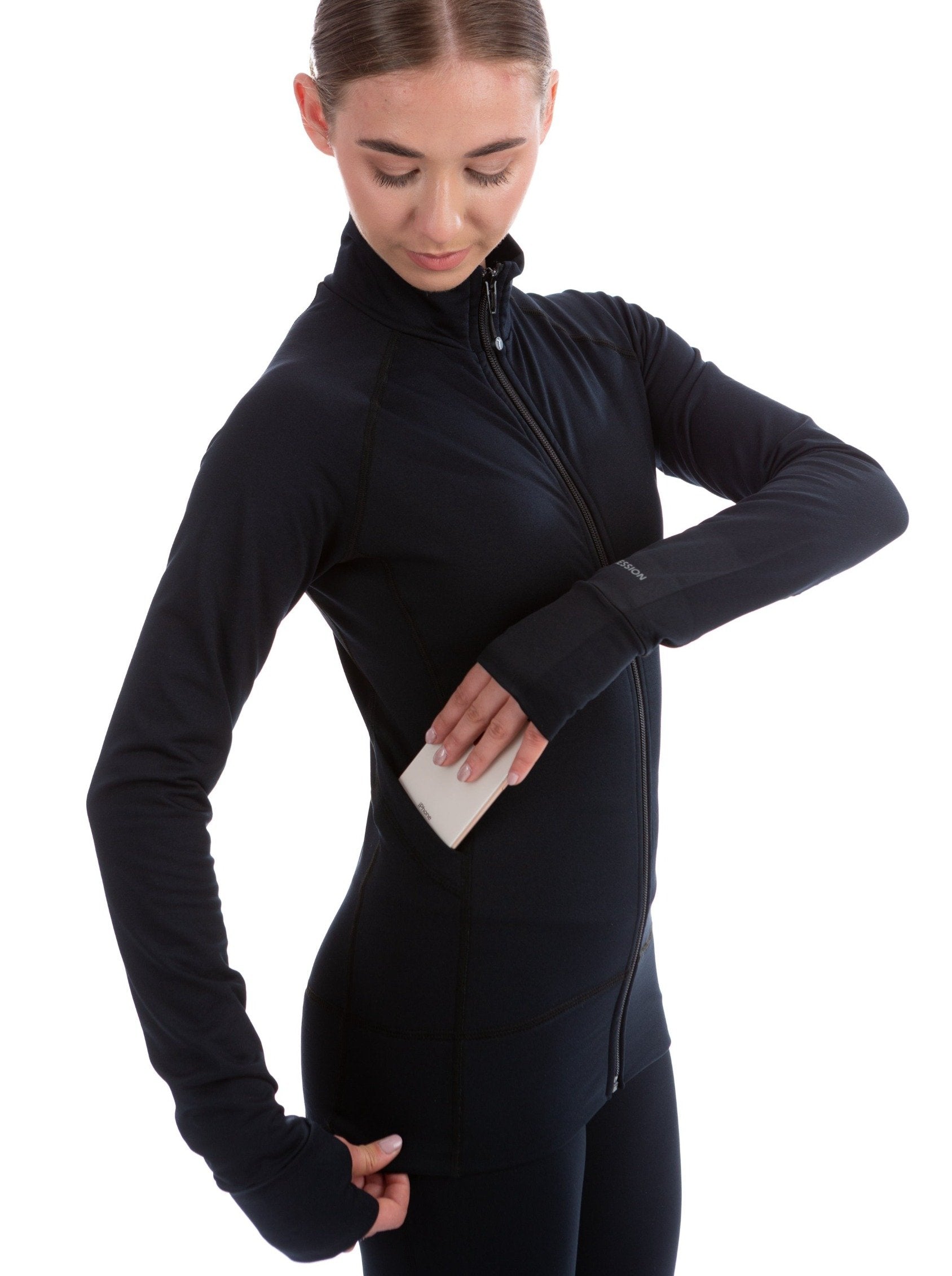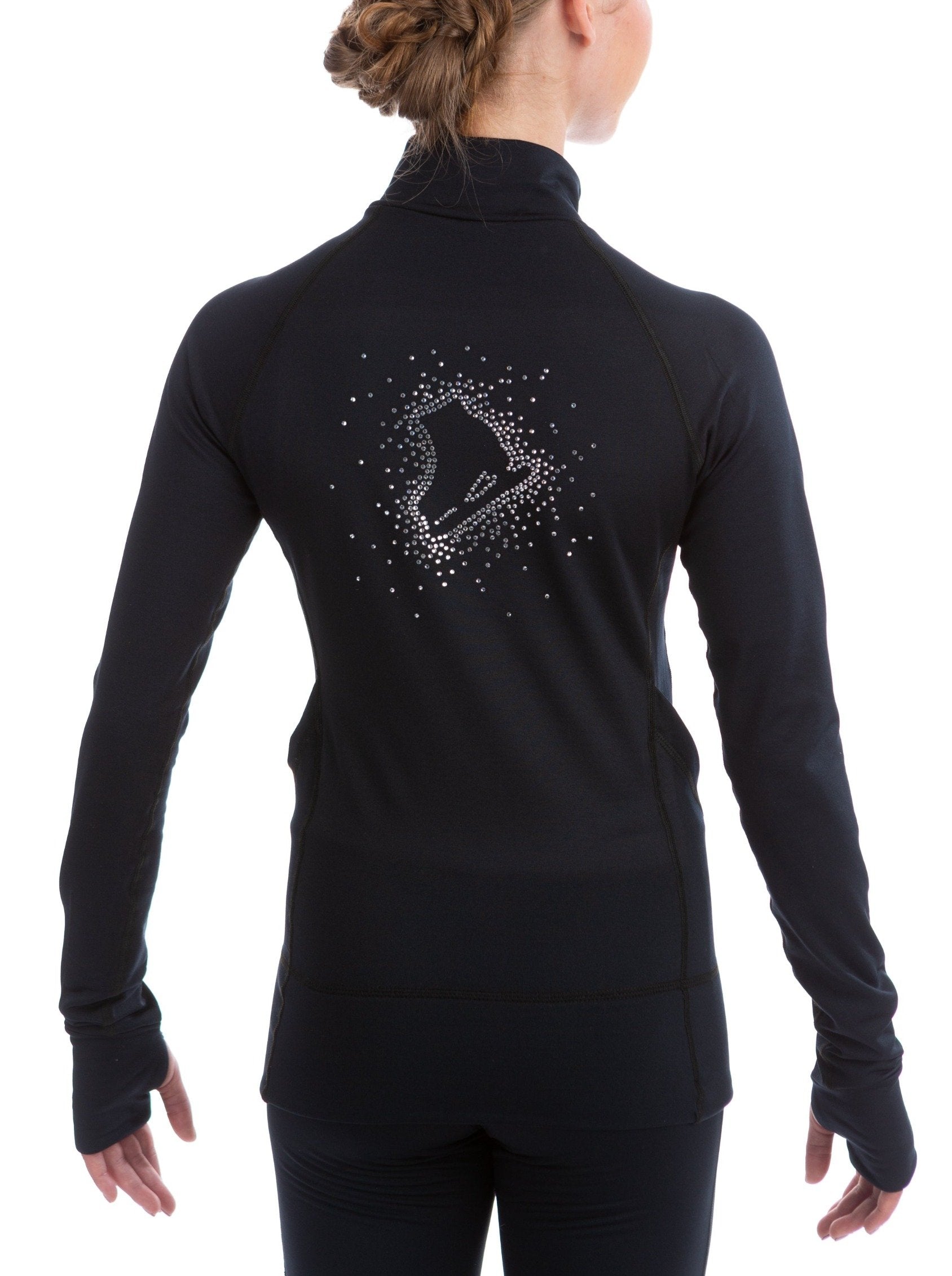 Black figure skating training jacket from Elite Xpression's Born to Skate Collection, featuring a side pocket and silver beading detail on the back.