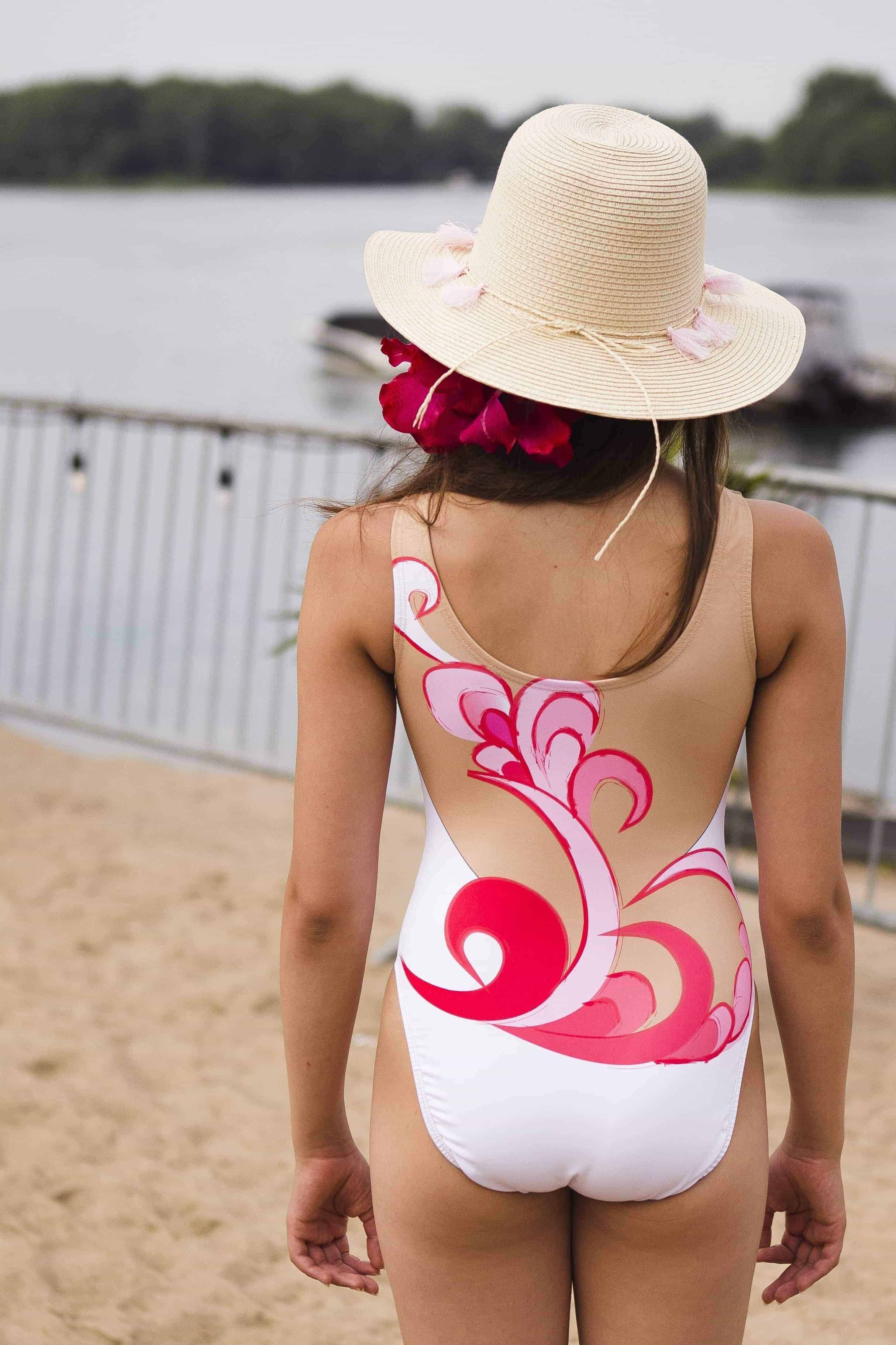 Combinaison de natation synchronisée blanche avec motifs roses délavés Elite Xpression