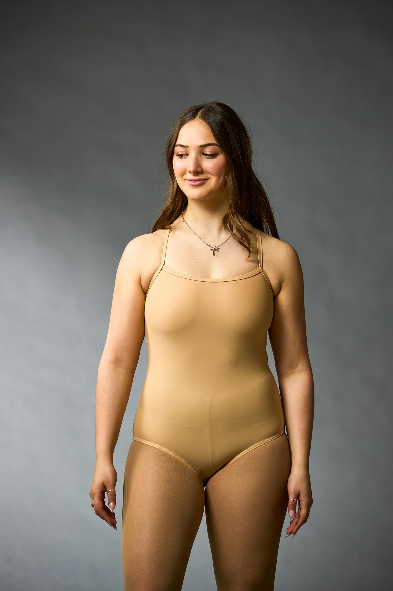 Training bodysuit in beige Supplex with straps and an open back, designed for figure skating or dance by Elite Xpression.