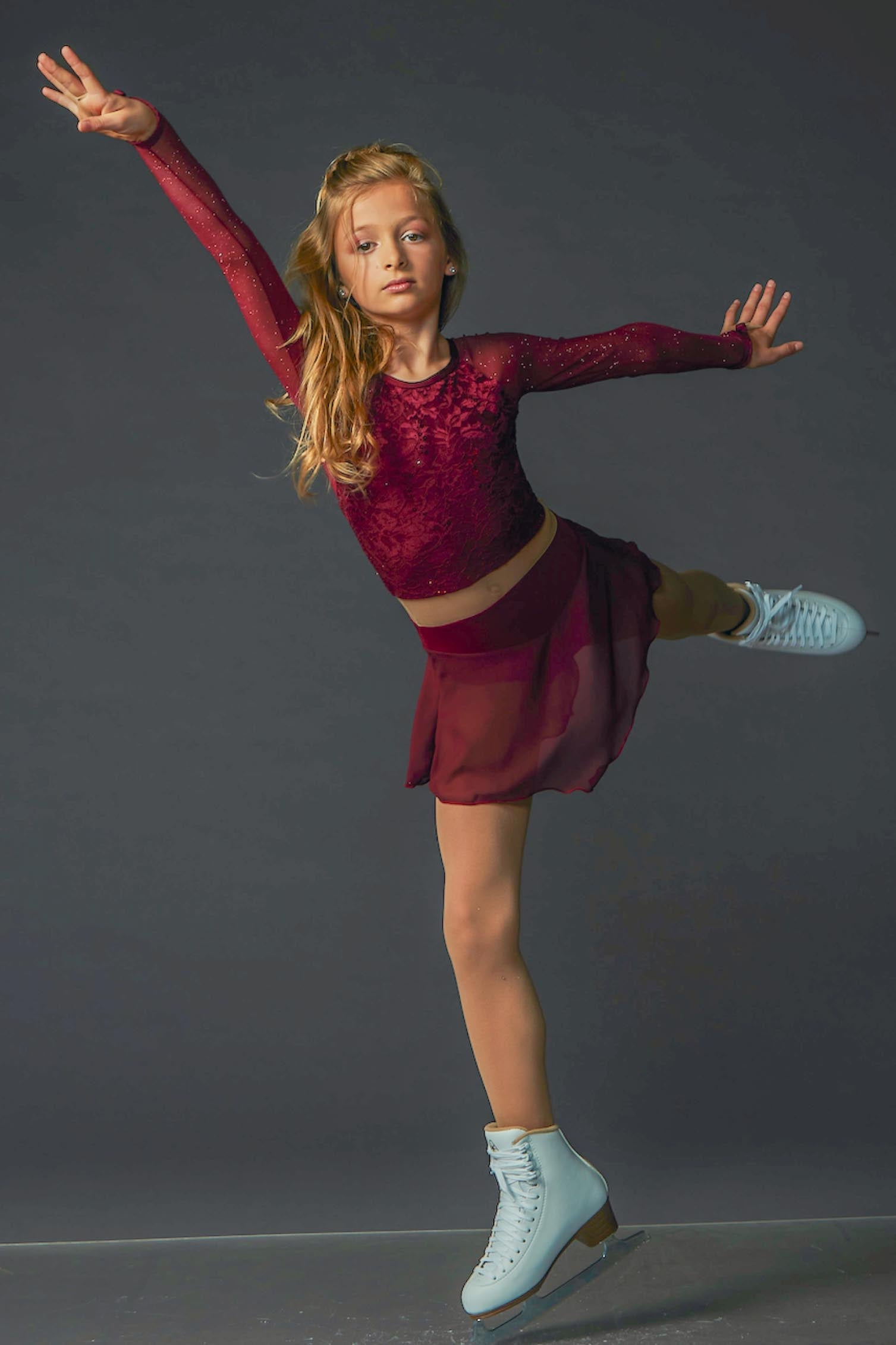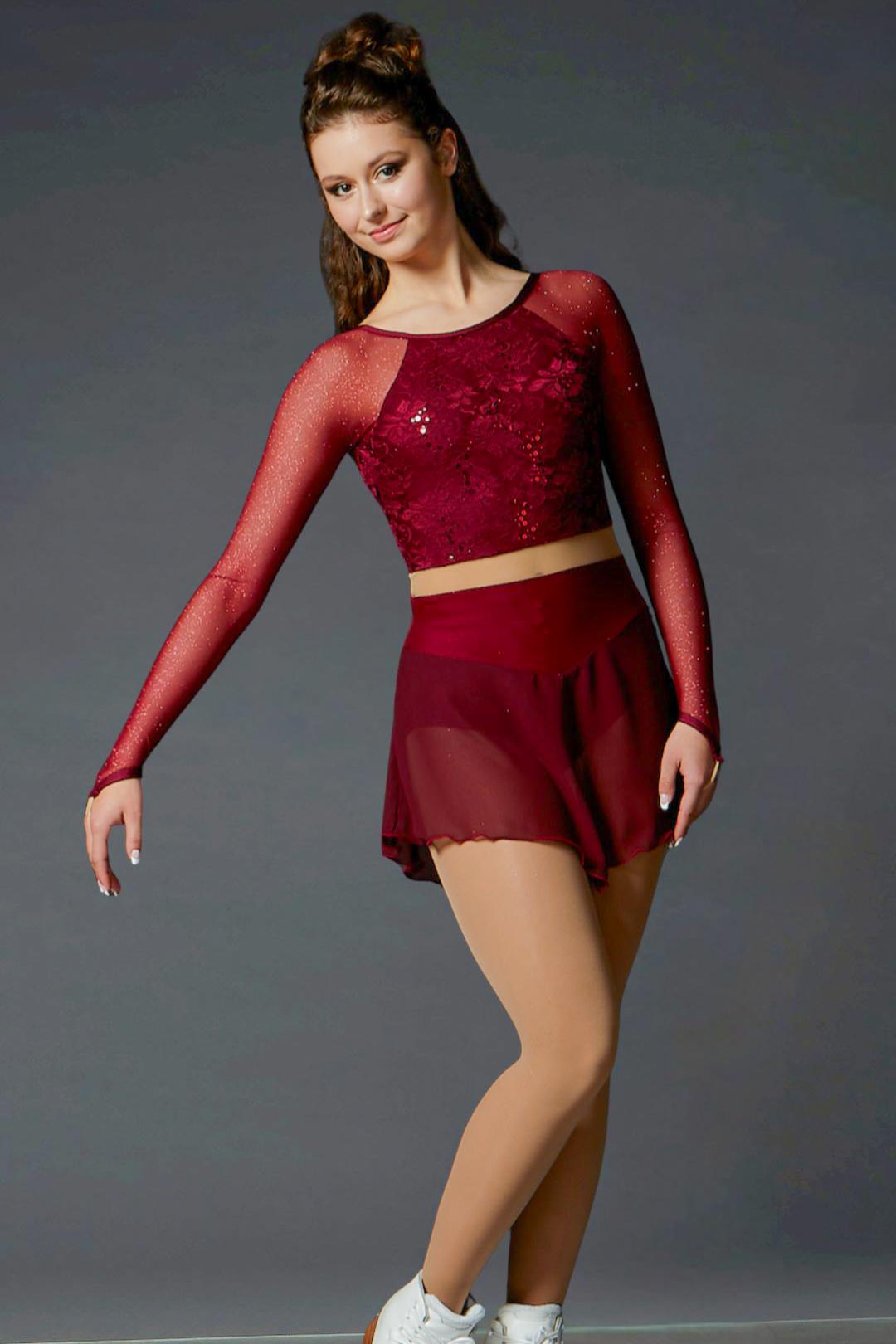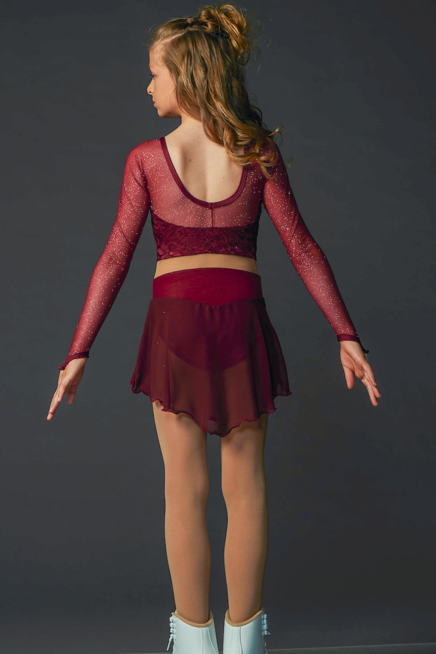 Robe bourgogne avec corsage en dentelle et manches longues en mèche et jupe en chiffon pour le patinage artistique par Elite Xpression